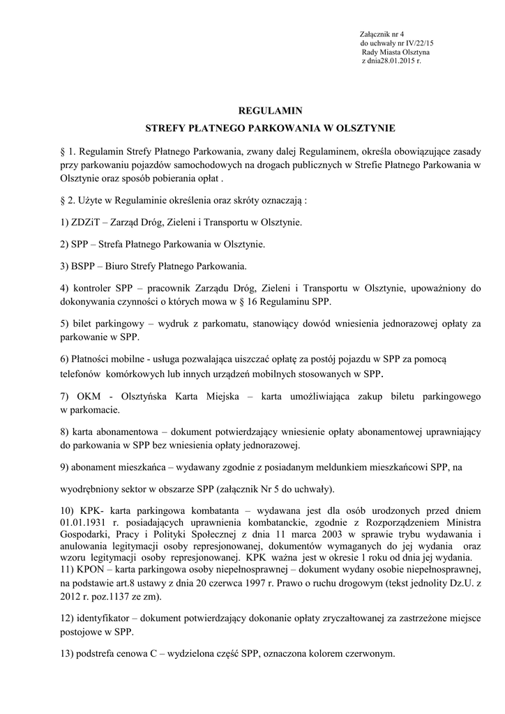 Załącznik nr 4 do uchwały nr IV/22/15 Rady Miasta Olsztyna z dnia28.01.2015 r. REGULAMIN STREFY PŁATNEGO PARKOWANIA W OLSZTYNIE § 1. Regulamin Strefy Płatnego Parkowania, zwany dalej Regulaminem, określa obowiązujące zasady przy parkowaniu pojazdów samochodowych na drogach publicznych w Strefie Płatnego Parkowania w Olsztynie oraz sposób pobierania opłat . § 2. Użyte w Regulaminie określenia oraz skróty oznaczają : 1) ZDZiT – Zarząd Dróg, Zieleni i Transportu w Olsztynie. 2) SPP – Strefa Płatnego Parkowania w Olsztynie. 3) BSPP – Biuro Strefy Płatnego Parkowania. 4) kontroler SPP – pracownik Zarządu Dróg, Zieleni i Transportu w Olsztynie, upoważniony do dokonywania czynności o których mowa w § 16 Regulaminu SPP. 5) bilet parkingowy – wydruk z parkomatu, stanowiący dowód wniesienia jednorazowej opłaty za parkowanie w SPP. 6) Płatności mobilne - usługa pozwalająca uiszczać opłatę za postój pojazdu w SPP za pomocą telefonów komórkowych lub innych urządzeń mobilnych stosowanych w SPP. 7) OKM - Olsztyńska Karta Miejska – karta umożliwiająca zakup biletu parkingowego w parkomacie. 8) karta abonamentowa – dokument potwierdzający wniesienie opłaty abonamentowej uprawniający do parkowania w SPP bez wniesienia opłaty jednorazowej. 9) abonament mieszkańca – wydawany zgodnie z posiadanym meldunkiem mieszkańcowi SPP, na wyodrębniony sektor w obszarze SPP (załącznik Nr 5 do uchwały). 10) KPK- karta parkingowa kombatanta – wydawana jest dla osób urodzonych przed dniem 01.01.1931 r. posiadających uprawnienia kombatanckie, zgodnie z Rozporządzeniem Ministra Gospodarki, Pracy i Polityki Społecznej z dnia 11 marca 2003 w sprawie trybu wydawania i anulowania legitymacji osoby represjonowanej, dokumentów wymaganych do jej wydania oraz wzoru legitymacji osoby represjonowanej. KPK ważna jest w okresie 1 roku od dnia jej wydania. 11) KPON – karta parkingowa osoby niepełnosprawnej – dokument wydany osobie niepełnosprawnej, na podstawie art.8 ustawy z dnia 20 czerwca 1997 r. Prawo o ruchu drogowym (tekst jednolity Dz.U. z 2012 r. poz.1137 ze zm). 12) identyfikator – dokument potwierdzający dokonanie opłaty zryczałtowanej za zastrzeżone miejsce postojowe w SPP. 13) podstrefa cenowa C – wydzielona część SPP, oznaczona kolorem czerwonym. 14) podstrefa cenowa Z – wydzielona część SPP, oznaczona kolorem żółtym. 15) podstrefa cenowa T – wydzielona część SPP, oznaczona kolorem zielonym. 16) parkomat – urządzenie wydające bilety parkingowe za opłatą wniesioną przy użyciu monet obiegowych lub Olsztyńskiej Karty Miejskiej 17) wezwanie – raport - dokument wystawiony przez Kontrolera SPP, wzywający do wniesienia opłaty dodatkowej za nieuiszczenie opłaty za postój w SPP. 18) opłata dodatkowa – opłata nakładana z tytułu nie wniesienia opłaty za postój w SPP. 19) IPM - Identyfikator Płatności Mobilnych - informacja o uiszczaniu opłaty za postój w SPP poprzez dokonanie płatności mobilnej, umieszczona za przednią szybą wewnątrz pojazdu w sposób widoczny dla kontrolera SPP. Rozdział 1. Przepisy Ogólne § 3. 1. Wjazd do obszaru SPP oznakowany jest znakiem D-44 „strefa płatnego parkowania”, a wyjazd D-45 „koniec strefy płatnego parkowania”. 2. Postój pojazdu w strefie płatnego parkowania – unieruchomienie pojazdu trwające dłużej niż jedną minutę nie wynikające z warunków lub przepisów ruchu drogowego w miejscach przystosowanych do postoju pojazdów na drogach publicznych i parkingach płatnych niestrzeżonych w pasach drogowych w granicach określonych znakami D-44 i D-45. 3. Obszar SPP określa załącznik nr 1 do uchwały. § 4. 1. Za postój pojazdów w SPP pobiera się opłaty w wysokości określonej w Załączniku nr 3 do uchwały. 2. Opłaty, o których mowa w ust.1, obowiązują w dni robocze, od poniedziałku do czwartku w godzinach od 8.00 do 16.00, w piątki w godzinach od 8.00 do 15.00. 3. W szczególnie uzasadnionych przypadkach (np. imprezy masowe, roboty drogowe, długotrwałe niekorzystne warunki atmosferyczne, itp.) upoważnia się Prezydenta Olsztyna do czasowego wyłączenia funkcjonowania płatnych miejsc postojowych na całym obszarze lub części strefy płatnego parkowania, po uprzednim wydaniu przez Prezydenta stosownego Zarządzenia w tej sprawie i podaniu go do publicznej wiadomości. § 5. Od opłat, o których mowa w § 4 zwolnione są pojazdy, o których mowa w art. 13 ust. 3 oraz w art. 13 ust. 3a ustawy z dnia 21 marca 1985 roku o drogach publicznych (tj. Dz.U. z 2013 r., poz. 260, ze zm.). § 6. Ustala się zerową stawkę opłat za postój w SPP dla : 1) oznakowanych pojazdów: pogotowia gazowego, energetycznego, ciepłowniczego i wodnokanalizacyjnego, pogotowie MPK, Straży Miejskiej, Centrum Krwiodawstwa i Krwiolecznictwa, podczas wykonywania obowiązków służbowych. 2) Pojazdów jednośladowych oraz trójkołowców. 3) Pojazdów przewożących lub kierowanych przez osoby niepełnosprawne, z ważną KPON, wyłożoną za przednią szybą pojazdu. 4) Pojazdów publicznej komunikacji zbiorowej, zatrzymujących się na ustalonych dla nich przystankach. 5) Osób posiadających ważną KPK. 6) Jednostek działających w ramach pomocy humanitarno-medycznej, posiadających abonament ze stawką zerową. Rozdział 2. Sposób pobierania opłat w SPP § 7. 1. Obowiązkiem kierowcy pojazdu samochodowego parkującego w SPP jest wniesienie opłaty za postój, niezwłocznie po zaparkowaniu pojazdu. 2. Niedopełnienie obowiązku określonego w ust. 1 powoduje nałożenie opłaty dodatkowej. § 8. 1. W SPP stosuje się następujące sposoby wnoszenia opłat za postój: a) jednorazowe - uiszczane poprzez wykupienie biletu parkingowego w parkomacie lub przez dokonanie płatności mobilnej obowiązującej w SPP. Opłatę za postój pojazdu wnosi się z góry za deklarowany czas postoju. Minimalny opłacony czas parkowania w SPP wynosi 30 minut; b) abo
