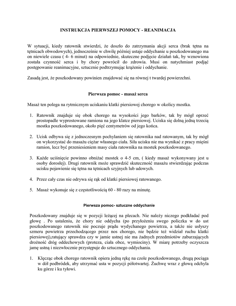 INSTRUKCJA PIERWSZEJ POMOCY - REANIMACJA W sytuacji, kiedy ratownik stwierdzi, że doszło do zatrzymania akcji serca (brak tętna na tętnicach obwodowych), jednocześnie w chwilę później ustaje oddychanie u poszkodowanego ma on niewiele czasu ( 4- 6 minut) na odpowiednie, skuteczne podjęcie działań tak, by wznowiona została czynność serca i by chory powrócił do zdrowia. Musi on natychmiast podjąć postępowanie reanimacyjne, sztucznie podtrzymując krążenie i oddychanie. Zasadą jest, że poszkodowany powinien znajdować się na równej t twardej powierzchni. Pierwsza pomoc - masaż serca Masaż ten polega na rytmicznym uciskaniu klatki piersiowej chorego w okolicy mostka. 1. Ratownik znajduje się obok chorego na wysokości jego barków, tak by mógł oprzeć prostopadle wyprostowane ramiona na jego klatce piersiowej. Uciska się dolną jedną trzecią mostka poszkodowanego, około pięć centymetrów od jego końca. 2. Ucisk odbywa się z jednoczesnym pochylaniem się ratownika nad ratowanym, tak by mógł on wykorzystać do masażu ciężar własnego ciała. Siła ucisku nie ma wynikać z pracy mięśni ramion, lecz być przeniesieniem masy ciała ratownika na mostek poszkodowanego. 3. Każde uciśnięcie powinno obniżać mostek o 4-5 cm, ( kiedy masaż wykonywany jest u osoby dorosłej). Drugi ratownik może sprawdzić skuteczność masażu stwierdzając podczas ucisku pojawienie się tętna na tętnicach szyjnych lub udowych. 4. Przez cały czas nie odrywa się rąk od klatki piersiowej ratowanego. 5. Masaż wykonuje się z częstotliwością 60 - 80 razy na minutę. Pierwsza pomoc- sztuczne oddychanie Poszkodowany znajduje się w pozycji leżącej na plecach. Nie należy niczego podkładać pod głowę . Po ustaleniu, że chory nie oddycha (po przyłożeniu swego policzka w do ust poszkodowanego ratownik nie poczuje prądu wydychanego powietrza, a także nie usłyszy szmeru powietrza przechodzącego przez nos chorego, nie będzie też widział ruchu klatki piersiowej),ratujący sprawdza czy w jamie ustnej nie ma żadnych przedmiotów zaburzających drożność dróg oddechowych (proteza, ciała obce, wymiociny). W miarę potrzeby oczyszcza jamę ustną i niezwłocznie przystępuje do sztucznego oddychania. 1. Klęcząc obok chorego ratownik opiera jedną rękę na czole poszkodowanego, drugą pociąga w dół podbródek, aby utrzymać usta w pozycji półotwartej. Żuchwę wraz z głową odchyla ku górze i ku tyłowi. 2. Po głębokim wdechu ratownik przykłada usta do ust poszkodowanego, równocześnie zamyka jego nos, wykonuje powoli, lecz mocno wdech do ust chorego. 3. Ratownik odejmuje usta od ust chorego i pozostawia mu czas na samoistne opróżnienie się płuc. 4. Częstotliwość wdechów wykonywanych przez ratownika wynosi około 12 razy na minutę. Przy prowadzeniu akcji reanimacyjnej przez jednego ratownika: po dwóch wydechach reanimujący wykonuje ucisk na mostek poszkodowanego około 30 razy. Jeśli akcja reanimacyjna jest prowadzona przez dwóch ratowników: jedna osoba prowadzi sztuczne oddychanie a druga wykonuje masaż serca, po 2 wdechach drugi ratownik wykonuje 30 uciśnięć mostka. Po około minucie reanimacji jeden z ratowników sprawdza tętno na tętnicy szyjnej, próbę taką ponawia się co 3-4 minuty. Jeżeli podczas jednej z takich prób stwierdzi się powrót akcji serca, ale nie nastąpił jeszcze powrót oddychania, należy w dalszym ciągu powtarzać sztuczne oddychanie metodą usta- usta aż do powrotu samoistnej akcji oddechowej. Jeśli mimo prób nie dochodzi do powrotu czynności serca i płuc, reanimację należy prowadzić do czasu przybycia pomocy instytucjonalnej.