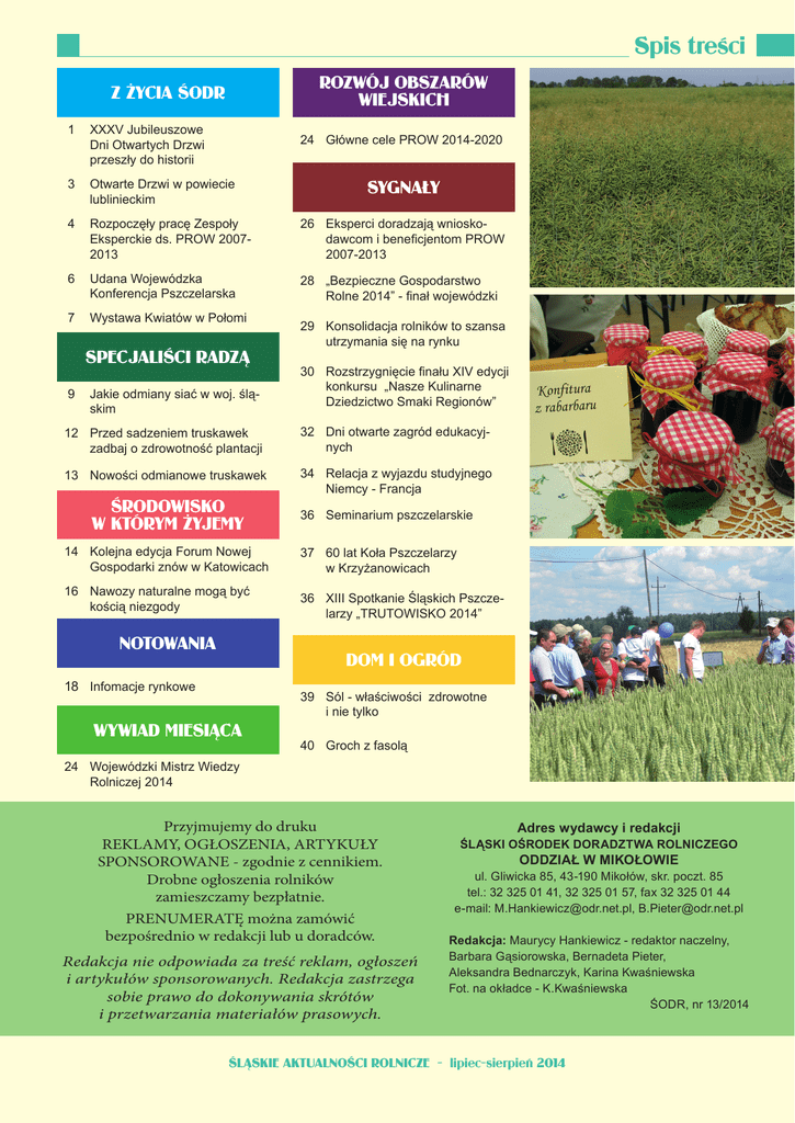 Spis treści Rozwój Obszarów Wiejskich z Życia śodr 1 XXXV Jubileuszowe Dni Otwartych Drzwi przeszły do historii 3 Otwarte Drzwi w powiecie lublinieckim 4 Rozpoczęły pracę Zespoły Eksperckie ds. PROW 20072013 26 Eksperci doradzają wnioskodawcom i beneficjentom PROW 2007-2013 6 Udana Wojewódzka Konferencja Pszczelarska 28 „Bezpieczne Gospodarstwo Rolne 2014” - finał wojewódzki 7 Wystawa Kwiatów w Połomi 24 Główne cele PROW 2014-2020 specjaliści radzą 9 Jakie odmiany siać w woj. śląskim sygnały 29 Konsolidacja rolników to szansa utrzymania się na rynku 30 Rozstrzygnięcie finału XIV edycji konkursu „Nasze Kulinarne Dziedzictwo Smaki Regionów” 12 Przed sadzeniem truskawek zadbaj o zdrowotność plantacji 32 Dni otwarte zagród edukacyjnych 13 Nowości odmianowe truskawek 34 Relacja z wyjazdu studyjnego Niemcy - Francja środowisko w którym Żyjemy 14 Kolejna edycja Forum Nowej Gospodarki znów w Katowicach 16 Nawozy naturalne mogą być kością niezgody Notowania 36 Seminarium pszczelarskie 37 60 lat Koła Pszczelarzy w Krzyżanowicach 36 XIII Spotkanie Śląskich Pszczelarzy „TRUTOWISKO 2014” DOM I OGRÓD 18 Infomacje rynkowe 39 Sól - właściwości zdrowotne i nie tylko WYWIAD MIESIĄCA 40 Groch z fasolą 24 Wojewódzki Mistrz Wiedzy Rolniczej 2014 Przyjmujemy do druku REKLAMY, OGŁOSZENIA, ARTYKUŁY SPONSOROWANE - zgodnie z cennikiem. Drobne ogłoszenia rolników zamieszczamy bezpłatnie. PRENUMERATĘ można zamówić bezpośrednio w redakcji lub u doradców. Redakcja nie odpowiada za treść reklam, ogłoszeń i artykułów sponsorowanych. Redakcja zastrzega sobie prawo do dokonywania skrótów i przetwarzania materiałów prasowych. Adres wydawcy i redakcji ŚLĄSKI OŚRODEK DORADZTWA ROLNICZEGO ODDZIAŁ W MIKOŁOWIE ul. Gliwicka 85, 43-190 Mikołów, skr. poczt. 85 tel.: 32 325 01 41, 32 325 01 57, fax 32 325 01 44 e-mail: [email protected], [email protected] Redakcja: Maurycy Hankiewicz - redaktor naczelny, Barbara Gąsiorowska, Bernadeta Pieter, Aleksandra Bednarczyk, Karina Kwaśniewska Fot. na okładce - K.Kwaśniewska ŚODR, nr 13/2014 ŚLĄSKIE AKTUALNOŚCI ROLNICZE - lipiec-sierpień 2014 Spis treści Finał XIV edycji konkursu „Nasze Kulinarne Dziedzictwo - Smaki Regionów” Wojewódzki finał XIV edycji ogólnopolskiego konkursu „Nasze Kulinarne Dziedzictwo - Smaki Regionów”, odbył się 7 czerwca 2014 r. na Placu Biegańskiego w Częstochowie, podczas VIII Festiwalu Sztuki Kulinarnej „Aleja Dobrego Smaku”. Organizatorem centralnym konkursu była Polska Izba Produktu Regionalnego i Lokalnego. Partnerem merytorycznym i organizacyjnym był Urząd Marszałkowski Województwa Śląskiego oraz Śląski Ośrodek Doradztwa Rolniczego w Częstochowie. Każdego roku na konkursie „Nasze Kulinarne Dziedzictwo – Smaki Regionów” pojawiają się produkty tradycyjne, niekiedy już zapomniane, a które mają szansę być na nowo odkryte, popularne i stać się kulinarnymi wizytówkami swoich regionów. Sprzyja to aktywizacji lokalnych społeczności. Do Konkursu przystapili lokalni producenci, KGW, gospodarstwa agroturystyczne i restauratorzy. Konkurs składał się z 2 częsci. Pierwsza - „na najlepszy regionalny produkt zywnościowy” i druga „na najlepszą potrawę regionalną”. W konkursie „na najlepszy produkt żywnościowy” zgłoszono 35 produktów, ocenianych przez komisje w 4 kategoriach: produkty pochodzenia zwierzęcego, produkty pochodzenia roślinnego, napoje oraz inne produkty regionalne. Kolejna komisja oceniała 7 rywalizujących ze sobą ekip w części „na najlepszą potrawę regionalną” (przystawka lub zupa i danie główne). Komisje nie tylko oceniały walory smakowe ale tradycyjne metody wytwarzania, zgodność z tradycją i związek z regionem. Wyniki konkursu na „najlepszy regionalny produkt żywnościowy” Produkty pochodzenia zwierzęcego Podkategorie: • Produkty i przetwory mięsne - Produkty pochodzenia roślinnego Podkategorie: • Przetwory owocowe - I nagroda Alicja Podgórska, za konfiturę z rabarbaru. I nagroda (nagrody równorzędne): ZPH DOBROPOL, za kiełbasę baranią suchą ZPU Zakład Mięsny Pniów, Tadeusz Marciniszyn, za kiełbasę rzeźnika z „Pniowskiego Spichlerza” Rzeźnictwo-Wędliniarstwo Kubica Czesław, za salceson swojski (preswurst). • Produkty mleczne - I nagroda (nagrody równorzędne): OSM w Krzepicach, za masło krzepickie Lidia Jędruszek, za „krasulową chmurkę” - ser biały. Wyróżnienia Zofia Bojda, za wątróbkę drobiową do chleba, Anna Świącik, za Soporek z Jaskrowa, Anna Ptasińska, za ser twardy biały. ŚLĄSKIE AKTUALNOŚCI ROLNICZE - lipiec-sierpień 2014 Spis treści • Przetwory zbożowe: I nagroda (nagrody równorzędne): - Lidia Jędruszek, za „bochen wiejski” – chleb żytni. - Teresa Podruczna, za chleb razowy z czarnuszką. • Wyroby cukiernicze: I nagroda (nagrody równorzędne): - Piekarnia-Cukiernia „Łubowski”, za makrony. - Consonni Bartelak s.c., za babkę staropolską maślaną. Wyróżnienia: - Daniela Mońka, za chleb żytni z dynią na zakwasie, - Zofia Miłoch, za „Wela kostkowskie” – serowe oponki. Napoje regionalne Podkategorie: • Napoje bezalkoholowe: I nagroda - Agroturystyka „Karina” Karina i Paweł Poloczek, za herbatę z zielin. • Napoje alkoholowe: I nagroda (nagrody równorzędne): - Tłocznia u Mazurkiewiczów Elżbieta Mazurkiewicz, za cydr z Jury. - Winnica Mnich Roman Gabryś, za wino Mnich. - Gospodarstwo Agroturystyczne RANCZO Kornelia i Krystian Kiełbasa, za nalewkę z kwiatów czarnego bzu. Wyróżnienia: - Hotel Browar CzenstochoviA, za piwo CzenstochoviA Jasne - Alicja Podgórska, za nalewkę z „dziadów” - Bogusław Krótki, za nalewkę z owoców czarnego bzu (czorny bzyk). - - - - - NominacjE do nagrody „Perła 2014” • W części „produktowej” konkursu otrzymali: - Tłoczony sok jabłkowy z Jury - Tłocznia u Mazurkiewiczów. - Kiełbasa barania sucha 