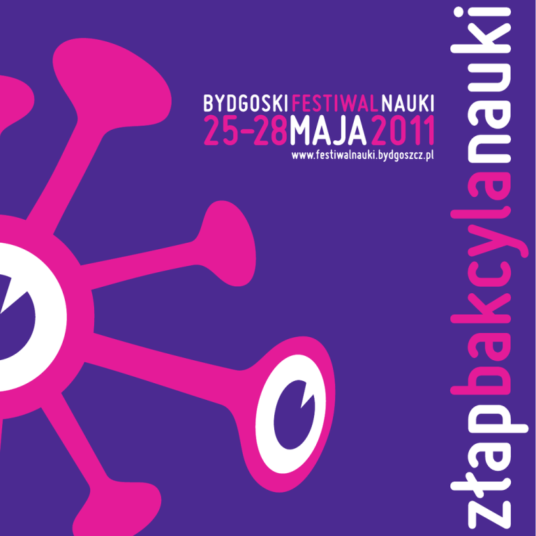 Publikacja sfinansowana ze środków Ministerstwa Nauki i Szkolnictwa Wyższego i Samorządu Województwa Kujawsko-Pomorskiego W dniach 25-28 maja 2011 roku odbyła się druga edycja Bydgoskiego Festiwalu Nauki, zorganizowanego przez trzy bydgoskie uczelnie wyższe: Uniwersytet Kazimierza Wielkiego, Uniwersytet Technologiczno-Przyrodniczy oraz Wyższą Szkołę Gospodarki. Inicjatywa Bydgoskiego Festiwalu Nauki zrodziła się na Uniwersytecie Kazimierza Wielkiego. Wydaje się, iż wynikała niejako naturalnie ze szczególnej misji, jaką ma do spełnienia w regionie uniwersytet szerokoprofilowy. Misja ta, z grubsza rzecz ujmując, obok działalności naukowo-dydaktycznej, obejmuje niejako dwa główne działania, a mianowicie – z jednej strony promocję w regionie edukacji otwartej, a więc takiej, która ma na celu popularyzację nauki wśród szerokiej rzeszy społeczeństwa, z drugiej promocję szeroko rozumianej kultury. Uniwersytet Kazimierza Wielkiego, wspólnie z innymi ważnymi uczelniami Bydgoszczy, uczestniczy więc aktywnie w popularyzowaniu nauki i upowszechnianiu jej w atrakcyjnej formie. Uczelnie naszego miasta prześcigają się w pomysłach na przybliżenie tematyki i osiągnięć prowadzonych przez siebie badań naukowych oraz przedstawieniu ich szerokiej grupie społecznej w atrakcyjnej i zrozumiałej formie, nie po to, aby ze sobą w jakimś sensie konkurować, ale po to, aby wspólnymi siłami propagować edukację, która jest przecież jednym z elementów współczesnej kultury. Należałoby się w związku z tym zastanowić, czy oferta organizowanego w Bydgoszczy już po raz drugi Festiwalu pozwala na poznanie naukowych rozwiązań wielu problemów i interpretacji zjawisk życia codziennego, czy zwraca uwagę na społeczną przydatność badań naukowych prowadzonych w licznych laboratoriach www.festiwalnauki.bydgoszcz.pl i instytutach naukowych bydgoskich uczelni. Niezwykle ważne dla organizatorów Bydgoskiego Festiwalu Nauki jest również i to, czy ów kontakt z nauką, który w jakimś stopniu imprezy festiwalowe umożliwiają, rozbudza chęć zdobywania i pogłębiania wiedzy z różnych dziedzin nauki. Odpowiedzią na tak sformułowane pytania może być bardzo liczny udział mieszkańców Bydgoszczy w eksperymentach, prelekcjach, warsztatach czy bardzo często również edukacyjnych zabawach. Jeżeli w przyszłości okaże się, iż organizowany przez nas Bydgoski Festiwal Nauki ułatwia jego uczestnikom bardziej efektywne rozumienie i przyswajanie wiedzy, a także pozwala na kształtowanie ich samodzielności intelektualnej, wówczas utwierdzimy się w przekonaniu, iż ogromny trud, jakiego niewątpliwie wymaga organizacja Festiwalu, w pełni się opłaca. prof. dr hab. Janusz Ostoja-Zagórski Prorektor ds. Nauki i Współpracy z Zagranicą UKW Przewodniczący Rady Programowej BFN Bydgoski Festiwal Nauki Rada Programowa Bydgoskiego Festiwalu Nauki UNIWERSYTET KAZIMIERZA WIELKIEGO prof. dr hab. Janusz Ostoja-Zagórski, Prorektor ds. Nauki i Współpracy z Zagranicą dr Maria Sobieszczyk mgr inż. Grażyna Laskowska mgr Aniela Bekier-Jasińska KOORDYNATOR DNIA NIEMIECKIEGO dr hab. Albert Kotowski prof. nadzw. UKW BIURO ORGANIZACYJNE mgr Agata Pluskota mgr Katarzyna Lutkowska UNIWERSYTET TECHNOLOGICZNO-PRZYRODNICZY prof. dr hab. inż. Wojciech Kapelański, Prorektor ds. Organizacji i Rozwoju mgr Jakub Kucharski mgr Agnieszka Dambecka WYŻSZA SZKOŁA GOSPODARKI dr inż. Ryszard Maciołek, prof. WSG, Prorektor ds. Nauki i Współpracy dr Maria Marszałkowska Danuta Kubiś www.festiwalnauki.bydgoszcz.pl Bydgoski Festiwal Nauki Patronat honorowy wojewoda kujawsko-pomorski prezydent miasta bydgoszczy Instytucje wspierające Patron medialny Sponsorzy Bydgoski Festiwal Nauki Bydgoszcz Bydgoszcz – niemal 400-tysięczna metropolia, położona nad Kanałem Bydgoskim, w malowniczym zakolu rzeki Brdy, u ujścia do Wisły. Jej interesująca architektura, szczególnie związana z wodą, kojarzona jest przez wielu z obrazem miast holenderskich. Dla innych Bydgoszcz to „mały Berlin”, jak ją dawniej określano, ze względu na wspaniałe przykłady eklektycznej zabudowy XIX w., liczne parki, skwery, które powstały z inspiracji czy też zostały zaprojektowane przez samych architektów berlińskich. Wielkomiejski gwar ulic, placów miesza się tutaj z akademickim charakterem miasta. Ponad 44 tys. rzesza studentów swoją młodzieńczą energią i kreatywnością tworzy obraz miasta, w jakim chce się studiować i mieszkać. Liczne festiwale, kina, kluby muzyczne jednym słowem wielobarwna kultura i sport na poziomie europejskim jak magnes przyciągają tych, którzy lubią aktywność i chcą czerpać z ducha tego miasta to, co ulotne, piękne i niezapomniane. www.festiwalnauki.bydgoszcz.pl Bydgoski Festiwal Nauki Kujawsko-Pomorskie związana z postacią wybitnego astronoma Mikołaja Kopernika, ale również współcześnie wykonuje się badania astronomiczne na światowym poziomie. W znajdującym się w Piwnicach (kilkanaście kilometrów od Torunia) obserwatorium astronomicznym pracują największe teleskopy w Polsce – 90 cm teleskop Schmidta-Cassegraina oraz 32 m radioteleskop. Toruńskie planetarium jest jednym z największych i najnowocześniejszych planetariów w kraju. Wysoki poziom merytoryczny prezentowanych seansów oraz walory wizualno-akustyczne sprawiają, że od wielu lat toruńskie planetarium jest wielką atrakcją turystyczną regionu. Nasz region, w którym powstaje sieć 14 obserwatoriów astronomicznych może być śmiało nazywany „centrum polskiej astronomii”. Budynki astrobaz mają kształt typowego obserwatorium astronomicznego – powstały na planie koła o średnicy około dziesięciu metrów. W obserwatorium o wysokości około ośmiu metrów znalazły się trzy funkcjonalne kondygnacje: sterownia ze stanowiskami komputerowymi, toaleta i magazynki na sprzęt, platforma teleskopu z kopułą oraz taras obserwacyjny. 10 Kujawsko-Pomors