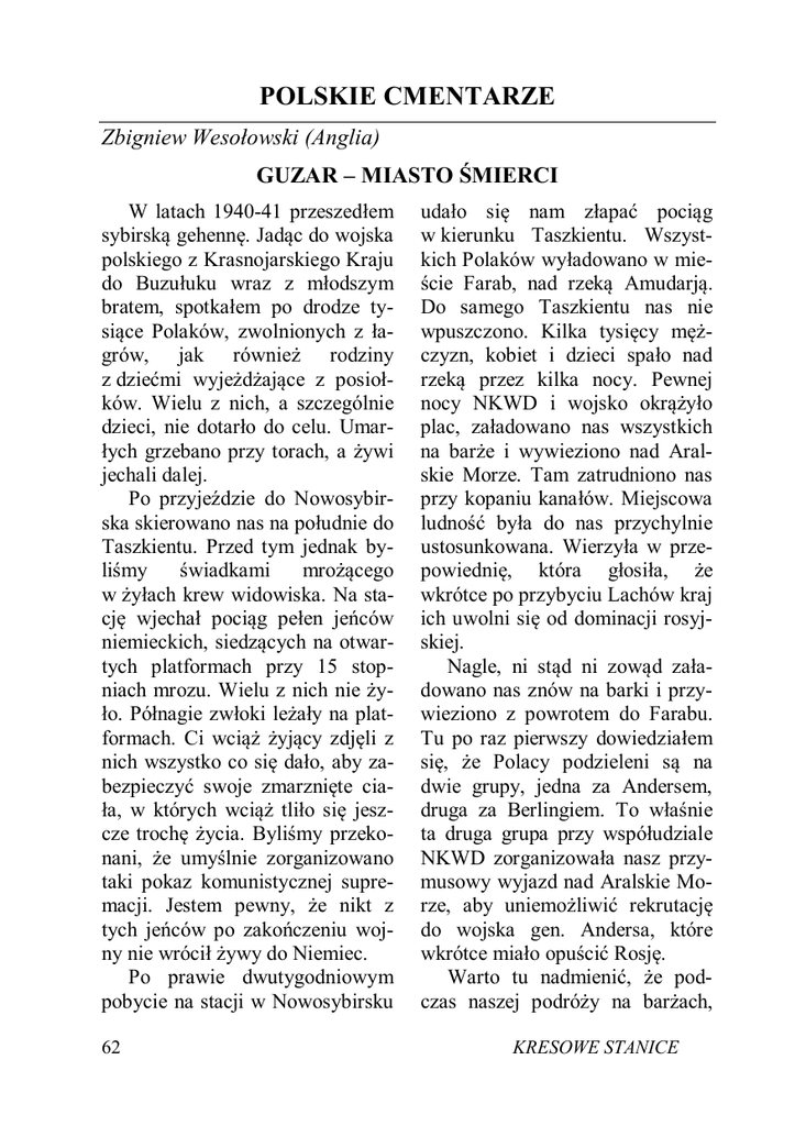 POLSKIE CMENTARZE Zbigniew Wesołowski (Anglia) GUZAR – MIASTO ŚMIERCI W latach 1940-41 przeszedłem sybirską gehennę. Jadąc do wojska polskiego z Krasnojarskiego Kraju do Buzułuku wraz z młodszym bratem, spotkałem po drodze tysiące Polaków, zwolnionych z łagrów, jak również rodziny z dziećmi wyjeżdżające z posiołków. Wielu z nich, a szczególnie dzieci, nie dotarło do celu. Umarłych grzebano przy torach, a żywi jechali dalej. Po przyjeździe do Nowosybirska skierowano nas na południe do Taszkientu. Przed tym jednak byliśmy świadkami mrożącego w żyłach krew widowiska. Na stację wjechał pociąg pełen jeńców niemieckich, siedzących na otwartych platformach przy 15 stopniach mrozu. Wielu z nich nie żyło. Półnagie zwłoki leżały na platformach. Ci wciąż żyjący zdjęli z nich wszystko co się dało, aby zabezpieczyć swoje zmarznięte ciała, w których wciąż tliło się jeszcze trochę życia. Byliśmy przekonani, że umyślnie zorganizowano taki pokaz komunistycznej supremacji. Jestem pewny, że nikt z tych jeńców po zakończeniu wojny nie wrócił żywy do Niemiec. Po prawie dwutygodniowym pobycie na stacji w Nowosybirsku 62 udało się nam złapać pociąg w kierunku Taszkientu. Wszystkich Polaków wyładowano w mieście Farab, nad rzeką Amudarją. Do samego Taszkientu nas nie wpuszczono. Kilka tysięcy mężczyzn, kobiet i dzieci spało nad rzeką przez kilka nocy. Pewnej nocy NKWD i wojsko okrążyło plac, załadowano nas wszystkich na barże i wywieziono nad Aralskie Morze. Tam zatrudniono nas przy kopaniu kanałów. Miejscowa ludność była do nas przychylnie ustosunkowana. Wierzyła w przepowiednię, która głosiła, że wkrótce po przybyciu Lachów kraj ich uwolni się od dominacji rosyjskiej. Nagle, ni stąd ni zowąd załadowano nas znów na barki i przywieziono z powrotem do Farabu. Tu po raz pierwszy dowiedziałem się, że Polacy podzieleni są na dwie grupy, jedna za Andersem, druga za Berlingiem. To właśnie ta druga grupa przy współudziale NKWD zorganizowała nasz przymusowy wyjazd nad Aralskie Morze, aby uniemożliwić rekrutację do wojska gen. Andersa, które wkrótce miało opuścić Rosję. Warto tu nadmienić, że podczas naszej podróży na barżach, KRESOWE STANICE łem po raz pierwszy w 1998 roku. Na cmentarzu tym spoczywa prawie 1800 Polaków zmarłych po wyjeździe z Rosji. Służyłem w artylerii 3DSK, jako zwiadowca, a następnie w łączności. Przeszedłem kampanię włoską od Castle di Sangro w Apeninach, przez Monte Cassino do Mogiła strzelca Jerzego Wesołowskiego Bolonii. Na zakończenie w obydwie strony, zmarło około chciałbym dodać kilka uwag o stu ludzi. Wszyscy pogrzebani zomoich motywach pozostania na stali nad brzegiem rzeki. emigracji. Uważałem Rosję za hiDo wojska wstąpiłem w miestorycznego wroga Polski, na ście Guzar, które nazwane zostało równi z Niemcami. Dlatego po zamiastem śmierci. Panował tam tykończeniu wojny obawiałem się, fus, który zdziesiątkował szeregi że moje dość silne antyrosyjskie wojska. Przez jakiś czas pracowapoglądy zaprowadzić mnie mogą łem przy kopaniu rowów, w któtam, skąd przed laty cudem ucierych chowano zmarłych. Przed zakłem. Tego drugi raz bym nie kopaniem zalewano ciała wapnem. przeżył. Świadomość dobrowolW końcu sam zachorowałem nego powrotu do komunistycznena tyfus, ale cudem uniknąłem go kryminału działała na mnie odśmierci. Kilka dni po wyjściu ze straszająco. Dlatego postanowiłem szpitala byłem w drodze do Persji. pozostać poza Krajem. Był to koniec marca 1942 roku. Jedna z najszczęśliwszych dat w moim życiu. Niestety brat mój wyjechał drugim transportem, w sierpniu 42 roku. Zmarł w Teheranie i tam jest pochowany. Grób jego odwiedziKRESOWE STANICE 63 Witold Waszczykowski (ambasador RP w Teheranie) Cmentarz polski w Teheranie Do Ambasady Rzeczypospolitej Polskiej w Teheranie dotarł nr 250 „Dziennika Polskiego” z dnia 19 października 1999 r. Wśród listów do redakcji zamieszczono list pana Z. Wesołowskiego zatytułowany „Zapomniany cmentarz”, poświęcony cmentarzowi polskiemu w Teheranie. Wydźwięk listu jest bardzo negatywny i krzywdzący zarówno dla Ambasady RP w Teheranie jak i Rady Ochrony Pamięci Walk i Męczeństwa, pozwalam sobie zatem zamieścić poniżej informację o faktycznym stanie w jakim cmentarz ten się znajduje. Cmentarz Polski w Teheranie położony jest w dzielnicy Dulab (południowy-wschód). Stanowi wydzieloną część cmentarza katolickiego, na którym spoczywają przedstawiciele 28 narodów. Jego powierzchnia wynosi ponad 6200 m kw. W latach 1942-44 pochowano tu 1892 osoby (408 wojskowych i 1484 uchodźców cywilnych), a po wojnie 46 osób. Cmentarz cały czas pozostaje pod opieką Ambasady RP w Teheranie, która m.in. z posiadanych środków budżetowych opłaca miejscowego stróża. Od kilku lat prowadzone są sukcesywnie prace remontowe, polegające na obudowaniu nagrobków kamiennymi płytami. Odremontowano już 13 z 16 sekcji cmentarza. W 1999 r. przystąpiliśmy także do wymiany zniszczonych przez czas krzyży betonowych na krzyże kamienne (wymieniono 12 z 40 krzyży). Rok wcześniej pracujący przy remoncie budynku ambasady robotnicy polskiej firmy „Drewnokor” przeprowadzili (bezpłatnie) prace renowacyjne pomnika usytuowanego w centrum cmentarza. Na rok obecny planujemy zakończenie prac remontowych pozostałych kwater, wymianę reszty krzyży oraz wyłożenie kamiennymi płytami alejki prowadzącej do pomnika. Ambasada sprawuje także stałą opiekę nad wymienionym w liście p. Wesołowskiego Cmentarzem Polskim w Pahlawi – obecnie Bandar Anzali, nad Morzem Kaspijskim. Spoczywa tam 639 osób (163 wojskowych, 476 uchodźców cywilnych). Podobnie jak w Teheranie, przez ambasadę opłacany jest miejscowy dozorca. Względy klimatyczne (ciepło i duża wilgotność) bardzo utrudniały utrzymanie w należytym porządku cmentarza zarastającego 