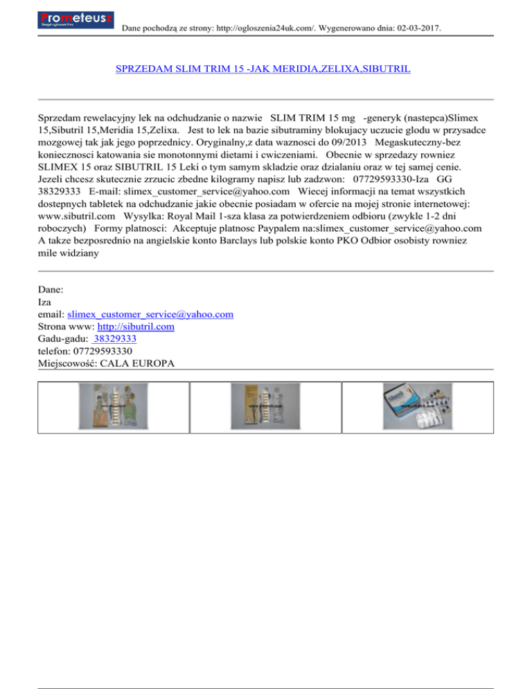 Dane pochodzą ze strony: http://ogloszenia24uk.com/. Wygenerowano dnia: 02-03-2017. SPRZEDAM SLIM TRIM 15 -JAK MERIDIA,ZELIXA,SIBUTRIL Sprzedam rewelacyjny lek na odchudzanie o nazwie SLIM TRIM 15 mg -generyk (nastepca)Slimex 15,Sibutril 15,Meridia 15,Zelixa. Jest to lek na bazie sibutraminy blokujacy uczucie glodu w przysadce mozgowej tak jak jego poprzednicy. Oryginalny,z data waznosci do 09/2013 Megaskuteczny-bez koniecznosci katowania sie monotonnymi dietami i cwiczeniami. Obecnie w sprzedazy rowniez SLIMEX 15 oraz SIBUTRIL 15 Leki o tym samym skladzie oraz dzialaniu oraz w tej samej cenie. Jezeli chcesz skutecznie zrzucic zbedne kilogramy napisz lub zadzwon: 07729593330-Iza GG 38329333 E-mail: [email protected] Wiecej informacji na temat wszystkich dostepnych tabletek na odchudzanie jakie obecnie posiadam w ofercie na mojej stronie internetowej: www.sibutril.com Wysylka: Royal Mail 1-sza klasa za potwierdzeniem odbioru (zwykle 1-2 dni roboczych) Formy platnosci: Akceptuje platnosc Paypalem na:[email protected] A takze bezposrednio na angielskie konto Barclays lub polskie konto PKO Odbior osobisty rowniez mile widziany Dane: Iza email: [email protected] Strona www: http://sibutril.com Gadu-gadu: 38329333 telefon: 07729593330 Miejscowość: CALA EUROPA