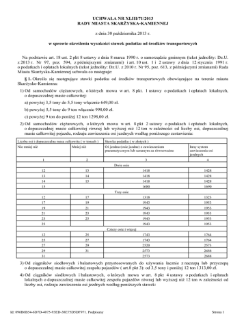 UCHWAŁA NR XLIII/71/2013 RADY MIASTA SKARŻYSKA-KAMIENNEJ z dnia 30 października 2013 r. w sprawie określenia wysokości stawek podatku od środków transportowych Na podstawie art. 18 ust. 2 pkt 8 ustawy z dnia 8 marca 1990 r. o samorządzie gminnym (tekst jednolity: Dz.U. z 2013 r. Nr 97, poz. 594, z późniejszymi zmianami) i art. 10 ust. 1 i 2 ustawy z dnia 12 stycznia 1991 r. o podatkach i opłatach lokalnych (tekst jednolity: Dz.U. z 2010 r. Nr 95, poz. 613, z późniejszymi zmianami) Rada Miasta Skarżyska-Kamiennej uchwala co następuje: § 1. Określa się następujące stawki podatku od środków transportowych obowiązujące na terenie miasta Skarżysko-Kamienna: 1) Od samochodów ciężarowych, o których mowa w art. 8 pkt. 1 ustawy o podatkach i opłatach lokalnych, o dopuszczalnej masie całkowitej: a) powyżej 3,5 tony do 5,5 tony włącznie 649,00 zł. b) powyżej 5,5 tony do 9 ton włącznie 998,00 zł. c) powyżej 9 ton do poniżej 12 ton 1298,00 zł. 2) Od samochodów ciężarowych, o których mowa w art. 8 pkt 2 ustawy o podakach i opłatach lokalnych, o dopuszczalnej masie całkowitej równej lub wyższej niż 12 ton w zależności od liczby osi, dopuszczalnej masie całkowitej pojazdu, rodzaju zawieszenia osi jezdnych według poniższego zestawienia: Liczba osi i dopuszczalna masa całkowita ( w tonach ) Stawka podatku ( w złotych ) Nie mniej niż Oś jezdna (osie jezdne) z zawieszeniem pneumatycznym lub uznanym za równoważne Mniej niż 1 2 Inny system zawieszenia osi jezdnych 3 4 Dwie osie 12 13 1418 1428 13 14 1418 1428 14 15 1418 1428 1680 1690 15 Trzy osie 12 17 1318 1323 17 19 1943 1953 19 21 1943 1953 21 23 1943 1953 23 25 1943 1953 1943 1953 25 Cztery osie i więcej 12 25 1743 1764 25 27 1743 1764 27 29 2520 2573 29 31 2573 2688 2573 2688 31 3) Od ciągników siodłowych i balastowych przystosowanych do używania łacznie z naczepą lub przyczepą o dopuszczalnej masie całkowitej zespołu pojazdów ( art.8 pkt 3): od 3,5 tony i poniżej 12 ton 1313,00 zł. 4) Od ciągników siodłowych i balastowych, o których mowa w art. 8 pkt 4 ustawy o podatkach i opłatach lokalnych o dopuszczalnej masie całkowitej zespołu pojazdów równej lub wyższej niż 12 ton w zależności od liczby osi, rodzaju zawieszenia osi jezdnych według poniższych stawek: Id: 096B6B54-6D7D-4075-93ED-38E75D5DF971. Podpisany Strona 1 Liczba osi i dopuszczalna masa całkowita zespołu pojazdów: ciągnik siodłowy + naczepa; ciągnik balastowy + przyczepa (w tonach) Stawka podatku ( w złotych ) Nie mniej niż Oś jezdna ( osie jezdne ) z zawieszeniem Inne systemy pneumatycznym lub zawieszeniem uznanym zawieszenia osi za równoważne jezdnych Mniej niż 1 2 3 4 Dwie osie 12 18 1350 1410 18 25 1575 1785 25 31 1838 1890 1890 2132 1890 1995 2310 2793 31 Trzy osie i więcej 12 40 40 5) Od przyczep i naczep, które łącznie z pojazdem silnikowym posiadają dopuszczalną masę całkowitą od 7 ton i poniżej 12 ton, z wyjątkiem związanych wyłącznie z działalnością rolniczą prowadzoną przez podatnika podatku rolnego ( art. 8 pkt 5 ): 840,00 zł. 6) Od przyczep i naczep, o których mowa w art. 8 pkt 6 ustawy o podatkach i opłatach lokalnych z wyjątkiem związanych wyłacznie z działalnością rolniczą prowadzonych przez podatników podatku rolnego, które łacznie z pojazdem silnikowym posiadają dopuszczalną masę całkowitą równą lub wyższą niż 12 ton według poniższych stawek: Liczba osi i dopuszczalna masa całkowita zespołu pojazdów: naczepa/przyczepa+pojazd silnikowy ( w tonach ) Stawka podatku (w złotych ) Nie mniej niż Oś jezdna ( osie jezdne ) z zawieszeniem pneumatycznym lub zawieszeniem uznanym za równoważene Mniej niż 1 2 12 18 Inne systemy zawieszenia osi jezdnych 3 4 18 578 599 25 735 767 756 788 Jedna oś 25 Dwie osie 12 28 1260 1365 28 33 1313 1418 33 38 1365 1470 1806 1869 1260 1418 1365 1470 38 Trzy osie i więcej 12 38 38 7) Od autobusów o których mowa w art. 8 pkt 7 ustawy o podatkach i opłatach lokalnych o ilości miejsc do siedzenia: mniejszej niż 30 miejsc - 1365,00 zł. / równej lub wyższej niż 30 miejsc - 1522,00 zł. § 2. Stawki podatku dla środków transportowych wyprodukowanych w 2004r. i nowszych oraz posiadających dokumenty potwierdzające spełnienie przez pojazd odpowiednich wymagań w zakresie ograniczenia emisji spalin do środowiska określa się w wysokości: 1) Dla środków transportowych, o których mowa w art. 8 pkt 1 ustawy o podatkach i opłatach lokalnych: a) powyżej 3,5 tony do 5,5 tony włącznie - 577,00 zł. b) powyżej 5,5 tony do 9 ton włącznie - 892,00 zł. c) powyżej 9 ton do poniżej 12 ton - 1155,00 zł. 2) Od ciągników siodłowych i balastowych przystosowanych do używania łącznie z naczepą lub przyczepą o dopuszczalnej masie całowitej zespołu pojazdów art. 8 pkt 3: od 3,5 tony i poniżej 12 ton - 1155,00 zł. Id: 096B6B54-6D7D-4075-93ED-38E75D5DF971. Podpisany Strona 2 3) Od autobusów, o których mowa w art. 8 pkt 7 ustawy o podatkach i opłatach lokalnych o ilości miejsc do siedzenia: mniejszej niż 30 miejsc - 1207,00 zł. / równej lub wyższej niż 30 miejsc - 1365,00 zł. § 3. Traci moc Uchwała Nr XXIX/83/2012 Rady Miasta Skarżyska-Kamiennej z dnia 25 października 2012r. w sprawie określenia wysokości stawek podatku od środków transportowych na 2013 rok. § 4. Wykonanie uchwały powierza się Prezydentowi Miasta Skarżyska-Kamiennej. § 5. Uchwała wchodzi w życie po uływie 14 dni od dnia ogłoszenia w Dzienniku Urzędowym Województwa Świętokrzyskiego, nie wcześniej jednak niż z dniem 1 stycznia 2014r. Przewodniczący Rady Miasta Andrzej Dąbrowski Id: 096B6B54-6D7D-4075-93ED-38E75D5DF971. Podpisany Strona 3 Uzasadnienie O wysokości stawek podatków i opłat lokalnych decyduje rada gminy, z tym, że nie mogą one przekroczyć górnej granicy określanej corocznie przez Ministra Finansów. Na 2014 rok wysokość górnych stawek kwotowych podatku od środków tran