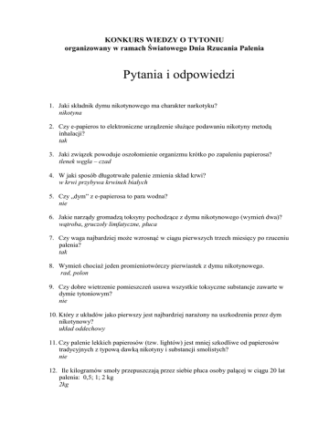 KONKURS WIEDZY O TYTONIU organizowany w ramach Światowego Dnia Rzucania Palenia Pytania i odpowiedzi 1. Jaki składnik dymu nikotynowego ma charakter narkotyku? nikotyna 2. Czy e-papieros to elektroniczne urządzenie służące podawaniu nikotyny metodą inhalacji? tak 3. Jaki związek powoduje oszołomienie organizmu krótko po zapaleniu papierosa? tlenek węgla – czad 4. W jaki sposób długotrwałe palenie zmienia skład krwi? w krwi przybywa krwinek białych 5. Czy „dym” z e-papierosa to para wodna? nie 6. Jakie narządy gromadzą toksyny pochodzące z dymu nikotynowego (wymień dwa)? wątroba, gruczoły limfatyczne, płuca 7. Czy waga najbardziej może wzrosnąć w ciągu pierwszych trzech miesięcy po rzuceniu palenia? tak 8. Wymień chociaż jeden promieniotwórczy pierwiastek z dymu nikotynowego. rad, polon 9. Czy dobre wietrzenie pomieszczeń usuwa wszystkie toksyczne substancje zawarte w dymie tytoniowym? nie 10. Który z układów jako pierwszy jest najbardziej narażony na uszkodzenia przez dym nikotynowy? układ oddechowy 11. Czy palenie lekkich papierosów (tzw. lightów) jest mniej szkodliwe od papierosów tradycyjnych z typową dawką nikotyny i substancji smolistych? nie 12. Ile kilogramów smoły przepuszczają przez siebie płuca osoby palącej w ciągu 20 lat palenia: 0,5; 1; 2 kg 2kg 13.Kogo nazywamy biernym palaczem? osobę niepalącą, która jest narażona na wdychanie dymu papierosowego (np. przebywa w zadymionym pomieszczeniu) 14. Wymień trzy choroby wynikające z nałogu palenia. Np. rak płuc, rak krtani, rak garda, rak przełyku, rak nerki, rak pęcherza moczowego, rak trzustki a także rak żołądka, rak nosa, rak wątroby, rak szyjki macicy, białaczka, miażdżyca naczyń krwionośnych, nadciśnienie tętnicze, choroba niedokrwienna serca, zawał serca, tętniak aorty, przewlekłe zapalenie oskrzeli, przewlekła obturacyjna choroba płuc (POChP), astma oskrzelowa, większa podatność na zakażenia bakteryjne i wirusowe, gruźlica, wrzody żołądka i dwunastnicy, refluks żołądkowoprzełykowy, choroba Leniewskiego-Crohna, wrzodziejące zapalenie jelita grubego, przepukliny jelitowe, udar mózgu, zakrzepy naczyń mózgowych, krwawienia podpajęczynówkowe, przedwczesne odklejenie się łożyska, przedwczesne pęknięcie błon porodowych, mała masa urodzeniowa noworodka, utrudnione zajście w ciążę (obniżona płodność), wcześniejsza menopauza, osteoporoza, zaćma, przyspieszone zwyrodnienie plamki żółtej związane z wiekiem, wcześniejsze starzenie się skóry, paradontoza, nasilenie objawów niedoczynności tarczycy, … 15. Czy łożysko matki chroni organizm dziecka przed substancjami zawartymi w dymie tytoniowym? nie 16. Co to jest machorka? jest to gatunek tytoniu (tytoń bakun) 17. Czy jednym z około 40 rakotwórczych składników papierosów jest aceton – rozpuszczalnik, składnik lakieru do paznokci i farb? tak 18. Kiedy obchodzimy „Światowy Dzień bez Tytoniu”? 31 maja 19. Czy „Ustawa o ochronie zdrowia przed następstwami używania tytoniu i wyrobów tytoniowych” została uchwalona 9 listopada 1995 roku ? Tak 20. Jakiej wysokości kara grozi właścicielom lub zarządzającemu obiektem za brak zakazu palenia w miejscu, gdzie taki zakaz obowiązuje? za nieumieszczenie znaku słownego i graficznego o zakazie palenia w miejscu objętym zakazem palenia właścicielowi lub zarządzającemu obiektem grozi kara do 2000 zł