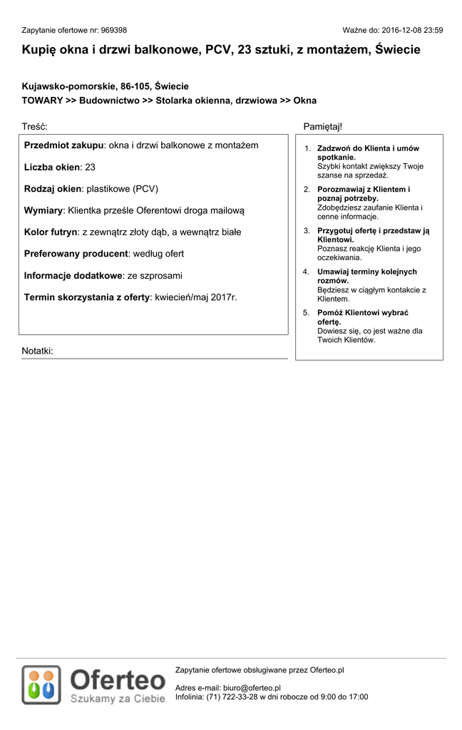 Zapytanie ofertowe nr: 969398 Ważne do: 2016-12-08 23:59 Kupię okna i drzwi balkonowe, PCV, 23 sztuki, z montażem, Świecie Kujawsko-pomorskie, 86-105, Świecie TOWARY >> Budownictwo >> Stolarka okienna, drzwiowa >> Okna Treść: Pamiętaj! Przedmiot zakupu: okna i drzwi balkonowe z montażem 1. Zadzwoń do Klienta i umów spotkanie. Szybki kontakt zwiększy Twoje szanse na sprzedaż. Liczba okien: 23 Rodzaj okien: plastikowe (PCV) Wymiary: Klientka prześle Oferentowi droga mailową Kolor futryn: z zewnątrz złoty dąb, a wewnątrz białe Preferowany producent: według ofert Informacje dodatkowe: ze szprosami 2. Porozmawiaj z Klientem i poznaj potrzeby. Zdobędziesz zaufanie Klienta i cenne informacje. 3. Przygotuj ofertę i przedstaw ją Klientowi. Poznasz reakcję Klienta i jego oczekiwania. 4. Umawiaj terminy kolejnych rozmów. Będziesz w ciągłym kontakcie z Klientem. 5. Pomóż Klientowi wybrać ofertę. Dowiesz się, co jest ważne dla Twoich Klientów. Termin skorzystania z oferty: kwiecień/maj 2017r. Notatki: Zapytanie ofertowe obsługiwane przez Oferteo.pl Adres e-mail: [email protected] Infolinia: (71) 722-33-28 w dni robocze od 9:00 do 17:00