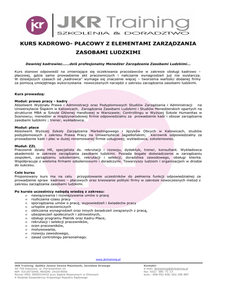 KURS KADROWO- PŁACOWY Z ELEMENTAMI ZARZĄDZANIA ZASOBAMI LUDZKIMI Dawniej kadrowiec……dziś profesjonalny Menedżer Zarządzania Zasobami Ludzkimi… Kurs stanowi odpowiedź na zmieniające się oczekiwania pracodawców w zakresie obsługi kadrowo – płacowej, gdzie samo prowadzenie akt pracowniczych i naliczanie wynagrodzeń już nie wystarcza. W dzisiejszych czasach od „kadrowca” wymaga się znaczenie więcej – tworzenia wartości dodanej firmy za pomocą umiejętnego wykorzystania nowoczesnych narzędzi z zakresu zarządzania zasobami ludzkimi. Kurs prowadzą: Moduł: prawo pracy - kadry Absolwent Wydziału Prawa i Administracji oraz Podyplomowych Studiów Zarządzania i Administracji na Uniwersytecie Śląskim w Katowicach, Zarządzania Zasobami Ludzkimi i Studiów Menedżerskich opartych na strukturze MBA w Szkole Głównej Handlowej w Warszawie; Controllingu w Wyższej Szkole Humanitas w Sosnowcu; menedżer w międzynarodowej firmie odpowiedzialny za prowadzenie kadr i obszar zarządzania zasobami ludzkimi ; trener, wykładowca. Moduł: płace Absolwent Wyższej Szkoły Zarządzania Marketingowego i Języków Obcych w Katowicach, studiów podyplomowych z zakresu Prawa Pracy na Uniwersytecie Jagiellońskim; kierownik odpowiedzialny za prowadzenie kadr i płac w dużej renomowanej firmie usługowej; wykładowca, szkoleniowiec. Moduł: ZZL Pracownik działu HR, specjalista ds. rekrutacji i rozwoju, dydaktyk, trener, konsultant. Wykładowca akademicki w zakresie zarządzania zasobami ludzkimi. Posiada bogate doświadczenie w zarządzaniu zespołem, zarządzaniu szkoleniami, rekrutacji i selekcji, doradztwa zawodowego, obsługi klienta. Współpracuje z wieloma firmami szkoleniowymi i doradczymi. Towarzyszy ludziom i organizacjom w drodze do sukcesu. Cele kursu Proponowany kurs ma na celu przygotowanie uczestników do pełnienia funkcji odpowiedzialnej za prowadzenie spraw kadrowo – płacowych oraz kreowanie polityki firmy w zakresie nowoczesnych metod z zakresu zarządzania zasobami ludzkimi. Po kursie uczestnicy nabędą wiedzę z zakresu: • nawiązywania i rozwiązywania umów o pracę • rozliczania czasu pracy • sporządzania umów o pracę, wypowiedzeń i świadectw pracy • urlopów pracowniczych • obliczania wynagrodzeń oraz innych świadczeń związanych z pracą, • ubezpieczeń społecznych i zdrowotnych, • obsługi programu Płatnik oraz Kadry-Płace, • rekrutacji i selekcji pracowników, • ocen pracowników, • motywowania, • rozwoju zawodowego, • zasad controlingu personalnego. www.jkrtraining.pl JKR Training Spółka Jawna Iwona Mazelanik, Jarosław Drzazga 40-750 Katowice, ul. Pierwiosnków 24 NIP: 6312572040, REGON: 241019056 Numer KRS: 0000314432 przy Sądzie Rejonowym w Gliwicach X Wydział Gospodarczy Krajowego Rejestru Sądowego Kontakt: e-mail: [email protected] fax: 032/ 380 71 13 kom.: 608 052 658, 602 296 887 Adresaci szkolenia Kurs adresowany jest do wszystkich, których pasja są kadry i w przyszłości chcieliby zostać profesjonalnym menedżerem, kadry kierowniczej, pracowników działów kadr oraz innych osób prowadzących sprawy pracownicze w firmie. RAMOWY PROGRAM KURSU I. 1. 2. 3. 4. 5. 6. 7. 8. 9. 10. 11. 12. 13. 14. II. PRAWO PRACY - KADRY Podstawowe zasady prawa pracy Kodeks pracy w świetle najnowszych zmian Nawiązywanie umów o pracę Umowa o pracę a umowy cywilnoprawne Prowadzenie akt osobowych Badania lekarskie i szkolenia z zakresu BHP Czas pracy Urlopy pracownicze Rola związków zawodowych w organizacji Rozwiązywanie umów o pracę Zwolnienia grupowe Świadectwo pracy Sporządzanie umów o pracę, wypowiedzeń i świadectw pracy Przygotowanie jednostki do kontroli Państwowej Inspekcji Pracy PŁACE 1. Wynagrodzenia za pracę i inne świadczenia • ustalanie wynagrodzenia za pracę i innych świadczeń związanych z pracą • wynagrodzenie za pracę • ochrona wynagrodzenia za pracę • świadczenia przysługujące w okresie czasowej niezdolności do pracy • odprawa rentowa lub emerytalna • odprawa pośmiertna 2. Zasady podlegania ubezpieczeniom społecznym – ustalania podstawy wymiaru i opłacania składek 3. Ubezpieczenie zdrowotne 4. Świadczenia pieniężne z ubezpieczenia społecznego w razie choroby i macierzyństwa 5. Zasady wypełniania dokumentów ubezpieczeniowych 6. Podatek dochodowy od osób fizycznych i rozliczenia z Urzędem Skarbowym 7. Obsługa programu Płatnik • instalacja i rozpoczęcie pracy z programem • obsługa kartoteki płatnika • tworzenie oraz obsługa kartoteki ubezpieczonego • tworzenie nowych dokumentów zgłoszeniowych ubezpieczonego • tworzenie i obsługa zestawów dokumentów • tworzenie i obsługa dokumentów rozliczeniowych • operacje na dokumentach rozliczeniowych • wysyłanie zestawów za pomocą elektronicznej wymiany dokumentów 8. Podstawy obsługi programu kadrowo-płacowego www.jkrtraining.pl JKR Training Spółka Jawna Iwona Mazelanik, Jarosław Drzazga 40-750 Katowice, ul. Pierwiosnków 24 NIP: 6312572040, REGON: 241019056 Numer KRS: 0000314432 przy Sądzie Rejonowym w Gliwicach X Wydział Gospodarczy Krajowego Rejestru Sądowego Kontakt: e-mail: [email protected] fax: 032/ 380 71 13 kom.: 608 052 658, 602 296 887 III. ZARZĄDZANIE ZASOBAMI LUDZKIMI 1. Proces rekrutacji • systemy kompetencyjne w firmie • przygotowanie procesu rekrutacji • analiza stanowisk pracy • poszukiwanie kandydatów • selekcja kandydatów • komunikacja podczas rozmowy rekrutacyjnej • zadania dla kandydatów • testy rekrutacyjne • podejmowanie decyzji o zatrudnieniu • ocena procesu rekrutacji • procedura wdrażania nowego pracownika 2. Ocena pracowników • ocena okresowa pracowników • systemy oceny okresowej 3. Rozwój pracowników • szkolenia pracowników • planowanie sukcesji • coaching • zarządzanie talentami • kompetencje osobiste pracowników • metody szkoleniowo – rozwojowe 4. Controlling personalny • zasilanie inform