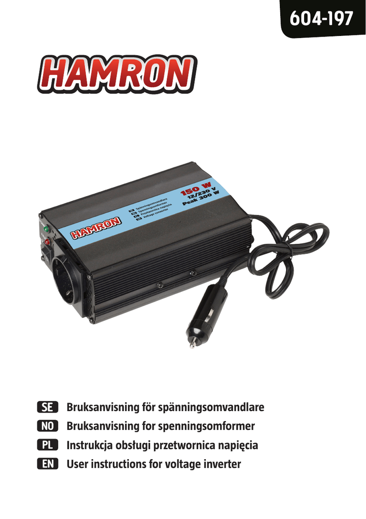 604-197 Bruksanvisning för spänningsomvandlare Bruksanvisning for spenningsomformer Instrukcja obsługi przetwornica napięcia User instructions for voltage inverter SE - Bruksanvisning i original Rätten till ändringar förbehålles. Vid eventuella problem, kontakta vår serviceavdelning på telefon 0200-88 55 88. www.jula.se NO - Bruksanvisning (Oversettelse av original bruksanvisning) Med forbehold om endringer. Ved eventuelle problemer kan du kontakte vår serviceavdeling på telefon 67 90 01 34. www.jula.no PL - Instrukcja obsługi (Tłumaczenie oryginalnej instrukcji) Z zastrzeżeniem prawa do zmian. W razie ewentualnych problemów skontaktuj się telefonicznie z naszym działem obsługi klienta pod numerem: 22 338 88 88. www.jula.pl EN - Operating instructions (Translation of the original instructions) Jula reserves the right to make changes. In the event of problems, please contact our service department. www.jula.com Tillverkare/ Produsent / Producenci/ Manufacturer Jula AB, Box 363, 532 24 SKARA Importör/ Importør/ Importer/ Importer Jula Norge AS, Solheimsveien 6–8, 1471 LØRENSKOG Distributör/ Distributør/ Dystrybutor/ Distributor Jula Poland Sp. z o.o., ul. Malborska 49, 03-286 Warszawa, Polska Date of production: 2015-07-02 © Jula AB Värna om miljön! Får ej slängas bland hushållssopor! Denna produkt innehåller elektriska eller elektroniska komponenter som skall återvinnas. Lämna produkten för återvinning på anvisad plats, till exempel kommunens återvinningsstation. Verne om miljøet! Må ikke kastes sammen med husholdningsavfallet! Dette produktet må inneholder elektriske eller elektroniske komponentersom skal gjenvinnes. Lever produkt till gjenvinning på anvist sted, f.eks. kommunens miljøstation. Dbaj o środowisko! Nie wyrzucaj zużytego produktu wraz z odpadami komunalnymi! Produkt zawiera elektryczne komponenty mogące być zagrożeniem dla środowiska. Produkt należy oddać do odpowiedniego punktu składowania lub przynieść go do jednego ze sklepów gdzie przy zakupie nowego sprzętu bezpłatnie przyjmiemy stary tego samego rodzaju i w tej samej ilości. Care for the environment! Must not be discarded with household waste! This product contains electrical or electronic components that should be recycled. Leave the product for recycling at the designated station e.g. the local authority's recycling station. SVENSKA������������������������������������������������������������������������������������������������������������������ 5 SÄKERHETSANVISNINGAR����������������������������������������������������������������������������������������������������������������������5 TEKNISKA DATA ��������������������������������������������������������������������������������������������������������������������������������������5 MONTERING��������������������������������������������������������������������������������������������������������������������������������������������5 HANDHAVANDE��������������������������������������������������������������������������������������������������������������������������������������7 UNDERHÅLL������������������������������������������������������������������������������������������������������������������������������������������� 9 NORSK�������������������������������������������������������������������������������������������������������������������� 10 SIKKERHETSANVISNINGER��������������������������������������������������������������������������������������������������������������������10 TEKNISKE DATA��������������������������������������������������������������������������������������������������������������������������������������10 MONTERING��������