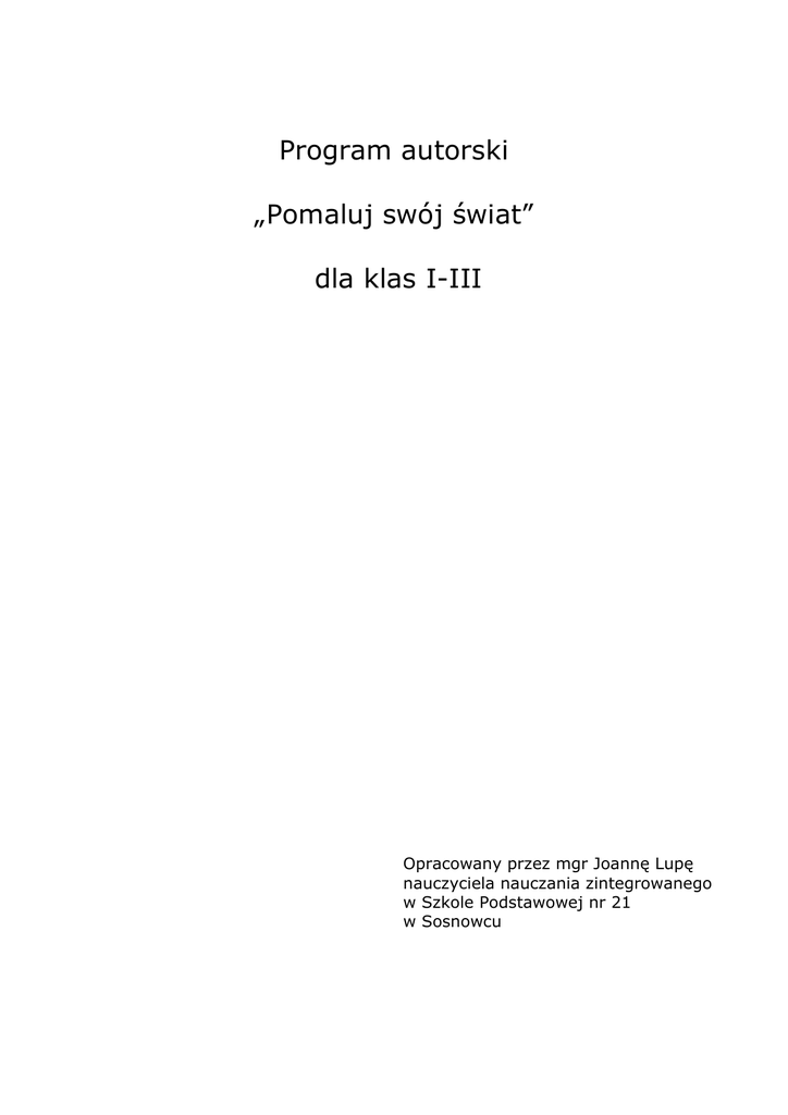 Program autorski „Pomaluj swój świat” dla klas I-III Opracowany przez mgr Joannę Lupę nauczyciela nauczania zintegrowanego w Szkole Podstawowej nr 21 w Sosnowcu WSTĘP Dziecko nie musi zawsze robić tego, co chce, ale zawsze powinno chcieć tego, co robi. Claparède Biorąc pod uwagę dydaktyczny i wychowawczy rozwój jednostki jako jeden z podstawowych wyznaczników naszego społeczeństwa podjęłam się napisania programu autorskiego, dotyczącego zajęć plastycznych. Efekty dydaktyczno-wychowawcze można tym łatwiej uzyskać, im trafniej będzie rozpoznana i wykorzystana aktywność wychowanków. Na podstawie wcześniejszych doświadczeń i obserwacji zauważyłam, że działalność plastyczna dzieci 7-10-letnich jest jedną z najprzyjemniejszych i najchętniej podejmowanych form aktywności. Rzadko kiedy się zdarza, aby do niej namawiać. Zarówno rysowanie, malowanie, jak i grafika, rzeźbienie, plenery plastyczne, czy też inne niekonwencjonalne formy przekazu plastycznego cieszą się wśród dzieci niesłabnącym uznaniem. Można osiągnąć szereg dyspozycji, takich jak m.in.: • • • • • percepcja wzrokowa dziecka, sprawność manualna i koordynacja wzrokowo-motoryczna, koncentracja uwagi, postawa otwartości, samorealizacja, twórcza inspiracja. Wypowiadanie się w formie plastycznej daje dziecku dużo radości, zadowolenia. Pozwala dostrzegać, rozumieć i przeżywać wartości wizualne otaczającego świata. Na zajęciach tych nauczyciel powinien stosować różne formy pracy, poszukiwać odpowiednich rozwiązań organizacyjnych w pracy z uczniami, stosować różne metody i środki nauczania, wprowadzać odpowiedni klimat, aby wyzwolić w dzieciach autentyczną radość tworzenia. Uczestnictwo w różnych kursach, warsztatach plastycznych oraz lektura książek i czasopism wzbogaciły zasób moich doświadczeń i pomysłów. Postanowiłam sprawić, by dzieci mogły tworzyć i działać wykorzystując bogaty, niestereotypowy materiał plastyczny. Wyjaśniłam rodzicom, na czym będą polegać plastyczne zajęcia pozalekcyjne i przeprowadziłam wśród nich ankietę. Okazało się, że wszyscy wyrazili zgodę na uczestnictwo dzieci w tychże zajęciach. Chcąc uzyskać dobrowolność i akceptację dzieci, rozmawiałam z nimi na temat realizacji edukacji plastycznej. Wyjaśniłam im, jak będą wyglądać zajęcia, czego się nauczą. Wszyscy uczniowie również z radością wyrazili chęć udziału w zajęciach. Program ma charakter otwarty, można go modyfikować i dostosowywać do potrzeb i możliwości dzieci. Jest kierowany do uczniów klas I-III. W zajęciach koła plastycznego uczestniczą uczniowie z klasy aktualnie przeze mnie prowadzonej. Nauczyciel pełni w nim rolę koordynatora działań i pomocnika. Cele główne: - krzewienie zamiłowania do sztuk plastycznych i rozbudzanie zainteresowań tą dziedziną sztuki, - rozwijanie i doskonalenie umiejętności plastycznych. Cele operacyjne: Uczeń powinien: • znać różne techniki plastyczne i umieć je zastosować, • znać podstawowe pojęcia, nazwy plastyczne, • dostrzegać i odbierać wartości wizualne środowiska przyrodniczego i kulturalnego oraz treści w nim zawarte, • chętnie podejmować działania twórcze, • umieć przewidzieć skutki różnych działań twórczych, • zgodnie współpracować w grupie, • umieć zrealizować własne pomysły, szanować pomysły innych, • dążyć do poznania regionalnej sztuki i kultury, • uczestniczyć w imprezach regionalnych (wystawy, konkursy, przedstawienia i inne wydarzenia kulturalne). Procedury osiągania celów: - poznanie technik plastycznych, nazw i pojęć związanych z działalnością plastyczną, - obserwowanie i podziwianie „sztuki ekologicznej”, • piękna zjawisk atmosferycznych (tęcza, deszcz, śnieg), • przyrody naturalnej (las, pole, łąka, krajobrazy), • przyrody aranżowanej (parki, ogrody, bukiety, kwietniki), • świata roślin i zwierząt, - dostrzeganie i opisywanie zmian zachodzących w przyrodzie w związku z następstwem pór roku, - oglądanie dzieł mistrzów malarstwa, grafiki, rzeźby, architektury, - analiza fotografii, ilustracji, albumów, reprodukcji obrazów, - poznanie regionalnej sztuki i kultury, uczestniczenie w imprezach regionalnych, - przedstawianie scen rodzajowych z życia codziennego, - odnoszenie się do tekstów literackich, spektakli teatralnych, filmu, muzyki, tańca, - czerpanie z własnych przeżyć, doświadczeń, wyobraźni, snów i marzeń, - poznanie zwyczajów i tradycji kulturowych związanych z rokiem liturgicznym, przyrodniczym oraz ze świętami okolicznościowymi, - kultywowanie zasad zdrowego stylu życia, - uczestnictwo w konkursach szkolnych i pozaszkolnych, - gromadzenie niezbędnych materiałów do wykonywania prac plastycznych, - właściwa organizacja stanowiska pracy, zgodna współpraca w grupie, zespole, oszczędne gospodarowanie materiałem, Metody pracy: • obserwacja i pokazy, • spacery, wycieczki, zajęcia terenowe, • warsztaty plastyczne, • pogadanki, dyskusja, • metody aktywizujące: burza mózgów, mapa pojęciowa, • filmy wideo, • wystawy, przedstawienia, • praktyczne działanie uczniów, Formy pracy: • zbiorowa, • grupowa jednolita, zróżnicowana, • indywidualna jednolita, zróżnicowana, Techniki plastyczne: • rysowanie i malowanie na różnych formach papieru, płótnie, formach przestrzennych kredkami, flamastrami, ołówkiem, tuszem, farbami, pastelami, świecą, • lepienie (modelowanie) z plasteliny, masy solnej, masy papierowej, modeliny, gliny, gipsu rzeźby i płaskorzeźby, • stemplowanie, odbijanie, kalkowanie, • malowanie w komputerze- proste zabawy z grafiką komputerową, • konstruowanie form przestrzennych z różnych materiałów, • tworzenie w technice collage, • tworzenie kompozycji dekoracyjnych z kwiatów, zasuszonych liści, gałęzi i innych substytutów jesiennych, letnich, • wykona