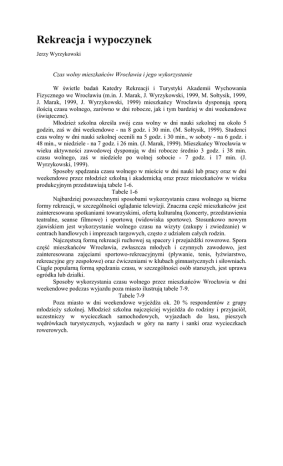 Rekreacja i wypoczynek Jerzy Wyrzykowski Czas wolny mieszkańców Wrocławia i jego wykorzystanie W świetle badań Katedry Rekreacji i Turystyki Akademii Wychowania Fizycznego we Wrocławiu (m.in. J. Marak, J. Wyrzykowski, 1999, M. Sołtysik, 1999, J. Marak, 1999, J. Wyrzykowski, 1999) mieszkańcy Wrocławia dysponują sporą ilością czasu wolnego, zarówno w dni robocze, jak i tym bardziej w dni weekendowe (świąteczne). Młodzież szkolna określa swój czas wolny w dni nauki szkolnej na około 5 godzin, zaś w dni weekendowe - na 8 godz. i 30 min. (M. Sołtysik, 1999). Studenci czas wolny w dni nauki szkolnej ocenili na 5 godz. i 30 min., w soboty - na 6 godz. i 48 min., w niedziele - na 7 godz. i 26 min. (J. Marak, 1999). Mieszkańcy Wrocławia w wieku aktywności zawodowej dysponują w dni robocze średnio 3 godz. i 38 min. czasu wolnego, zaś w niedziele po wolnej sobocie - 7 godz. i 17 min. (J. Wyrzykowski, 1999). Sposoby spędzania czasu wolnego w mieście w dni nauki lub pracy oraz w dni weekendowe przez młodzież szkolną i akademicką oraz przez mieszkańców w wieku produkcyjnym przedstawiają tabele 1-6. Tabele 1-6 Najbardziej powszechnymi sposobami wykorzystania czasu wolnego są bierne formy rekreacji, w szczególności oglądanie telewizji. Znaczna część mieszkańców jest zainteresowana spotkaniami towarzyskimi, ofertą kulturalną (koncerty, przedstawienia teatralne, seanse filmowe) i sportową (widowiska sportowe). Stosunkowo nowym zjawiskiem jest wykorzystanie wolnego czasu na wizyty (zakupy i zwiedzanie) w centrach handlowych i imprezach targowych, często z udziałem całych rodzin. Najczęstszą formą rekreacji ruchowej są spacery i przejażdżki rowerowe. Spora część mieszkańców Wrocławia, zwłaszcza młodych i czynnych zawodowo, jest zainteresowana zajęciami sportowo-rekreacyjnymi (pływanie, tenis, łyżwiarstwo, rekreacyjne gry zespołowe) oraz ćwiczeniami w klubach gimnastycznych i siłowniach. Ciągle popularną formą spędzania czasu, w szczególności osób starszych, jest uprawa ogródka lub działki. Sposoby wykorzystania czasu wolnego przez mieszkańców Wrocławia w dni weekendowe podczas wyjazdu poza miasto ilustrują tabele 7-9. Tabele 7-9 Poza miasto w dni weekendowe wyjeżdża ok. 20 % respondentów z grupy młodzieży szkolnej. Młodzież szkolna najczęściej wyjeżdża do rodziny i przyjaciół, uczestniczy w wycieczkach samochodowych, wyjazdach do lasu, pieszych wędrówkach turystycznych, wyjazdach w góry na narty i sanki oraz wycieczkach rowerowych. W wyjazdach poza miasto w dni weekendowe bierze udział ok. 40 % studentów. Najpopularniejszymi formami spędzania czasu wolnego są: wycieczka samochodem osobowym, wyjazd do rodziny lub przyjaciół poza Wrocławiem i piesza wędrówka turystyczna. Wśród badanych mieszkańców Wrocławia w wieku aktywności zawodowej w dni weekendowe poza miasto wyjeżdża ok. 60 %. Najczęściej odwiedzają przy tym rodziny lub przyjaciół, wypoczywają w lesie lub nad wodą oraz organizują wycieczki własnym samochodem. Walory turystyczno-rekreacyjne Wrocławia i okolic Wrocław jako "miasto zieleni i mostów" posiada znaczne walory wypoczynkowe. Miasto położone nad Odrą i jej dopływami - Bystrzycą, Oławą, Ślęzą i Widawą mogłoby mieć znakomite warunki do wypoczynku nad wodą, gdyby nie duże zanieczyszczenie tych wód. Wykorzystywane są głównie tereny nadrzeczne na spacery i plażowanie, ponadto Odra z odnogami - dla żeglugi pasażerskiej (rejsy wycieczkowe) i sportów wodnych. Rzeki miasta i związane z nimi mosty stanowią ważny, atrakcyjny element krajobrazowy Wrocławia. Zieleń wrocławska, stanowiąca duże bogactwo miasta, przedstawiona została przez J. Sarosieka (1991). Wśród terenów zielonych dominują lasy i parki leśne, drugie miejsce pod względem powierzchni zajmują ogrody działkowe. W kategorii parków i zieleńców na szczególne wyróżnienie zasługuje Park Szczytnicki, niezwykle bogaty w gatunki drzew i krzewów, w tym osobliwości dendrologiczne. Bardzo popularnym miejscem wypoczynku jest Ogród Botaniczny, a także, w połączeniu ze zwiedzaniem, Ogród Zoologiczny. W okolicach Wrocławia do najatrakcyjniejszych terenów z punktu widzenia wypoczynku należą Wzgórza Trzebnickie i Masyw Ślęży. Głównymi walorami Wzgórz Trzebnickich jest urozmaicona rzeźba terenu, znaczne nasłonecznienie południowych stoków i ciekawe obszary leśne. Okolice Obornik są mniej zróżnicowane wysokościowo, ale w dużym stopniu zalesione, natomiast okolice Trzebnicy są najciekawszą partią Wzgórz Trzebnickich, ale prawie zupełnie bezleśną. Masyw Ślęży, którego największą kulminację tworzy Ślęża (718 m. n.p.m.), jest niemal w całości porośnięty lasem. Duże wysokości względne, znaczna liczba dni z opadem śnieżnym stwarzają dość dobre warunki narciarskie. Masy Ślęży posiada status parku krajobrazowego. Znaczniejsze walory wypoczynkowe posiadają ponadto tereny nadodrzańskie (z projektowanym parkiem krajobrazowym) oraz większe kompleksy leśne w okolicach Milicza i Twardogóry. Rzeka Odra, mimo wysokiego stopnia zanieczyszczeń, stwarza możliwości żeglugi pasażerskiej. Możliwości uprawiania wędrówek kajakowych wiążą się z rzekami - Baryczą (Park Krajobrazowy Doliny Baryczy), Bystrzycą (Park Krajobrazowy Doliny Bystrzycy), Ślęzą, Oławą i Widawą. Wyjazdy weekendowe (świąteczne) połączone są często ze zwiedzaniem ciekawych obiektów krajoznawczych. W okolicach Wrocławia jest ich dużo. Do miejscowości i obiektów krajoznawczych o znaczeniu ponadregionalnym należą Brzeg Dolny, Krobielowice, Lubiąż, Milicz (w tym "Stawy Milickie"), Oleśnica, Oława, Sobótka (w tym góra Śleża), Sułów, Strzelin, Środa Śląska, Trzebnica, Wojnowice, Wołów (Park Krajobrazowy Doliny Jezierzycy), Żurawina. W rejonie Masywu Ślęży i Wzgórz Trzebnickich przebiega szereg ciekawych krajobrazowo dróg. Zagospodar