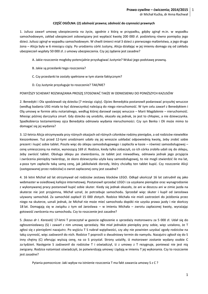 Prawo cywilne – ćwiczenia; 2014/2015 1 dr Michał Kućka, dr Anna Rachwał CZĘŚĆ OGÓLNA: (2) zdolność prawna; zdolność do czynności prawnych 1. Juliusz zawarł umowę ubezpieczenia na życie, zgodnie z którą w przypadku, gdyby zginął m.in. w wypadku samochodowym, zakład ubezpieczeń zobowiązany jest wypłacić kwotę 200 000 zł. podzieloną równo pomiędzy jego dzieci. Juliusz zginął w wypadku samochodowym. W chwili śmierci miał 3 dzieci z pierwszego małżeństwa, a jego druga żona – Alicja była w 6 miesiącu ciąży. Po urodzeniu córki Justyny, Alicja działając w jej imieniu domaga się od zakładu ubezpieczeń wypłaty 50 000 zł. z umowy ubezpieczenia. Czy jej żądanie jest zasadne? A. Jakie roszczenie mogłoby potencjalnie przysługiwać Justynie? Wskaż jego podstawę prawną. B. Jakie są przesłanki tego roszczenia? C. Czy przesłanki te zostały spełnione w tym stanie faktycznym? D. Czy Justynie przysługuje to roszczenie? TAK/NIE? POWYŻSZY SCHEMAT ROZWIĄZANIA PROSZĘ STOSOWAĆ TAKŻE W ODNIESIENIU DO PONIŻSZYCH KAZUSÓW 2. Benedykt i Ola spodziewali się dziecka (7 miesiąc ciąży). Ojciec Benedykta postanowił podarować przyszłej wnuczce (według badania USG miała to być dziewczynka) należącą do niego nieruchomość. W tym celu zawarł z Benedyktem i Olą umowę w formie aktu notarialnego, według której darował swojej wnuczce – Marii Magdalenie – nieruchomość. Miesiąc później darczyńca zmarł. Gdy dziecko się urodziło, okazało się jednak, że jest to chłopiec, a nie dziewczynka. Spadkobierca testamentowy ojca Benedykta odmawia wydania nieruchomości. Czy syn Benka i Oli może mimo to domagać się jej wydania? 3. 12-letnia Alicja otrzymywała przy różnych okazjach od różnych członków rodziny pieniądze, a od rodziców niewielkie kieszonkowe. Tuż przed 12-tymi urodzinami udało się jej wreszcie uskładać odpowiednią kwotę, żeby zrobić sobie prezent i kupić sobie tablet. Poszła więc do sklepu samoobsługowego i zapłaciła w kasie – również samoobsługowej – cenę umieszczoną na metce, wynoszącą 169 zł. Rodzice, kiedy tylko zobaczyli, co ich córka zrobiła udali się do sklepu, żeby zwrócić tablet. Obsługa sklepu po stwierdzeniu, że tablet jest niewadliwy, odmawia jednak jego przyjęcia i zwrócenia pieniędzy twierdząc, że skoro dziewczynka użyła kasy samoobsługowej, to nie mogli stwierdzić ile ma lat, a poza tym zapłaciła taką samą cenę, jak jakikolwiek dorosły, który chciałby ten tablet kupić. Czy roszczenie Alicji (zastępowanej przez rodziców) o zwrot zapłaconej ceny jest zasadne? 4. 16 letni Michał od lat otrzymywał od rodziców zestawy klocków LEGO. Odkąd ukończył 16 lat zatrudnił się jako webmaster w osiedlowej kafejce internetowej. Postanowił sprzedać LEGO i za uzyskane pieniądze oraz wynagrodzenie z wykonywanej pracy postanowił kupić sobie skuter. Kiedy się jednak okazało, że ani w deszczu ani w zimie jazda na skuterze nie jest przyjemna, Michał uznał, że potrzebuje samochodu. Sprzedał więc skuter i kupił od Jarosława używany samochód. Za samochód zapłacił 15 000 złotych. Rodzice Michała nie mieli zastrzeżeń do jeżdżenia przez niego na skuterze, uznali jednak, że Michał nie może mieć samochodu dopóki nie uzyska prawa jazdy i nie skończy 18 lat. Domagają się w związku z tym od Jarosława – w imieniu Michała – zwrotu zapłaconej kwoty, wyrażając gotowość zwrócenia mu samochodu. Czy to roszczenie jest zasadne? 5. (kazus dr I. Karasek) 17-letni T przeczytał w gazecie ogłoszenie o sprzedaży motoroweru za 5 000 zł. Udał się do ogłoszeniodawcy (S) i zawarł z nim umowę sprzedaży. Nie miał jednakże pieniędzy przy sobie, więc ustalono, że T zgłosi się z pieniędzmi nazajutrz. Po wyjściu T S nabrał wątpliwości, czy aby nie powinien uzyskać zgody rodziców na taką czynność, więc zadzwonił do nich. Rodzice T poprosili o dwudniowy termin do namysłu. Nazajutrz zgłosił się do S inny chętny (C) oferując wyższą cenę, na co S przystał. Strony ustaliły, iż motorower zostanie wydany osobie C za tydzień. Następnie S zadzwonił do rodziców T i oświadczył, iż z umowy z T rezygnuje, ponieważ nie jest nią związany. Rodzice natomiast oświadczyli, że potwierdzają umowę i żądają w imieniu T jej wykonania. Czy to roszczenie jest zasadne? Pytania pomocnicze: Jaki wpływ na istnienie roszczenia T ma fakt zawarcia umowy S z C ? 1 Prawo cywilne – ćwiczenia; 2014/2015 2 dr Michał Kućka, dr Anna Rachwał Rozważ także: Jaka jest sytuacja C?: a) w chwili zawierania przez niego umowy z S? b) w chwili potwierdzenia przez rodziców umowy pomiędzy T a S. 6. 17 letnia Sylwia uczyła się była najemcą lokalu. Postanowiła jednak zamieszkać z koleżanką i w tym celu wypowiedziała umowę najmu. Po upływie terminu wypowiedzenia wynajmujący nadal żąda od Sylwii zapłaty czynszu podnosząc, iż złożone przez nią oświadczenie o wypowiedzeniu jest nieskuteczne. Czy jego roszczenie jest zasadne? 7. 10-letni Tomasz zawarł ze swoim ojcem umowę sprzedaży akcji znanej spółki paliwowej. Tomasza reprezentowała matka, która dbała o to, by cena akcji zabezpieczała interesy Tomasza. Na wszelki wypadek rodzice Tomasza uzyskali zgodę sądu opiekuńczego na zawarcie umowy. Czy Tomasz nabył skutecznie akcje spółki? W razie odpowiedzi negatywnej – czy Tomasz mógłby potwierdzić umowę po osiągnięciu pełnoletniości. (por. postanowienie Sądu Najwyższego z 15.12.1999 r. o sygn. akt I CKN 299/98, LEX 44073) 2