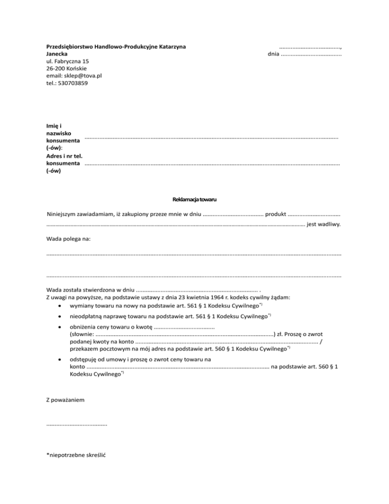 Przedsiębiorstwo Handlowo-Produkcyjne Katarzyna Janecka ul. Fabryczna 15 26-200 Końskie email: [email protected] tel.: 530703859 ....................................., dnia ..................................... Imię i nazwisko .......................................................................................................................................................... konsumenta (-ów): Adres i nr tel. konsumenta ........................................................................................................................................................... (-ów) Reklamacja towaru Niniejszym zawiadamiam, iż zakupiony przeze mnie w dniu ..................................... produkt ................................ ………………………………………………………………………………………………………………………………………………………. jest wadliwy. Wada polega na: ................................................................................................................................................................................... ................................................................................................................................................................................... Wada została stwierdzona w dniu .......................................................................... . Z uwagi na powyższe, na podstawie ustawy z dnia 23 kwietnia 1964 r. kodeks cywilny żądam: wymiany towaru na nowy na podstawie art. 561 § 1 Kodeksu Cywilnego *) nieodpłatną naprawę towaru na podstawie art. 561 § 1 Kodeksu Cywilnego *) obniżenia ceny towaru o kwotę ..................................... (słownie: ............................................................................................................) zł. Proszę o zwrot podanej kwoty na konto ............................................................................................................... / przekazem pocztowym na mój adres na podstawie art. 560 § 1 Kodeksu Cywilnego *) odstępuję od umowy i proszę o zwrot ceny towaru na konto ............................................................................................................... na podstawie art. 560 § 1 Kodeksu Cywilnego*) Z poważaniem ..................................... *niepotrzebne skreślić