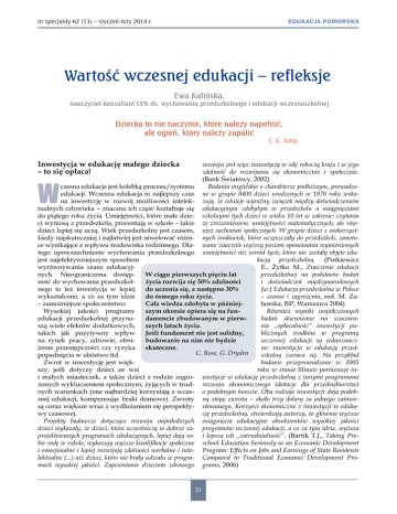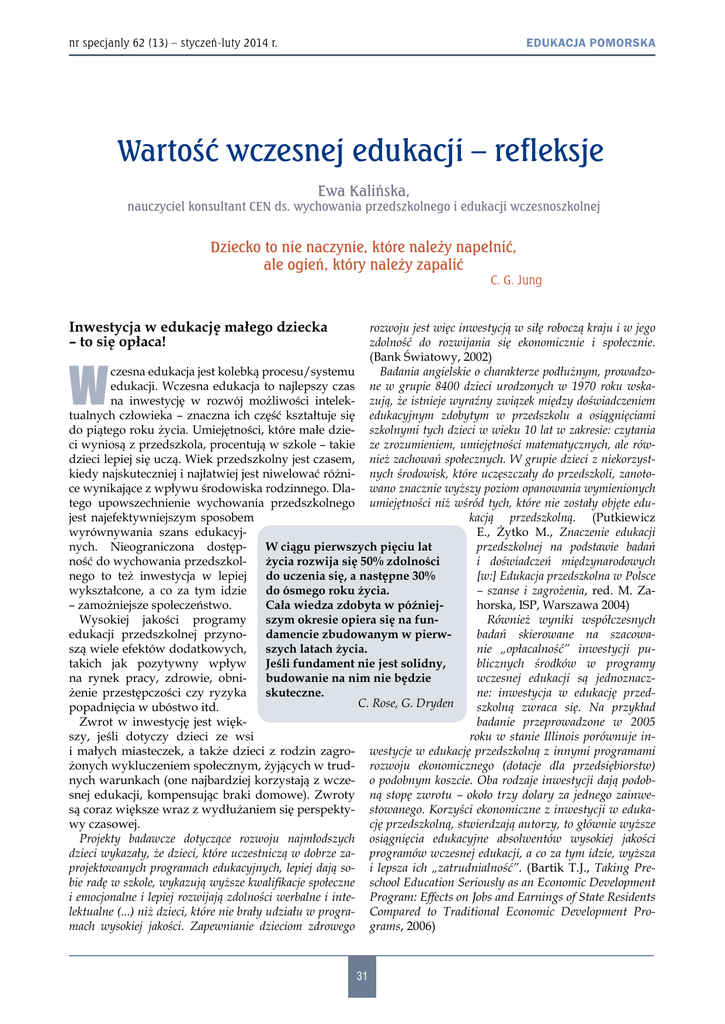 EDUKACJA POMORSKA nr specjanly 62 (13) – styczeń-luty 2014 r. Wartość wczesnej edukacji – refleksje Ewa Kalińska, nauczyciel konsultant CEN ds. wychowania przedszkolnego i edukacji wczesnoszkolnej Dziecko to nie naczynie, które należy napełnić, ale ogień, który należy zapalić C. G. Jung Inwestycja w edukację małego dziecka – to się opłaca! rozwoju jest więc inwestycją w siłę roboczą kraju i w jego zdolność do rozwijania się ekonomicznie i społecznie. (Bank Światowy, 2002) czesna edukacja jest kolebką procesu/systemu Badania angielskie o charakterze podłużnym, prowadzoedukacji. Wczesna edukacja to najlepszy czas ne w grupie 8400 dzieci urodzonych w 1970 roku wskana inwestycję w rozwój możliwości intelek- zują, że istnieje wyraźny związek między doświadczeniem tualnych człowieka – znaczna ich część kształtuje się edukacyjnym zdobytym w przedszkolu a osiągnięciami do piątego roku życia. Umiejętności, które małe dzie- szkolnymi tych dzieci w wieku 10 lat w zakresie: czytania ci wyniosą z przedszkola, procentują w szkole – takie ze zrozumieniem, umiejętności matematycznych, ale rówdzieci lepiej się uczą. Wiek przedszkolny jest czasem, nież zachowań społecznych. W grupie dzieci z niekorzystkiedy najskuteczniej i najłatwiej jest niwelować różni- nych środowisk, które uczęszczały do przedszkoli, zanotoce wynikające z wpływu środowiska rodzinnego. Dla- wano znacznie wyższy poziom opanowania wymienionych tego upowszechnienie wychowania przedszkolnego umiejętności niż wśród tych, które nie zostały objęte edujest najefektywniejszym sposobem kacją przedszkolną. (Putkiewicz wyrównywania szans edukacyjE., Żytko M., Znaczenie edukacji nych. Nieograniczona dostępprzedszkolnej na podstawie badań W ciągu pierwszych pięciu lat ność do wychowania przedszkoli doświadczeń międzynarodowych życia rozwija się 50% zdolności nego to też inwestycja w lepiej [w:] Edukacja przedszkolna w Polsce do uczenia się, a następne 30% wykształcone, a co za tym idzie – szanse i zagrożenia, red. M. Zado ósmego roku życia. – zamożniejsze społeczeństwo. horska, ISP, Warszawa 2004) Cała wiedza zdobyta w późniejWysokiej jakości programy szym okresie opiera się na funRównież wyniki współczesnych edukacji przedszkolnej przynodamencie zbudowanym w pierwbadań skierowane na szacowaszą wiele efektów dodatkowych, szych latach życia. nie „opłacalność” inwestycji putakich jak pozytywny wpływ Jeśli fundament nie jest solidny, blicznych środków w programy na rynek pracy, zdrowie, obnibudowanie na nim nie będzie wczesnej edukacji są jednoznaczżenie przestępczości czy ryzyka skuteczne. ne: inwestycja w edukację przedC. Rose, G. Dryden popadnięcia w ubóstwo itd. szkolną zwraca się. Na przykład Zwrot w inwestycję jest więkbadanie przeprowadzone w 2005 szy, jeśli dotyczy dzieci ze wsi roku w stanie Illinois porównuje ini małych miasteczek, a także dzieci z rodzin zagro- westycje w edukację przedszkolną z innymi programami żonych wykluczeniem społecznym, żyjących w trud- rozwoju ekonomicznego (dotacje dla przedsiębiorstw) nych warunkach (one najbardziej korzystają z wcze- o podobnym koszcie. Oba rodzaje inwestycji dają podobsnej edukacji, kompensując braki domowe). Zwroty ną stopę zwrotu – około trzy dolary za jednego zainwesą coraz większe wraz z wydłużaniem się perspekty- stowanego. Korzyści ekonomiczne z inwestycji w edukawy czasowej. cję przedszkolną, stwierdzają autorzy, to głównie wyższe Projekty badawcze dotyczące rozwoju najmłodszych osiągnięcia edukacyjne absolwentów wysokiej jakości dzieci wykazały, że dzieci, które uczestniczą w dobrze za- programów wczesnej edukacji, a co za tym idzie, wyższa projektowanych programach edukacyjnych, lepiej dają so- i lepsza ich „zatrudnialność”. (Bartik T.J., Taking Prebie radę w szkole, wykazują wyższe kwalifikacje społeczne school Education Seriously as an Economic Development i emocjonalne i lepiej rozwijają zdolności werbalne i inte- Program: Effects on Jobs and Earnings of State Residents lektualne (...) niż dzieci, które nie brały udziału w progra- Compared to Traditional Economic Development Promach wysokiej jakości. Zapewnianie dzieciom zdrowego grams, 2006) W 31 II Forum Pomorskiej Edukacji Biuletyn Centrum Edukacji Nauczycieli w Gdańsku Wykonane w Polsce badania prof. Barbary Murawskiej wykazały wyraźny związek pomiędzy osiągnięciami dzieci na progu szkoły podstawowej, w takich dziedzinach jak czytanie, pisanie lub liczenie a długością ich pobytu w przedszkolu. (Murawska B., Pozwólmy dzieciom czytać, wyd. CKE, Warszawa 2011) Powyższe zagadnienia szerzej omawiane są między innymi w następujących publikacjach: • Wczesna edukacja dziecka wobec wyzwań współczesności, red. I. Adamek, Z. Zbróg, wyd. Libron, Kraków 2011 • Brzezińska A., Źródła rozwoju dziecka: znaczenie wczesnej edukacji dla wyrównywania szans edukacyjnych i życiowych dzieci, http://pewniak.metis.pl/ wp-content/downloads/2009_04_21_zrodla_rozwoju_dziecka.pdf • Brzezińska A., Odczarowujemy mity o edukacji przedszkolnej, http://www.frd.org.pl/pl/artykul/_172 • Ciupa A., Nigdy nie jest za wcześnie w: Nigdy nie jest za wcześnie – rozwój i edukacja małych dzieci, Fundacja Komeńskiego http://www.frd.org.pl/pl/artykul/_183 • Standardy jakości wczesnodziecięcej opieki i edukacji – wypracowane w ramach programu o tej samej nazwie, sponsorowanego przez Trust for Civil Society in Central and Eastern Europe oraz w ramach programu Od serca dla dziecka, http://www. frd.org.pl/repository/standardy%20jakosci%20 opieki%20i%20wspierania%20rozwoju%20dzieci%20do%20lat%203.pdf Bo wszystko zaczyna się od przedszkola Lata dziecięce są górami, z których rzeka bierze swój początek, rozpęd i kierunek. J. Korczak Psychologia polska i polska pedagogika zajmujące się wartościową edukac