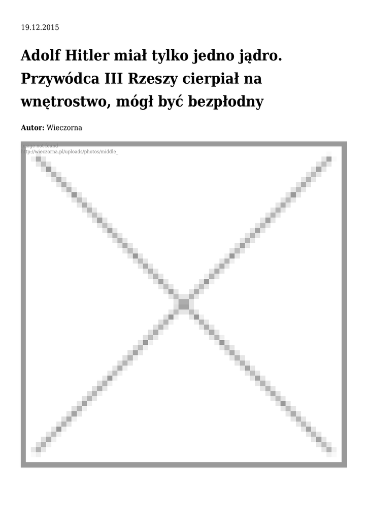 19.12.2015 Adolf Hitler miał tylko jedno jądro. Przywódca III Rzeszy cierpiał na wnętrostwo, mógł być bezpłodny Autor: Wieczorna Image not found http://wieczorna.pl/uploads/photos/middle_ (Źródło: http://www.polskatimes.pl/artykul/9209796,adolf-hitler-mial-tylko-jedno-jadroprzywodca-iii-rzeszy-cierpial-na-wnetrostwo-mogl-byc-bezplodny,id,t.html) Analiza dawno zaginionych notatek medycznych wydaje się potwierdzać, że niemiecki przywódca cierpiał na wnętrostwo – podaje brytyjski „The Guardian.” O tym, że Adolf Hitler miał tylko jedno jądro, spekulowano od lat.