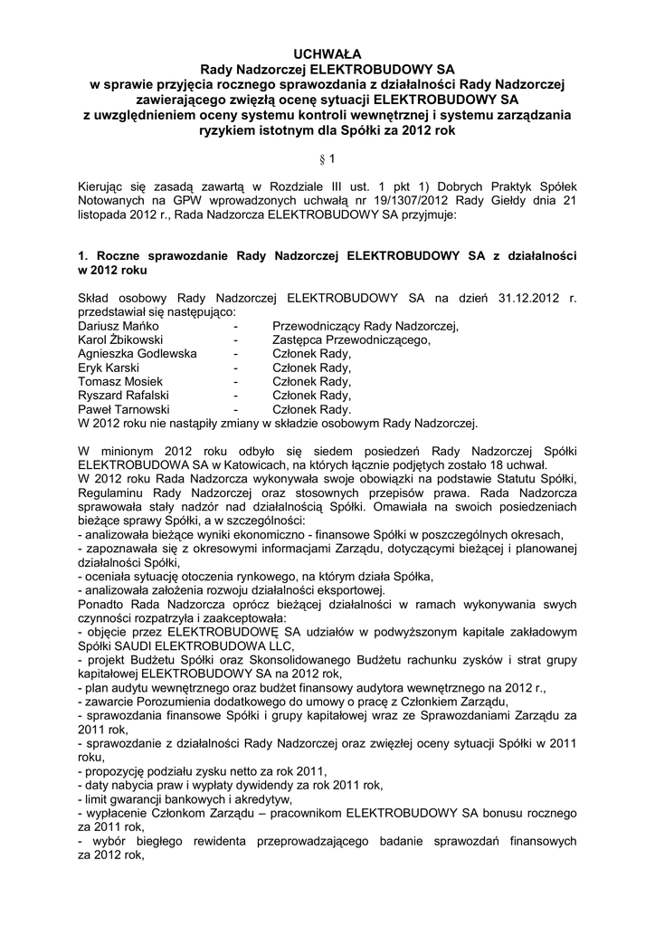 UCHWAŁA Rady Nadzorczej ELEKTROBUDOWY SA w sprawie przyjęcia rocznego sprawozdania z działalności Rady Nadzorczej zawierającego zwięzłą ocenę sytuacji ELEKTROBUDOWY SA z uwzględnieniem oceny systemu kontroli wewnętrznej i systemu zarządzania ryzykiem istotnym dla Spółki za 2012 rok §1 Kierując się zasadą zawartą w Rozdziale III ust. 1 pkt 1) Dobrych Praktyk Spółek Notowanych na GPW wprowadzonych uchwałą nr 19/1307/2012 Rady Giełdy dnia 21 listopada 2012 r., Rada Nadzorcza ELEKTROBUDOWY SA przyjmuje: 1. Roczne sprawozdanie Rady Nadzorczej ELEKTROBUDOWY SA z działalności w 2012 roku Skład osobowy Rady Nadzorczej ELEKTROBUDOWY SA na dzień 31.12.2012 r. przedstawiał się następująco: Dariusz Mańko Przewodniczący Rady Nadzorczej, Karol Żbikowski Zastępca Przewodniczącego, Agnieszka Godlewska Członek Rady, Eryk Karski Członek Rady, Tomasz Mosiek Członek Rady, Ryszard Rafalski Członek Rady, Paweł Tarnowski Członek Rady. W 2012 roku nie nastąpiły zmiany w składzie osobowym Rady Nadzorczej. W minionym 2012 roku odbyło się siedem posiedzeń Rady Nadzorczej Spółki ELEKTROBUDOWA SA w Katowicach, na których łącznie podjętych zostało 18 uchwał. W 2012 roku Rada Nadzorcza wykonywała swoje obowiązki na podstawie Statutu Spółki, Regulaminu Rady Nadzorczej oraz stosownych przepisów prawa. Rada Nadzorcza sprawowała stały nadzór nad działalnością Spółki. Omawiała na swoich posiedzeniach bieżące sprawy Spółki, a w szczególności: - analizowała bieżące wyniki ekonomiczno - finansowe Spółki w poszczególnych okresach, - zapoznawała się z okresowymi informacjami Zarządu, dotyczącymi bieżącej i planowanej działalności Spółki, - oceniała sytuację otoczenia rynkowego, na którym działa Spółka, - analizowała założenia rozwoju działalności eksportowej. Ponadto Rada Nadzorcza oprócz bieżącej działalności w ramach wykonywania swych czynności rozpatrzyła i zaakceptowała: - objęcie przez ELEKTROBUDOWĘ SA udziałów w podwyższonym kapitale zakładowym Spółki SAUDI ELEKTROBUDOWA LLC, - projekt Budżetu Spółki oraz Skonsolidowanego Budżetu rachunku zysków i strat grupy kapitałowej ELEKTROBUDOWY SA na 2012 rok, - plan audytu wewnętrznego oraz budżet finansowy audytora wewnętrznego na 2012 r., - zawarcie Porozumienia dodatkowego do umowy o pracę z Członkiem Zarządu, - sprawozdania finansowe Spółki i grupy kapitałowej wraz ze Sprawozdaniami Zarządu za 2011 rok, - sprawozdanie z działalności Rady Nadzorczej oraz zwięzłej oceny sytuacji Spółki w 2011 roku, - propozycję podziału zysku netto za rok 2011, - daty nabycia praw i wypłaty dywidendy za rok 2011 rok, - limit gwarancji bankowych i akredytyw, - wypłacenie Członkom Zarządu – pracownikom ELEKTROBUDOWY SA bonusu rocznego za 2011 rok, - wybór biegłego rewidenta przeprowadzającego badanie sprawozdań finansowych za 2012 rok, - powołanie Prezesa i Członków Zarządu Spółki na kolejną kadencję, - zasady wynagrodzenia bonusowego dla Członków Zarządu – pracowników ELEKTROBUDOWY SA na 2012 rok, - zakres sprawozdawczości okresowej dla Rady Nadzorczej Spółki, - nabycie nieruchomości w Katowicach, - zabezpieczenie kredytu bankowego zastawem rejestrowym na elementach majątku Spółki. W skład Rady Nadzorczej w 2012 roku wchodziły dwa komitety: Komitet Audytu oraz Komitet Nominacji i Wynagrodzeń. Skład osobowy Komitetu Audytu na dzień 31.12.2012 r. przedstawiał się następująco: Tomasz Mosiek – Przewodniczący Komitetu, Eryk Karski – Członek Komitetu, Paweł Tarnowski – Członek Komitetu. W 2012 roku nie nastąpiły zmiany w składzie osobowym Komitetu Audytu. W minionym roku odbyło się sześć posiedzeń Komitetu Audytu. Komitet służył pomocą Radzie Nadzorczej w wypełnianiu statutowych obowiązków poprzez przegląd oraz przygotowanie rekomendacji w zakresie następujących zagadnień: 1. Zachowanie niezależności biegłego rewidenta Zgodnie z zaleceniami Komisji z dnia 15 lutego 2005 r. (2005/162/WE, zał.1 pkt 1.6.2) Komitet Audytu potwierdza, iż jest zadowolony z niezależności procesu audytu w Spółce. Wypełnione są zasady niezależności przewidujące wymóg zmiany Audytora Spółki raz na 5 lat. Obecny Audytor Spółki firma Deloitte Audyt Sp. z o.o. przeprowadził audyt za lata 20092012, spełniając tym samym kryteria określone w Ustawie z dnia 7 maja 2009 r. o biegłych rewidentach i ich samorządzie, podmiotach uprawnionych do badania sprawozdań finansowych oraz o nadzorze publicznym (w szczególności w Art. 89). Kontroli Komitetu Audytu podlegały ponadto charakter i zakres usług pozarewidenckich. 2. Monitorowanie rzetelności informacji finansowych Podobnie jak w latach poprzednich Komitet Audytu monitorował sytuację finansową Spółki w oparciu o dokonywany z podziałem na poszczególne segmenty działalności Spółki, schemat raportowania międzyokresowych wyników finansowych w ramach posiedzeń Rady Nadzorczej. Komitet Audytu zaproponował, aby rozszerzeniu i większemu uszczegółowieniu uległ zakres raportowania Spółki na potrzeby Rady Nadzorczej. Rada Nadzorcza podjęła w tym zakresie stosowną uchwałę. W zakresie monitorowania raportowania finansowego przedmiotem szczególnego zainteresowania Komitetu Audytu były dodatkowo następujące kwestie: - sytuacja finansowa Spółki ELEKTROBUDOWA SA i podjęte działania w związku z problemami finansowymi niektórych kontrahentów Spółki. - zapoznanie się z diagnozą niepokojącej od strony wyników finansowych sytuacji w Rynku Przemysłu. - bieżąca sytuacja na kontrakcie w Finlandii oraz stan rozliczeń związanych z kontraktem na Stadionie Narodowym. - bieżąca sytuacja finansowa, ogólno – biznesowa oraz relacje pomiędzy udziałowcami w spółkach wschodnich. Ponadto Komitet Audytu w minionym roku w ramach monitorowania rzetelności informacji finansowych: - omówił z Audytorem Spółki oraz Dyrektorem Finanso