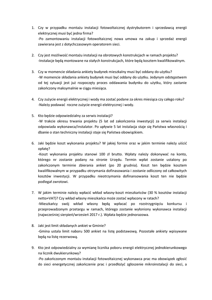 1. Czy w przypadku montażu instalacji fotowoltaicznej dystrybutorem i sprzedawcą energii elektrycznej musi być jedna firma? -Po zamontowaniu instalacji fotowoltaicznej nowa umowa na zakup i sprzedaż energii zawierana jest z dotychczasowym operatorem sieci. 2. Czy jest możliwość montażu instalacji na obrotowych konstrukcjach w ramach projektu? -Instalacje będą montowane na stałych konstrukcjach, które będą kosztem kwalifikowalnym. 3. Czy w momencie składania ankiety budynek mieszkalny musi być oddany do użytku? -W momencie składania ankiety budynek musi być oddany do użytku. Jedynym odstępstwem od tej sytuacji jest już rozpoczęty proces oddawania budynku do użytku, który zastanie zakończony maksymalnie w ciągu miesiąca. 4. Czy zużycie energii elektrycznej i wody ma zostać podane za okres miesiąca czy całego roku? -Należy podawać roczne zużycie energii elektrycznej i wody. 5. Kto będzie odpowiedzialny za serwis instalacji? -W trakcie okresu trwania projektu (5 lat od zakończenia inwestycji) za serwis instalacji odpowiada wykonawca/instalator. Po upływie 5 lat instalacja staje się Państwa własnością i dbanie o stan techniczny instalacji staje się Państwa obowiązkiem. 6. Jaki będzie koszt wykonania projektu? W jakiej formie oraz w jakim terminie należy uiścić opłatę? -Koszt wykonania projektu stanowi 100 zł brutto. Wpłaty należy dokonywać na konto, którego nr zostanie podany na stronie Urzędu. Termin wpłat zostanie ustalony po zakończonym terminie zbierania ankiet (po 20 grudnia). Koszt ten będzie kosztem kwalifikowalnym w przypadku otrzymania dofinasowania i zostanie odliczony od całkowitych kosztów inwestycji. W przypadku nieotrzymania dofinansowania koszt ten nie będzie podlegał zwrotowi. 7. W jakim terminie należy wpłacić wkład własny-koszt mieszkańców (30 % kosztów instalacji netto+VAT)? Czy wkład własny mieszkańca może zostać wpłacony w ratach? -Mieszkańcy swój wkład własny będą wpłacać po rozstrzygnięciu konkursu i przeprowadzonym przetargu w ramach, którego zostanie wyłoniony wykonawca instalacji (najwcześniej sierpień/wrzesień 2017 r.). Wpłata będzie jednorazowa. 8. Jaki jest limit składanych ankiet w Gminie? -Gmina ustala limit naboru 500 ankiet na listę podstawową. Pozostałe ankiety wpisywane będą na listę rezerwową. 9. Kto jest odpowiedzialny za wymianę licznika poboru energii elektrycznej jednokierunkowego na licznik dwukierunkowy? -Po zakończonym montażu instalacji fotowoltaicznej wykonawca prac ma obowiązek zgłosić do sieci energetycznej zakończenie prac i przedłożyć zgłoszenie mikroinstalacji do sieci, a operator sieci w ciągu 30 dni ma obowiązek na własny koszt wymienić obecny licznik na licznik dwukierunkowy. 10. Czy budynek w okresie trwałości projektu (5 lat) musi być ubezpieczony? -W okresie trwałości projektu budynek musi być ubezpieczony, a ubezpieczyciel musi zostać poinformowany o zamontowaniu instalacji. 11. Jaki będzie orientacyjny koszt instalacji przy 23% podatku VAT? Rodzaj instalacji Kolektory słoneczne Instalacje fotowoltaiczne Szacunkowy koszty inwestycji bez dotacji (netto) dotacja 30% podatek VAT 23% (instalacja na gruncie lub dachu poza obrębem budynku) koszt mieszkańca 200 l 9 000,00 zł 2 700,00 zł 2 070,00 zł 5 490,00 zł 300 l 10 000,00 zł 3 000,00 zł 2 300,00 zł 6 100,00 zł 400 l 12 000,00 zł 3 600,00 zł 2 760,00 zł 7 320,00 zł 2 kW 13 000,00 zł 3 900,00 zł 2 990,00 zł 7 930,00 zł 3 kW 19 000,00 zł 5 700,00 zł 4 370,00 zł 11 590,00 zł 4 kW 25 000,00 zł 7 500,00 zł 5 750,00 zł 15 250,00 zł 12. Jaką ilość energii elektrycznej w ciągu roku wyprodukuje instalacja fotowoltaiczna ? -Instalacja fotowoltaiczna o mocy 1 kW w trakcie roku wyprodukuje około 1000 kWh, 2 kWokoło 2000 kWh, 3 kW- około 3000 kWh, 4 kW- około 4000 kWh. 13. Czy w okresie trwałości projektu można zmienić obecne źródło ciepła w budynku? -W okresie 5 lat można zmienić źródło ciepła, jednak przed jakimikolwiek zmianami należy, je zgłosić w Urzędzie Gminy. 14. Kto jest producentem montowanego sprzętu ? -Wykonawca prac instalatorskich oraz wybór montowanego sprzętu zostanie rozstrzygnięty w ramach przeprowadzonego przetargu. 15. Jaki jest okres gwarancji na montowany sprzęt? -Gwarancja na sprzęt obejmuje cały okres trwałości projektu – 5 lat od zakończenia montażu. 16. W jaki sposób instalacje będą montowane na dachach o orientacji wschód-zachód? -W przypadku dachów o orientacji wschód-zachód instalacje montowane są na dwa sposoby. Jeden z nich zakłada montaż części paneli po stronie wschodniej, a części po stronie zachodniej. Drugi sposób to montaż paneli w układzie proporcjonalnej ilości płyt po obu stronach połaci dachowych( np. 2x2, 2x1). 17. Jaki rodzaj zbiornika będzie montowany w instalacjach solarnych? -Dokładny typ montowanego zbiornika, a także całości instalacji, będzie znany po rozstrzygnięciu przetargu. W komplecie z kolektorami słonecznymi będą montowane zbiorniki dwuwężownicowe. 18. Jakiego typu kolektory słoneczne będą montowane? -W ramach projektu będą montowane płaskie kolektory słoneczne. 19. Czy instalacje przy pochmurnej pogodzie działają? -W trakcie pochmurnej pogody zarówno instalacje fotowoltaiczne jak i kolektory słoneczne są mniej wydajne, ale nie zatrzymuje to całkowicie produkcji energii cieplnej i elektrycznej. 20. Czy po upływie 5 lat (okres trwałości projektu) instalację fotowoltaiczną można odłączyć od sieci energetycznej i zamontować akumulatory? -Po upływie trwałości projektu na własny koszt można zakupić akumulatory i podłączyć do nich instalację fotowoltaiczną. 21. Czy koszt konstrukcji/stelażu jest kosztem kwalifikowalnym w części dofinansowywanym, czy w całości pokrywa go mieszkaniec gminy? -Konstrukcja/ stelaż jest kosztem kwalifikowalnym instalacji. 22. Czy instalacja fotowoltaiczna może mieć