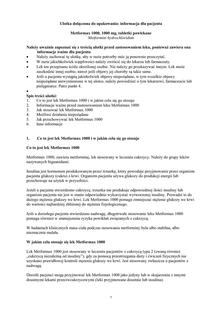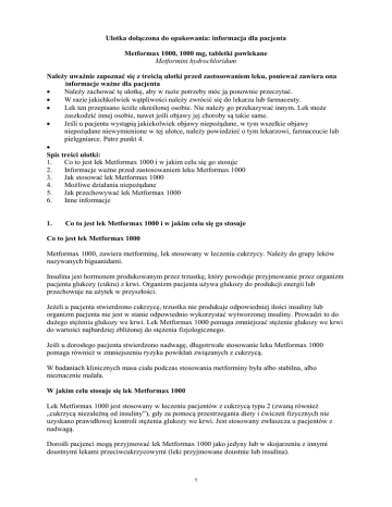 Ulotka dołączona do opakowania: informacja dla pacjenta Metformax 1000, 1000 mg, tabletki powlekane Metformini hydrochloridum Należy uważnie zapoznać się z treścią ulotki przed zastosowaniem leku, ponieważ zawiera ona informacje ważne dla pacjenta Należy zachować tę ulotkę, aby w razie potrzeby móc ją ponownie przeczytać. W razie jakichkolwiek wątpliwości należy zwrócić się do lekarza lub farmaceuty. Lek ten przepisano ściśle określonej osobie. Nie należy go przekazywać innym. Lek może zaszkodzić innej osobie, nawet jeśli objawy jej choroby są takie same. Jeśli u pacjenta wystąpią jakiekolwiek objawy niepożądane, w tym wszelkie objawy niepożądane niewymienione w tej ulotce, należy powiedzieć o tym lekarzowi, farmaceucie lub pielęgniarce. Patrz punkt 4. Spis treści ulotki: 1. Co to jest lek Metformax 1000 i w jakim celu się go stosuje 2. Informacje ważne przed zastosowaniem leku Metformax 1000 3. Jak stosować lek Metformax 1000 4. Możliwe działania niepożądane 5. Jak przechowywać lek Metformax 1000 6. Inne informacje 1. Co to jest lek Metformax 1000 i w jakim celu się go stosuje Co to jest lek Metformax 1000 Metformax 1000, zawiera metforminę, lek stosowany w leczeniu cukrzycy. Należy do grupy leków nazywanych biguanidami. Insulina jest hormonem produkowanym przez trzustkę, który powoduje przyjmowanie przez organizm pacjenta glukozy (cukru) z krwi. Organizm pacjenta używa glukozy do produkcji energii lub przechowuje na użytek w przyszłości. Jeżeli u pacjenta stwierdzono cukrzycę, trzustka nie produkuje odpowiedniej ilości insuliny lub organizm pacjenta nie jest w stanie odpowiednio wykorzystać wytworzonej insuliny. Prowadzi to do dużego stężenia glukozy we krwi. Lek Metformax 1000 pomaga zmniejszać stężenie glukozy we krwi do wartości najbardziej zbliżonej do stężenia fizjologicznego. Jeśli u dorosłego pacjenta stwierdzono nadwagę, długotrwałe stosowanie leku Metformax 1000 pomaga również w zmniejszeniu ryzyka powikłań związanych z cukrzycą. W badaniach klinicznych masa ciała podczas stosowania metforminy była albo stabilna, albo nieznacznie malała. W jakim celu stosuje się lek Metformax 1000 Lek Metformax 1000 jest stosowany w leczeniu pacjentów z cukrzycą typu 2 (zwaną również „cukrzycą niezależną od insuliny”), gdy za pomocą przestrzegania diety i ćwiczeń fizycznych nie uzyskano prawidłowej kontroli stężenia glukozy we krwi. Jest stosowany zwłaszcza u pacjentów z nadwagą. Dorośli pacjenci mogą przyjmować lek Metformax 1000 jako jedyny lub w skojarzeniu z innymi doustnymi lekami przeciwcukrzycowymi (leki przyjmowane doustnie lub insulina). 1 Dzieci w wieku 10 lat lub powyżej oraz młodzież, mogą przyjmować lek Metformax 1000 jako jedyny lub w skojarzeniu z insuliną. 2. Informacje ważne przed zastosowaniem leku Metformax 1000 Kiedy nie stosować leku Metformax 1000 Jeśli u pacjenta stwierdzono uczulenie na metforminę lub na którykolwiek z pozostałych składników tego leku (wymienionych w punkcie 6). Jeśli u pacjenta występują zaburzenia czynności nerek lubwątroby . Jeśli u pacjenta występuje niekontrolowana cukrzyca, np. taka jak ciężka hiperglikemia (wysoki poziom glukozy we krwi, nudności, wymioty, odwodnienie, szybka utrata masy ciała) lub kwasica ketonowa. Kwasica ketonowa jest stanem, w którym substancje zwane „ciałami ketonowymi” gromadzą się we krwi, co może prowadzić do stanu przed śpiączką cukrzycową. Objawy to: ból brzucha, szybkie i głębokie oddychanie, senność lub nienaturalny owocowy zapach oddechu. Jeśli pacjent stracił zbyt dużo wody z organizmu (odwodnienie), np. w wyniku długo trwającej lub ciężkiej biegunki lub jeżeli pacjent wymiotował kilka razy w krótkim czasie. Odwodnienie może prowadzić do zaburzeń czynności nerek, które mogą zwiększyć ryzyko kwasicy mleczanowej (patrz „ Ostrzeżenia i środki ostrożności”, poniżej). Jeśli u pacjenta stwierdzono ciężkie zakażenie, takie jak zakażenia płuc, układu oddechowego lub nerek. Ciężkie zakażenia mogą prowadzić do zaburzeń czynności nerek, które mogą zwiększyć ryzyko kwasicy mleczanowej (patrz „Ostrzeżenia i środki ostrożności”, poniżej”). Jeśli pacjent stosuje leki na niewydolność serca, przebył niedawno atak serca lub ma duże zaburzenia krążenia lub trudności z oddychaniem. Może to prowadzić do niedoboru tlenu w tkankach co może zwiększyć ryzyko kwasicy mleczanowej (patrz „Ostrzeżenia i środki ostrożności”, poniżej). Jeśli pacjent spożywa alkohol w dużych ilościach. Jeżeli którykolwiek z powyższych czynników dotyczy pacjenta, należy skontaktować się z lekarzem przed rozpoczęciem stosowania tego leku. Należy upewnić się, czy lekarz wyjaśnił wszystkie wątpliwości, jeżeli: U pacjenta trzeba wykonać badanie rentgenowskie lub tomografię z donaczyniowym zastosowaniem środka kontrastującego zawierającego jod. U pacjenta trzeba przeprowadzić zabieg chirurgiczny (operację). Należy odstawić lek Metformax 1000 na określony okres czasu przed badaniem lub zabiegiem chirurgicznym i po ich wykonaniu. Lekarz zaleci inne leczenie, jeżeli stan pacjenta będzie tego wymagał. Ważne jest, aby dokładnie zastosować się do zaleceń lekarza. Ostrzeżenia i środki ostrożności Przed rozpoczęciem stosowania leku Metformax 1000 należy omówić to z lekarzem lub farmaceutą. Metformina może wywołać bardzo rzadkie, ale ciężkie powikłanie zwane kwasicą mleczanową, szczególnie jeżeli nerki u pacjenta nie funkcjonują prawidłowo. Ryzyko kwasicy mleczanowej jest również zwiększone w przypadku cukrzycy niewyrównanej, głodzenia się lub nadużywania alkoholu,, deficytu płynów w organizmie (odwodnienia) z powodu ciężkiej biegunki lub wymiotów, schorzeń wątroby oraz wszelkich innych schorzeń, w których pewne obszary ciała pozbawione są tlenu (np. ciężkie choroby ser