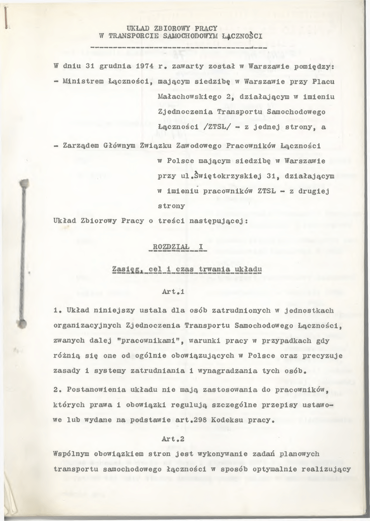 UKŁAD ZBIOROWY PRACY W TRANSPORCIE SAMOCHODOWYM ŁĄCZNOŚCI W dniu 31 grudnia 1974 r. zawarty został w Warszawie pomiędzy: - Ministrem Łączności, mającym siedzibę w Warszawie przy Placu Małachowskiego 2, działającym w imieniu Zjednoczenia Transportu Samochodowego Łączności /ZTSŁ/ - z jednej strony, a - Zarządem Głównym Związku Zawodowego Pracowników Łączności w Polsce mającym siedzibę w Warszawie przy ul.Świętokrzyskiej 31, działającym w imieniu pracowników ZTSŁ - z drugiej strony Układ Zbiorowy Pracy o treści następującej: J10ZDZIĄŁ_I_ Art.l 1. Układ niniejszy ustala dla osób zatrudnionych w jednostkach organizacyjnych Zjednoczenia Transportu Samochodowego Łączności, zwanych dalej "pracownikami”, warunki pracy w przypadkach gdy różnią się one od ogólnie obowiązujących w Polsce oraz precyzuje zasady i systemy zatrudniania i wynagradzania tych osób* 2. Postanowienia układu nie mają zastosowania do pracowników, których prawa i obowiązki regulują szczególne przepisy ustawo we lub wydane na podstawie art.298 Kodeksu pracy. Art.2 Wspólnym obowiązkiem stron jest wykonywanie zadań planowych transportu samochodowego łączności w sposób optymalnie realizujący UKŁAD ZBIOROWY PRACY W TRANSPORCIE SAMOCHODOWYM ŁĄCZNOŚCI W dniu 31 grudnia 1974 r. zawarty został w Warszawie pomiędzy: - Ministrem Łączności, mającym siedzibę w Warszawie przy Placu Małachowskiego 2, działającym w imieniu Zjednoczenia Transportu Samochodowego Łączności /ZTSŁ/ - z jednej strony, a - Zarządem Głównym Związku Zawodowego Pracowników Łączności w Polsce mającym siedzibę w Warszawie przy ul.Świętokrzyskiej 31, działającym w imieniu pracowników ZTSŁ - z drugiej strony Układ Zbiorowy Pracy o treści następującej: JtOZDZIAŁ___I_ Zasi£gx_cel_i_czas_trwania_układu Art.i 1. Układ niniejszy ustala dla osób zatrudnionych w jednostkach organizacyjnych Zjednoczenia Transportu Samochodowego Łączności, zwanych dalej "pracownikami”, warunki pracy w przypadkach gdy różnią się one od ogólnie obowiązujących w Polsce oraz precyzuje zasady i systemy zatrudniania i wynagradzania tych osób. 2. Postanowienia układu nie mają zastosowania do pracowników, których prawa i obowiązki regulują szczególne przepisy ustawo we lub wydane na podstawie art.298 Kodeksu pracy. Art.2 Wspólnym obowiązkiem stron jest wykonywanie zadań planowych transportu samochodowego łączności w sposób optymalnie realizujący w dniu W *2P -r m e j o U /y/s y //Q/yHjrjQto( r j (>(yyy>GdhćdO tiyhf n; 'W^c&h'^..... ........ -*... r... ..... zawo: y w dr,ju ... ciijwiązujący cć dala.. ................................ ?<?...... slron ze wi«ra)qc> ....r... Ukła i '• j ■> 5 la wani cel istnienia Zjednoczenia TSŁ oraz stałe podnoszenie jakości usług, wydajności i dyscypliny pracy, przy jednoczes nym trwałym polepszeniu bytu pracowników. Art .3 Jeżeli w układzie lub jego załącznikach: S S ł ® ż x _2rzez_to_roz^ieó UZP - niniejszy układ zbiorowy pracy ZG ZZPŁ - Zarząd Główny Związku Zawodowe go Pracowników Łączności w Polsce . - Zjednoczenie Transportu Samocho ZTSŁ dowego Łączności - jako całośó - przedsiębiorstwa transportu sa PTSŁ mochodowego Łączności - jako całośó TSŁ - transport samochodowy łączności zakład pracy - odpowiednio: - Centralę ZTSŁ - bazy PTSŁ - oddziały i ekspo zytury PTSŁ - placówki PTSŁ /wyodrębni one/ - wyodrębnione, inne niż podano wyżej, jednostki organizacyjne ZTSŁ i PTSŁ Naczelny Dyrektor ZTSŁ - Naczelny Dyrektor Zjednoczenia TSŁ Art. 4 Układ wchodzi w życie od dnia i stycznia 1975 r. Przed upływem 5 lat od tej daty strony dokonają oceny układu w celu zaktualizo wania go. Art.5 Jeżeli pracownik używa - za zgodą zakładu pracy - własnych narzędzi lub innych środków pracy należy mu się wynagrodzenie za ich zużycie w wysokości ustalonej ogólnymi przepisami lub przy ich braku przez zakład pracy i właściciela. Art .6 Pracownik zostaje przyjęty do pracy w miejscowości określonej umową. ' Art.7 1. Dla pracowników zatrudnionych w uciążliwych lub szkodliwych warunkach pracy może byó zastosowany na podstawie ogólnie obowią zujących przepisów skrócony czas pracy lub urlopy dodatkowe. 2. Do świadczeń, o których mowa w ust.l, uprawnieni są-w określo nych wymiarach - pracownicy zatrudnieni na stanowiskach wymienio nych w załączniku Nr 3. Art. 8 1. Za czas pracy w porze nocnej między godzinami 22,00 a 6,00 pracownikom przysługuje dodatek w wysokości 15 % płacy zasadniczej 2. Kierowcom i innym pracownikom zatrudnionym przy przewozach dystrybucyjnych stale w porze nocnej przysługuje dodatek w wyso kości 20 % płacy zasadniczej. 3. Dodatki za pracę nocną /ust.l/ przysługują pracownikom na stanowiskach kierowniczych, dla których praca w porze nocnej wynika z harmonogramu; nie przysługują natomiast za pracę wykony waną w nocy sporadycznie /poza normalnym czasem pracy/, za którą nie przysługuje oddzielne wynagrodzenie, zgodnie z art.135 § 1 Kodeksu pracy. Art .9 1 # Pracownikom pracującym w warunkach uciążliwych lub szkodli wych dla zdrowia, za godziny pracy w tych warunkach przysługują - oprócz świadczeń wynikających z przepisów o bezpieczeństwie i higienie pracy - dodatki do płac w wysokości od 0,50 do 1,50 zł. 2. Pracownikom przysługują dodatki za pracę w warunkach szkodli wych dla zdrowia, uciążliwych lub niebezpiecznych w wysokości uzależnionej od stopnia szkodliwości, uciążliwości lub niebezpieczeństwa. 3. Dodatki powyższe przysługują, jeżeli: i/ praca wykonywana jest stale w warunkach nie zachowania obowiązujących norm higienicznych pracy oraz 2/ warunków tych zakład pracy nie jest w stanie w krótkim czasie poprawió w dostatecznym stopniu dostępnymi środ kami • 4. Dodatki przysługują do czasu zapewnienia na danym stanowisku pracy warunków odpowiadających obowiązującym higieni