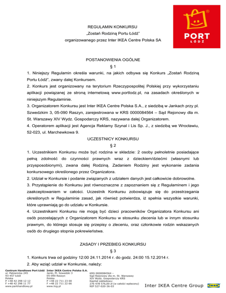REGULAMIN KONKURSU „Zostań Rodziną Portu Łódź” organizowanego przez Inter IKEA Centre Polska SA POSTANOWIENIA OGÓLNE §1 1. Niniejszy Regulamin określa warunki, na jakich odbywa się Konkurs „Zostań Rodziną Portu Łódź”, zwany dalej Konkursem. 2. Konkurs jest organizowany na terytorium Rzeczypospolitej Polskiej przy wykorzystaniu aplikacji powiązanej ze stroną internetową www.portlodz.pl, na zasadach określonych w niniejszym Regulaminie. 3. Organizatorem Konkursu jest Inter IKEA Centre Polska S.A., z siedzibą w Jankach przy pl. Szwedzkim 3, 05-090 Raszyn, zarejestrowana w KRS 0000084564 – Sąd Rejonowy dla m. St. Warszawy XIV Wydz. Gospodarczy KRS, nazywana dalej Organizatorem. 4. Operatorem aplikacji jest Agencja Reklamy Szynal i Lis Sp. J., z siedzibą we Wrocławiu, 52-023, ul. Marchewkowa 9. UCZESTNICY KONKURSU §2 1. Uczestnikiem Konkursu może być rodzina w składzie: 2 osoby pełnoletnie posiadające pełną zdolność do czynności prawnych wraz z dzieckiem/dziećmi (własnymi lub przysposobionymi), zwana dalej Rodziną. Zadaniem Rodziny jest wykonanie zadania konkursowego określonego przez Organizatora. 2. Udział w Konkursie i podanie związanych z udziałem danych jest całkowicie dobrowolne. 3. Przystąpienie do Konkursu jest równoznaczne z zapoznaniem się z Regulaminem i jego zaakceptowaniem w całości. Uczestnik Konkursu zobowiązuje się do przestrzegania określonych w Regulaminie zasad, jak również potwierdza, iż spełnia wszystkie warunki, które uprawniają go do udziału w Konkursie. 4. Uczestnikami Konkursu nie mogą być dzieci pracowników Organizatora Konkursu ani osób pozostających z Organizatorem Konkursu w stosunku zlecenia lub w innym stosunku prawnym, do którego stosuje się przepisy o zleceniu, oraz członkowie rodzin wskazanych osób do drugiego stopnia pokrewieństwa. ZASADY I PRZEBIEG KONKURSU §3 1. Konkurs trwa od godziny 12:00 24.11.2014 r. do godz. 24:00 15.12.2014 r. 2. Aby wziąć udział w Konkursie, należy: a. wejść na stronę www.portlodz.pl (zakładka „Konkurs”) i przejść do rejestracji na stronie konkursowej www.rodzina.portlodz-konkurs.pl, wypełniając wszystkie wymagane pola, b. umieścić w aplikacji konkursowej na stronie www.portlodz-konkurs.pl aktualne zdjęcie prezentujące Rodzinę; zdjęcie musi przedstawiać Rodzinę uczestnika Konkursu, zgodnie z definicją zawartą w § 2 pkt.1 Regulaminu. Na zdjęciu muszą się znaleźć wszyscy członkowie Rodziny (2 osoby pełnoletnie oraz wszystkie dzieci). 3. Uczestnik ma możliwość zamieszczenia tylko jednego zdjęcia Rodziny. Uczestnik nie ma możliwości późniejszej zmiany zamieszczonego zdjęcia Rodziny. 4. Uczestnik Konkursu może być zarejestrowany w aplikacji przy użyciu tylko jednego adresu mailowego; korzystanie z kilku adresów mailowych przez jednego Uczestnika spowoduje odrzucenie kolejnych zgłoszeń – do celów konkursowych brane będzie pod uwagę wyłącznie pierwsze zgłoszenie Uczestnika. Organizator zastrzega sobie prawo kontroli uczciwości w Konkursie i eliminowania zgłoszeń naruszających zasady niniejszego regulaminu. 5. Zamieszczenie w aplikacji konkursowej zdjęcia jest równoznaczne z oświadczeniem przez Uczestnika Konkursu, że posiada on do niego prawa autorskie oraz że zamieszczane zdjęcia przedstawiają jego samego oraz jego rodzinę i nie naruszają praw osób trzecich, w szczególności praw autorskich oraz dóbr osobistych. 6. Maksymalny rozmiar zdjęcia zamieszczonego w aplikacji konkursowej to 1 MB. 7. Zdjęcia Uczestników Konkursu podlegają ocenie Jury oraz ocenie internautów. 8. Jury zostanie powołane przez Organizatora. W skład Jury wejdą przedstawiciele Organizatora. 9. Spośród nadesłanych zgłoszeń Jury dokona wyboru 5 Rodzin, które zostaną zakwalifikowane do drugiego etapu Konkursu. W drugim etapie Konkursu spośród 5 Uczestników Jury dokona wyboru Rodziny Portu Łódź. 10. Drugi etap Konkursu odbędzie się w dniu 20.12.2014 r. w Centrum Handlowym Port Łódź. 11. O zakwalifikowaniu do drugiego etapu Konkursu Uczestnicy zostaną poinformowani drogą telefoniczną i/lub mailową w dniu 17.12.2014 r. 12. Podmioty, o których mowa w § 3 pkt. 9, zobowiązane są potwierdzić udział w drugim etapie Konkursu do godz. 14.00 w dniu 18.12.2014 r., w przeciwnym razie ich kandydatura może nie być brana pod uwagę. 13. W przypadku, gdy Zwycięzca odmówi udziału w sesji zdjęciowej, Organizator ma prawo wytypować nowego zwycięzcę spośród finalistów. 14.Ogłoszenie wyników drugiego etapu Konkursu nastąpi w dniu 22.12.2014 r. na stronie www.portlodz.pl. 15.Konkurs jest moderowany. Każde zgłoszone do Konkursu zdjęcie, aby wziąć udział w Konkursie, musi zostać zaakceptowane przez moderatorów (w ciągu 24 godzin). Wszystkie zgłoszone zdjęcia, które nie uzyskają akceptacji moderatorów, zostaną z aplikacji konkursowej usunięte bez powiadamiania o tym zgłaszającego. Zgłoszenie zdjęcia nie jest jednoznaczne z przyjęciem go do Konkursu. 16. Internauci mają możliwość głosowania na zdjęcia zamieszczone w aplikacji konkursowej, przy czym konieczność zagłosowania jednorazowo na 3 zdjęcia jest wymuszona systemowo. Głosami internautów wytypowanych zostanie jedna Rodzina (największa ilość głosów), która zostanie nagrodzona. 17. Organizator zastrzega, iż z chwilą przyjęcia zdjęcia do Konkursu nabywa prawa do wykorzystania go w mediach interaktywnych, w szczególności na portalu Facebook.com i na stronie Konkursowej oraz na stronie www.portlodz.pl. 18. W momencie zgłoszenia do Konkursu Uczestnik Konkursu wyraża zgodę na przetwarzanie swoich danych osobowych przez Organizatora zgodnie z ustawą z dnia 29 sierpnia 1997 o ochronie danych osobowych (Dz. U. z 2002 r. Nr 101, poz. 926) w zakresie niezbędnym do prawidłowego przeprowadzenia Konkursu. Uczestnik posiada prawo dostępu do treści danych przez niego przekazanych, ich poprawiania oraz żądania
