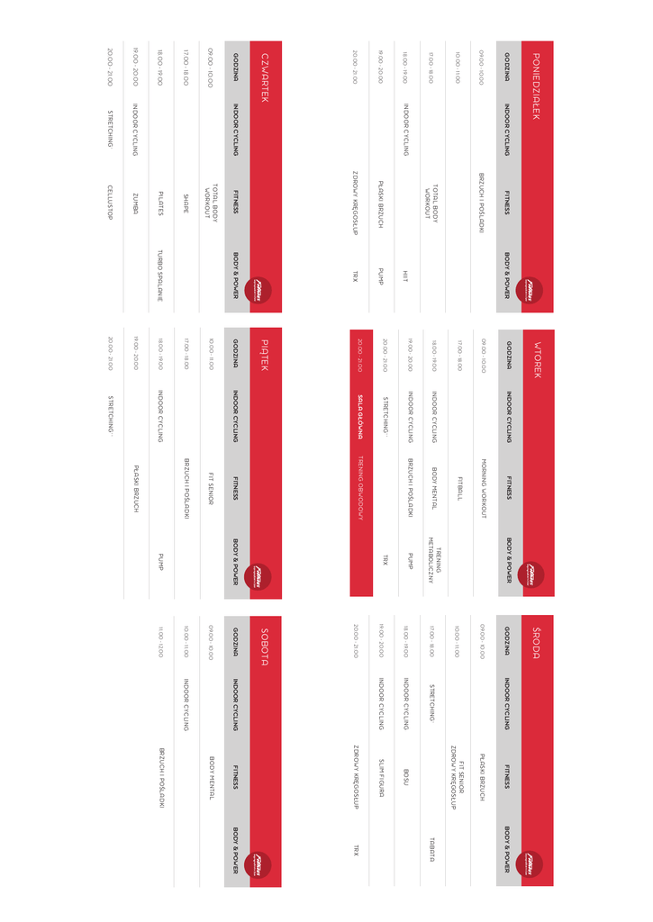 INDOOR CYCLING PONIEDZIAŁEK GODZINA 09.00 - 10.00 10.00 - 11.00 17.00 - 18.00 INDOOR CYCLING FITNESS BRZUCH I POŚLADKI TOTAL BODY WORKOUT BODY & POWER PUMP HIIT PŁASKI BRZUCH TRX 18.00 - 19.00 19.00 - 20.00 ZDROWY KRĘGOSŁUP CZWARTEK WTOREK GODZINA INDOOR CYCLING FITNESS BODY & POWER TRENING METABOLICZNY MORNING WORKOUT BODY MENTAL PUMP 09.00 - 10.00 INDOOR CYCLING BRZUCH I POŚLADKI FITBALL 18.00 - 19.00 INDOOR CYCLING 17.00 - 18.00 19.00 - 20.00 STRETCHING** BODY & POWER TRX 20.00 - 21.00 SALA GŁÓWNA FITNESS TRENING OBWODOWY 20.00 - 21.00 PIĄTEK INDOOR CYCLING ŚRODA INDOOR CYCLING FITNESS PŁASKI BRZUCH GODZINA 09.00 - 10.00 STRETCHING* BOSU FIT SENIOR ZDROWY KRĘGOSŁUP 17.00 - 18.00 INDOOR CYCLING 10.00 - 11.00 18.00 - 19.00 BODY & POWER TABATA TRX SLIM FIGURA ZDROWY KRĘGOSŁUP BODY & POWER BRZUCH I POŚLADKI BODY MENTAL FITNESS INDOOR CYCLING INDOOR CYCLING INDOOR CYCLING 19.00 - 20.00 20.00 - 21.00 SOBOTA GODZINA 09.00 - 10.00 GODZINA FIT SENIOR BODY & POWER 10.00 - 11.00 FITNESS 20.00 - 21.00 INDOOR CYCLING TOTAL BODY WORKOUT 10.00 - 11.00 GODZINA 09.00 - 10.00 BRZUCH I POŚLADKI 11.00 - 12.00 17.00 - 18.00 PUMP SHAPE 19.00 - 20.00 STRETCHING** INDOOR CYCLING 17.00 - 18.00 ZUMBA 20.00 - 21.00 18.00 - 19.00 INDOOR CYCLING CELLUSTOP TURBO SPALANIE PILATES 19.00 - 20.00 STRETCHING* PŁASKI BRZUCH 18.00 - 19.00 20.00 - 21.00 ZAJĘCIA ZORGANIZOWANE NAZWA OPIS ZAJĘĆ BRZUCH I POŚLADKI To forma zajęć, której celem jest wzmocnienie oraz ujędrnienie pośladków i brzucha. Regularne ćwiczenia zapewnią zgrabną sylwetkę, jędrne pośladki, płaski brzuch oraz przyśpieszenie spalania tkanki tłuszczowej. Świetne dla każdej kobiety, która marzy o sylwetce idealnej! TOTAL BODY WORKOUT Trening ukierunkowany na wzmacnianie całego ciała, spalanie tkanki tłuszczowej, wyrzeźbienie sylwetki oraz poprawę kondycji. Pojawiają się ćwiczenia zarówno ze sprzętem jak i tylko z wykorzystaniem masy ciała. Polecany dla osób średniozaawansowanych i zaawansowanych. INDOOR CYCLING Zajęcia odbywające się na specjalnych rowerach stacjonarnych przy akompaniamencie muzyki. Oferta Aquapark Fitness jest wyjątkowa, ponieważ w trakcie zajęć z projektora wyświetlane są filmy, które sprawią, że ćwiczący poczują się jak na wycieczce rowerowej . W trakcie zajęć system Suunto monitoruje parametry pracy serca. HIIT HIIT (High Intensity Interval Training) trening interwałowy o wysokiej intensywności – forma strategii treningu fizycznego polegająca na przeplataniu krótkich okresów bardzo intensywnego wysiłku krótkimi okresami umiarkowanego wysiłku. Ćwiczenia same w sobie są bardzo podstawowe stosowane podczas zwykłych treningów. PŁASKI BRZUCH Grupowe zajęcia nastawione na wzmocnienie i ukształtowanie mięśni brzucha. Trening ten gwarantuje zmniejszenie obwodu talii, wysmuklenie oraz wyrzeźbienie mięśni brzucha. Zajęcia o wysokiej intensywności, przeznaczone dla wszystkich, prowadzone są przy muzyce pod okiem instruktora, który efektywnie motywuje uczestników do ćwiczeń. PUMP Trening dla kobiet i mężczyzn przy użyciu lekkich sztang i obciążeń, kształtujący całe ciało, skutecznie rozwijający wytrzymałość mięśniową, a pośrednio korzystnie wpływający na poprawę metabolizmu. ZDROWY KRĘGOSŁUP Zajęcia oparte na ćwiczeniach rozluźniających, mobilizacyjnych, wzmacniających i równoważnych, mające na celu poprawę postawy ciała oraz zmniejszenie dolegliwości bólowych kręgosłupa spowodowanych siedzącym trybem życia, stresem, asymetrycznym przeciążeniem ciała oraz napięciami mięśniowymi. TRX TRX to trening wykorzystujący pracę z ciężarem własnego ciała do wzmacniania mięśni. Opiera się o zestaw ćwiczeń funkcjonalnych, których celem jest poprawa sprawności osoby ćwiczącej. Regularne sesje treningowe zwiększają siłę, koordynację i gibkość. TRX to doskonałe uzupełnienie klasycznego treningu siłowego i okazja do sprawdzenia poziomu własnej sprawności fizycznej. MORNING WORKOUT Forma zajęć ogólnorozwojowych mających na celu wzmocnienie górnych i dolnych partii mięśniowych ciała. Dalsza część zajęć jest poświęcona ćwiczeniom rozciągającym mającym na celu uelastycznienie mięśni oraz zwiększenie ruchomości stawów. FITBALL Trening wzmacniający wszystkie grupy mięśniowe. Doskonałe rezultaty pracy nad ciałem dzięki niestabilnej powierzchni piłki, która u uczestników wymusza świadomą pracę, technikę i szukanie tzw. balansu ciała. Trening z piłką to połączenie efektów wzmacniających mięśnie, korekcyjnych, stabilizujących i odciążających stawy kręgosłupa. BODY MENTAL Forma zajęć wykorzystująca ćwiczenia relaksujące oraz rozluźniające. Połączenie wszystkich form mentalnych, ze szczególnym nastawieniem na stretching. Polecane dla osób z bólami mięśni oraz kręgosłupa. Regularne ćwiczenia pozwalają przywrócić prawidłową postawę ciała oraz zwiększyć jego mobilność. TRENING METABOLICZNY Jeden z najbardziej efektywnych treningów, skutecznie spala tłuszcz i podkręca nasz metabolizm poprzez zwiększoną potreningową konsumpcję tlenu. Czyli spalamy jeszcze długo po treningu nawet do kilkunastu godzin! Jest to wysiłek krótki, ale intensywny, przeplatany aktywnym wypoczynkiem, czyli treningi interwałowe w różnej formie. Pozwala spalić, więcej tłuszczu niż tradycyjne treningi aerobowe. Polecane dla osób zaawansowanych. STRETCHING */** Zajęcia mające na celu rozciągnięcie całego ciała, rozluźnienie, uelastycznienie wszystkich mięśni oraz zwiększenie zakresu ruchu. Regularne rozciąganie zapobiega nierównowadze mięśniowej oraz problemami bólowymi związanymi z aktywnością fizyczną czy siedząca pracą. * na zajęciach wykorzystywane są podstawowe ćwiczenia rozciągające oparte głównie na stretchingu statycznym. Skierowane dla każdego bez względu na stopień wytrenowania. ** zaawansowany, na zajęciach w