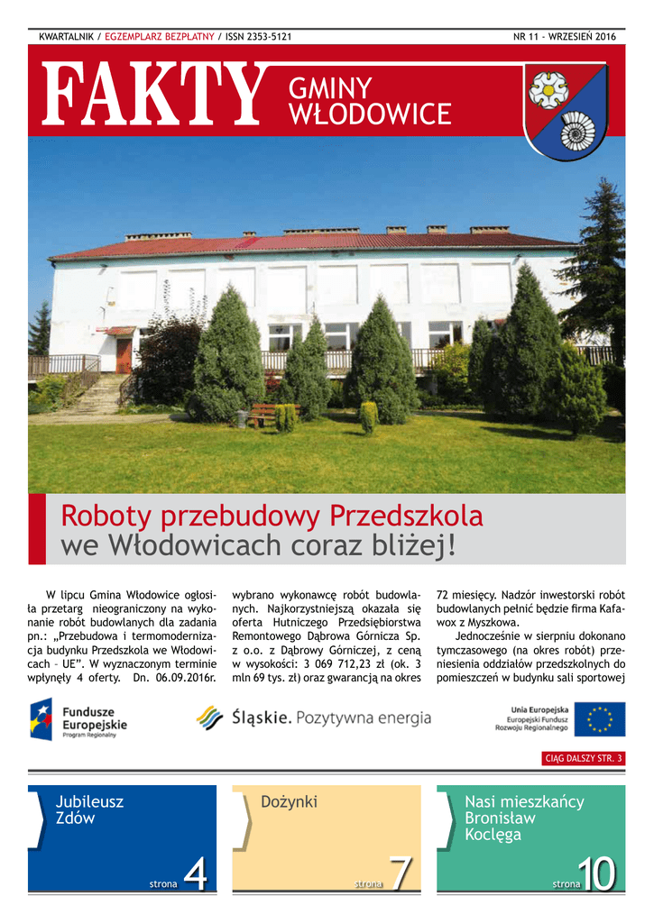 kwartalnik / egzemplarz bezpłatny / ISSN 2353-5121 Nr 11 - wrzesień 2016 GMINY WŁODOWICE Roboty przebudowy Przedszkola we Włodowicach coraz bliżej! W lipcu Gmina Włodowice ogłosiła przetarg nieograniczony na wykonanie robót budowlanych dla zadania pn.: „Przebudowa i termomodernizacja budynku Przedszkola we Włodowicach – UE”. W wyznaczonym terminie wpłynęły 4 oferty. Dn. 06.09.2016r. wybrano wykonawcę robót budowlanych. Najkorzystniejszą okazała się oferta Hutniczego Przedsiębiorstwa Remontowego Dąbrowa Górnicza Sp. z o.o. z Dąbrowy Górniczej, z ceną w wysokości: 3 069 712,23 zł (ok. 3 mln 69 tys. zł) oraz gwarancją na okres 72 miesięcy. Nadzór inwestorski robót budowlanych pełnić będzie firma Kafawox z Myszkowa. Jednocześnie w sierpniu dokonano tymczasowego (na okres robót) przeniesienia oddziałów przedszkolnych do pomieszczeń w budynku sali sportowej ciąg dalszy str. 3 Jubileusz Zdów Dożynki strona 4 strona 7 Nasi mieszkańcy Bronisław Koclęga 10 strona Numer 03 (11)/2016 Fakty Gminy Włodowice 2 ogłoszenie Program rozwojowy Szkół Podstawowych w Gminie Włodowice współfinansowanego ze środków Unii Europejskiej w ramach Europejskiego Funduszu Społecznego Programu w ramach Regionalnego Programu Operacyjnego Województwa Śląskiego na lata 2014-2020 (Europejski Fundusz Społeczny) Głównym celem realizacji projektu jest poprawa jakości edukacji w Szkołach Podstawowych w Gminie Włodowice, której uczniowie oraz nauczyciele będą stanowili grupę docelową projektu. Okres realizacji projektu od 01.09.2016 r. do 30.06.2017 r. Dofinansowanie z UE: 590.303,75 złotych W ramach projektu zapewniamy: • • • • • • Dodatkowe zajęcia dydaktyczno-wyrównawcze; Dodatkowe zajęcia rozwijające; Dodatkowe zajęcia specjalistyczne: Grupowe doradztwo edukacyjno-zawodowe; Koła zainteresowań; Zajęcia efektywnego uczenia się – warsztaty super pamięci i kreatywności; • Zajęcia z robotyki; • Wyjazdy edukacyjne: Dolina Stobrawy, Centrum Kopernika, Obserwatorium Astronomiczne, Kopalnia Srebra i Sztolnia Czarnego Pstrąga; • Szkolenia dla Nauczycieli. GMINY WŁODOWICE Egzemplarz bezpłatny - Kwartalnik Redaktor naczelnA: Sylwia Surowiec Skład redakcji: Małgorzata Konarska, Jolanta Janoska, Barbara Okraska, Elżbieta Trepka, Aneta Wieczorek Adres Redakcji: Urząd Gminy Włodowice ul. Krakowska 26 42-421 Włodowice WYDAWCA: GMINA WŁODOWICE ul. Krakowska 26, 42-421 Włodowice DRUK: media11.pl – Drukarnia Internetowa Al. Kołłątaja 73, 42-500 Będzin Redakcja nie odpowiada za treść ogłoszeń i reklam. Zastrzegamy sobie prawo skracania i adiustacji tekstów oraz zmiany ich tytułów. Materiałów niezamówionych Redakcja nie zwraca. Redakcja nie gwarantuje publikacji niezamówionych materiałów. Redakcja nie zawsze podziela poglądy i opinie zawarte w materiałach drukowanych w Faktach Gminy Włodowice. Udział w projekcie jest bezpłatny! Rekrutacja do projektu: wrzesień 2016r.; wrzesień 2017 r. Ilość miejsc ograniczona: 180 Uczniów/Uczennic; 20 Nauczycieli REALIZATOR PROJEKTU Gmina Włodowice /Centrum Usług Wspólnych Gminy Włodowice Ul. Krakowska 26; 42-421 Włodowice, II piętro, pok.24 Tel: 34 3153056, e-mail.: [email protected] www.cuw-wlodowice.pl, [email protected] Zgłoś! Stowarzyszenie „Dla Gminy Włodowice” oraz Wójt Gminy Włodowice zachęcają do udostępnienia posiadanych przez naszych mieszkańców starych kronik opisujących życie w naszej gminie w minionych latach. Zapewniamy dyskrecję jak również zwrot udostępnionych materiałów. Plakat jest współfinansowany ze środków Unii Europejskiej w ramach Europejskiego Funduszu Społecznego Gmina Włodowice/ Centrum Usług Wspólnych Gminy Włodowice zapraszają Uczniów/Uczennice z klas I-VI oraz Nauczycieli Szkół Podstawowych z terenu Gminy Włodowice (Szkoła Podstawowa im. Władysława Broniewskiego we Włodowicach z filią w Zdowie; Szkoła Podstawowa w Rudnikach) do udziału w projekcie 3 Fakty Gminy Włodowice przy Gimnazjum oraz Szkoły Podstawowej we Włodowicach. Wszystko po to, aby dzieciom oraz personelowi zapewnić bezpieczne warunki funkcjonowania w czasie remontu. Została już podpisana umowa z wykonawcą i ruszą roboty przebudowy i termomodernizacji budynku Przedszkola. W zakresie remontu zaplanowano dostosowanie całego budynku na potrzeby czterooddziałowego przedszkola z zespołem żywienia i salą widowiskową oraz zapleczem administracyjno-magazynowym. Zakres robót obejmuje między innymi: roboty rozbiórkowe; docieplenie budynku; wymianę (uzupełnienie) stolarki okiennej, drzwiowej; uzupełnienie ścian działowych, szybu windy i kominów; budowę instalacji wod – kan, centralnego ogrzewania, ciepłej wody użytkowej, solarnej, p. poż., wentylacji mechanicznej i klimatyzacji, gazowej, elektrycznej, odgromowej, audiowizualnej, komputerowej, telefonicznej, ewidencji pobytu, videofonowej, videobramofonowej, tele- Pytania do… Funkcję Sołtysa piastuje Pani już po raz czwarty, jak ocenia Pani ten czas? Z pewnością wiele się zmieniło w czasie pełnienia przeze mnie funkcji Sołtysa – wybudowano nowe drogi, na bieżąco remontuje się drogi istniejące, powstała sala sportowa oraz boisko „Orlik”. Ze środków na Fundusz Sołecki położono kostkę brukową przy Gminnym Ośrodku Kultury, wybudowano place zabaw dla dzieci, w okolicy Cmentarza Parafialnego wykonano chodniki dla pieszych, a także drogi. Powstała również siłownia plenerowa. Cenię sobie współpracę z paniami z KGW Włodowice, które wraz z OSP Włodowice pomogły przy realizacji projektu: „Rekultywa- Numer 03 (11)/2016 wizyjnej, monitoringu, sygnalizacji włamania, oddymiania klatki schodowej, zasilania regulacji i sterowania kotłowni; wykonanie wewnętrznych tynków ścian i sufitów; wymianę posadzek, izolacji termicznych, przeciwwilgociowych, akustycznych; wyposażenie technologi kuchni. Przewidziano również prace termomod