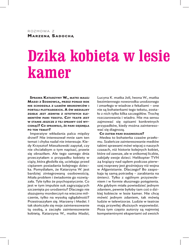r o z m o wa z Marzeną Sadochą Dzika kobieta w lesie kamer Sprawa Katarzyny W., matki małej Madzi z Sosnowca, przez ponad rok nie schodziła z łamów brukowców i portali plotkarskich. A ów medialny mentów pani tekstu. Czy zgiełk jest jednym z istotnych ele- teatr jest w stanie jeszcze z tej sprawy coś wycisnąć? Co sprawiło, że pani sięgnęła po ten temat? Imperatyw wkładania palca między drzwi? Nie interesował mnie sam ten temat i chyba nadal nie interesuje. Kiedy Krzysztof Mieszkowski zapytał, czy nie chciałabym o tym napisać, prawie się obraziłam. Ale tego samego dnia przeczytałam o przypadku kobiety w ciąży, która głodziła się, uciekając przed ciężarem posiadania kolejnego dziecka. Pomyślałam, że Katarzyna W. jest bardziej zintegrowaną osobowością. Miała problem i świadomie go rozwiązała. Tyle tylko że psychopatycznie. Co jest w tym impulsie suk zagryzających szczenięta po urodzeniu? Dlaczego nie skazujemy morderczyń na wieczne milczenie, tylko na wysoką oglądalność? Przestraszyłam się. Marzeny i Medei. I tak skończyło się moje zainteresowanie tą osobą, a zaczęło zainteresowanie kobietą. Katarzyna W., matka Madzi, Lucyna K. matka Joli, Iwona W., matka bezimiennego noworodka urodzonego i zmarłego w wiadrze z fekaliami – one nie są bohaterkami tego tekstu, zostało z nich tylko kilka szczegółów. Trochę rozczarowania i wiadro. Nie ma sensu zajmować się opisami konkretnych przypadków, kiedy można zainteresować się diagnozą. Co zatem pani diagnozuje? Medea to bohaterka czasów przełomu. Szaleńcze zainteresowanie mediów takimi sprawami mówi więcej o naszych czasach, niż historie kolejnych kobiet, które od zawsze, ale w znikomej liczbie, zabijały swoje dzieci. Helikopter TVN 24 krążący nad sądem podczas pierwszej rozprawy jest groźniejszy niż wojna w Afganistanie. Dlaczego? Bo zaspokaja tę samą potrzebę – zarabiania na śmierci. Tylko z ogólnym przyzwoleniem i w formie słusznego potępienia. Ale gdybym miała powiedzieć jednym zdaniem, pewnie byłoby tam coś o dzikiej kobiecie w lesie kamer. Nie chcę mówić jednym zdaniem, tak mówią ludzie w telewizorze. Ludzie w teatrze mają przywilej dłuższych wypowiedzi. Poza tym często autorzy są najmniej kompetentnymi ekspertami od swoich 48 M a rzen a S a d o cha, d ramaturż ka Teatru Po ls k iego we Wrocławiu, redaktor ka „N ot at n i ka Teat ralneg o ”, wykł ad owc z yni w Insty t ucie Dziennikar st wa i Kom unikacji S p oł ec z n ej Uniwersytetu Wro c ł aws kieg o (s pecjalność Creat ive Wr it ing). Autor ka d ra m atów Mał e dz ie c ko i d rukowanej w bieżącym num erze „Dialogu” Media M ed ei , a t a kże p erfo rmans u s cenic z neg o Rom a m ovie i przygotowanego wspóln i e z M i c h a ł em K miec ikiem s p ektaklu- p ro test u C zy pa n to będzie czy ta ł na sta ł e? we w roc ł aws kim Teatrze Po ls kim. tekstów. W takich sytuacjach myślę, że to trochę tak jakby malarza nad sztalugami z martwą naturą zapytać o pochodzenie i sposób hodowli kwiatów, które maluje. Obraz ma działać. Obraz w teatrze również. W ubiegłym roku w krakowskim Teatrze Nowym powstał spektakl „Macabra Dolorosa”. Katarzyna W. też stanęła tam w jednym rzędzie z Medeą. A także z Magdą Goebbels. Przedstawienie zostało zrealizowane na pograniczu kameralnej rock opery i horroru, a jego autorzy wykorzystali medialny aspekt sprawy Katarzyny W., jednak żadna z bohaterek, w które wciela się podczas spektaklu Katarzyna Chlebny, Odnoszę nie przestała być potworem. wrażenie, że pani swoją bohaterkę próbuje zrozumieć. Ale czy tu jest cokolwiek do rozumienia? próby nie są daremne? Czy nasze Są. A ja nie chcę jej zrozumieć. Zrozumienie jest trochę jak przyzwolenie. Próba zrozumienia ma większe możliwości, bo musi uruchomić nasze własne lęki. Na bazie obcej historii wyświetlają się, jak drugi obraz na ekranie, moja emocja i moje impulsy. Bezpiecznie, tylko wyświetlają się i nikomu nie przycisną poduszki do twarzy. Media Medea 49 nie jest potworem, bo opisując kogoś z tej perspektywy, zamienilibyśmy teatr w cyrk. Kobieta z brodą, karzeł i dzieciobójczyni siedzą w klatkach i można ich pooglądać. Z takiej wizyty zostaje tylko moment grozy. A jeśli potwór w klatce okaże się podobny do mnie? Lepiej, żeby się nie okazywał, bo konsternacja może być nie do wytrzymania. Czy współcześnie Medea stałaby się gwiazdą mediów, celebrytką? Jasne. Zresztą już zrobiła karierę. Z kapłanki do demona. To Eurypides dodał jej dzieciobójstwo, podobno sowicie zrewanżowali mu się za to Koryntianie, którym w poprzednich wersjach mitu przypisywano ukamieniowanie jej dzieci. Wyobraźmy sobie kobietę na szczytach władzy, taką żonę najważniejszego prezydenta, która z miłości dla niego zdradza swój kraj, ojca, zabija brata i ćwiartuje jego ciało, a z nienawiści do męża zabija jego nową kochankę i własne dzieci. W dodatku magicznie ucieka, nie ponosząc kary. Trochę jak Paris Hilton notorycznie łapana na posiadaniu kokainy i notorycznie „magicznie” unikająca kary. Paris podobno chowała narkotyk w pochwie, jak doniosła mediom jej przyjaciółka. To takie symboliczne pochodzenie zła. Jeśli książka współczesnej Medei osiągnie szczyt na liście bestsellerów, ich autorka też stanie się gwiazdą. Takie szczyty władzy, jakie czasy, można by powiedzieć, ale lepiej powiedzieć coś o władzy mediów. Na przykład: to już przegięcie. „Epoka przegięcia” to czas, kiedy wartości wytwarzają media, my jesteśmy ich niewolnikami, a powszechne przekonanie o nieuchronności tego stanu wytrąca broń z ręki. Na szczęście nie długopis. Ta mitologiczna Medea była czarodziejką, tej z pani dramatu też udaje się skutecznie czarować, uwodzić rzeczywistość wokół siebie. Ile na Bogna Burska / justyna jaworska • gęś nioska tym romansie z mediami zyskuje, a ile 