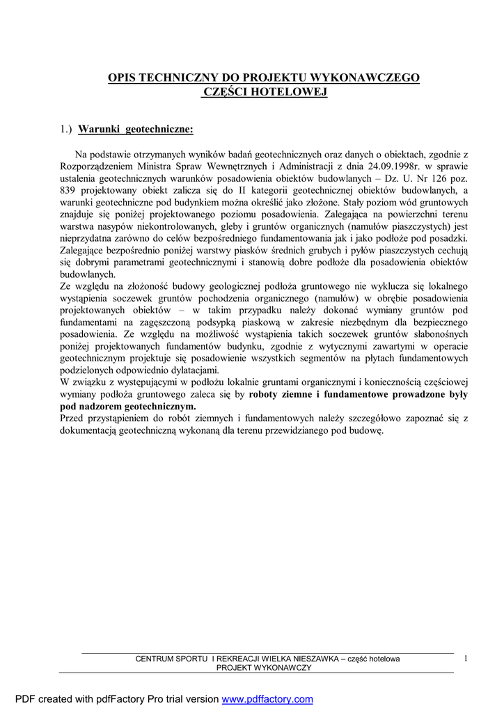 OPIS TECHNICZNY DO PROJEKTU WYKONAWCZEGO CZĘŚCI HOTELOWEJ 1.) Warunki geotechniczne: Na podstawie otrzymanych wyników badań geotechnicznych oraz danych o obiektach, zgodnie z Rozporządzeniem Ministra Spraw Wewnętrznych i Administracji z dnia 24.09.1998r. w sprawie ustalenia geotechnicznych warunków posadowienia obiektów budowlanych – Dz. U. Nr 126 poz. 839 projektowany obiekt zalicza się do II kategorii geotechnicznej obiektów budowlanych, a warunki geotechniczne pod budynkiem można określić jako złożone. Stały poziom wód gruntowych znajduje się poniżej projektowanego poziomu posadowienia. Zalegająca na powierzchni terenu warstwa nasypów niekontrolowanych, gleby i gruntów organicznych (namułów piaszczystych) jest nieprzydatna zarówno do celów bezpośredniego fundamentowania jak i jako podłoże pod posadzki. Zalegające bezpośrednio poniżej warstwy piasków średnich grubych i pyłów piaszczystych cechują się dobrymi parametrami geotechnicznymi i stanowią dobre podłoże dla posadowienia obiektów budowlanych. Ze względu na złożoność budowy geologicznej podłoża gruntowego nie wyklucza się lokalnego wystąpienia soczewek gruntów pochodzenia organicznego (namułów) w obrębie posadowienia projektowanych obiektów – w takim przypadku należy dokonać wymiany gruntów pod fundamentami na zagęszczoną podsypką piaskową w zakresie niezbędnym dla bezpiecznego posadowienia. Ze względu na możliwość wystąpienia takich soczewek gruntów słabonośnych poniżej projektowanych fundamentów budynku, zgodnie z wytycznymi zawartymi w operacie geotechnicznym projektuje się posadowienie wszystkich segmentów na płytach fundamentowych podzielonych odpowiednio dylatacjami. W związku z występującymi w podłożu lokalnie gruntami organicznymi i koniecznością częściowej wymiany podłoża gruntowego zaleca się by roboty ziemne i fundamentowe prowadzone były pod nadzorem geotechnicznym. Przed przystąpieniem do robót ziemnych i fundamentowych należy szczegółowo zapoznać się z dokumentacją geotechniczną wykonaną dla terenu przewidzianego pod budowę. CENTRUM SPORTU I REKREACJI WIELKA NIESZAWKA – część hotelowa PROJEKT WYKONAWCZY PDF created with pdfFactory Pro trial version www.pdffactory.com 1 2.) Ogólny opis konstrukcji Budynek zaprojektowany został w technologii tradycyjnej. Rzut budynku o wymiarach 56,38x67,08m ma kształt litery „L”. Budynek jest podpiwniczony i posiada dwie kondygnacje nadziemne. Układ konstrukcyjny projektowanego obiektu jest mieszany. Ogród zimowy stanowi odrębny jednokondygnacyjny segment budynku – jego główną konstrukcję nośną stanowi ruszt z drewna klejonego, natomiast pokrycie dachu i obudowa ścian to szkło na systemowym ruszcie aluminiowym. Projektuje się fundamentowanie płytkie bezpośrednie, budynek posadowiono na płycie fundamentowej podzielonej odpowiednio dylatacjami. Płytę należy posadowić na podbudowie z chudego betonu. Ściany fundamentowe oraz ściany piwnic stykające się z gruntem wykonać jako żelbetowe, osłonięte izolacją przeciwwilgociową, ściany parteru i piętra projektuje się z bloczków wapienno – piaskowych (sylikatowych) np. typu „SILKA”. Kamienne okładziny ścian wykonać należy jako murowane w sposób tradycyjny. Strop nad piwnicą projektuje się jako żelbetowy monolityczny, strop nad parterem gęstożebrowy typu TERIVA. Płyty i wylewki żelbetowe zespolić należy z wieńcami i nadbetonem stropów gęstożebrowych. Dach projektuje się o konstrukcji stalowo – drewnianej. Opis i oznaczenia poszczególnych elementów konstrukcji budynku znajdują się na rzutach konstrukcji dachu i stropów oraz na rysunkach szczegółowych niniejszej dokumentacji. Klatki schodowe w budynku projektuje się o konstrukcji żelbetowej płytowej. Szyby windowe murowane z pośrednimi wieńcami monolitycznymi – wykonać zgodnie z wytycznymi producenta urządzeń dźwigowych. 3.) Opis szczegółowy elementów konstrukcji budynku: Roboty ziemne i przygotowawcze Ze względu na przewarstwienia podłoża wyszczególnione w operacie geotechnicznym, podczas prowadzenia robót ziemnych należy na bieżąco analizować zgodność gruntów występujących w wykopie z warunkami założonymi do projektowania. W przypadku pojawienia się rozbieżności należy skontaktować się z projektantem i geologiem. Zalegające na powierzchni terenu warstwy gleby i nasypów niebudowlanych, gleby roślinnej i namułów organicznych należy usunąć. Dla wykonania płyt fundamentowych żelbetowych konieczne jest wykonanie wykopu szerokoprzestrzennego z odpowiednio poszerzonym rozkopem. Wykonywanie wykopów i płyt fundamentowych zaleca się realizować sukcesywnie, tak by okres czasu pomiędzy odsłonięciem dna wykopu, a ułożeniem warstwy chudego betonu był możliwie najkrótszy. Zmiany głębokości posadowienia zaprojektowano jako schodkowe o kącie nachylenia w przybliżeniu zgodnym z kątem naturalnego spadku podłoża. Bezpośrednio pod fundamentami należy wykonać warstwę chudego betonu B10 o grubości minimum 10cm. W miejscach zaznaczonych na rysunku fundamentów należy przegłębić chudy beton minimum 80cm poniżej poziomu projektowanego przyległego CENTRUM SPORTU I REKREACJI WIELKA NIESZAWKA – część hotelowa PROJEKT WYKONAWCZY PDF created with pdfFactory Pro trial version www.pdffactory.com 2 terenu lub posadzki, ze względu na przemarzanie. Lokalne pogrubienia płyty fundamentowej (do dołu) występujące pod ścianami i słupami, wyprofilować należy w trakcie układania chudego betonu. W przypadku zalegania w dnie wykopów gruntów spoistych ostatnią warstwę gruntu o miąższości około 20cm usunąć bezpośrednio przed ułożeniem warstwy chudego betonu tak by struktura gruntu i jego wilgotność nie uległa istotnym zmianom. Występujące lokalnie w poziomie posadowienia fundamentów grunty organiczne (namuły) należy usunąć zastępując je zagęszc