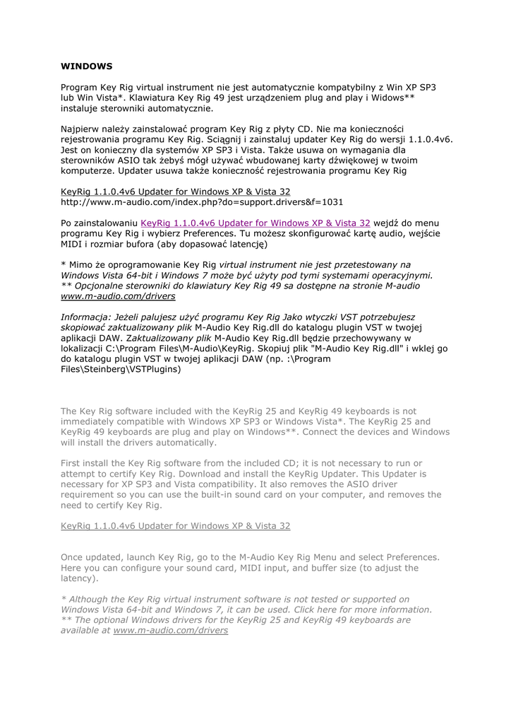 WINDOWS Program Key Rig virtual instrument nie jest automatycznie kompatybilny z Win XP SP3 lub Win Vista*. Klawiatura Key Rig 49 jest urządzeniem plug and play i Widows** instaluje sterowniki automatycznie. Najpierw należy zainstalować program Key Rig z płyty CD. Nie ma konieczności rejestrowania programu Key Rig. Sciągnij i zainstaluj updater Key Rig do wersji 1.1.0.4v6. Jest on konieczny dla systemów XP SP3 i Vista. Także usuwa on wymagania dla sterowników ASIO tak żebyś mógł używać wbudowanej karty dźwiękowej w twoim komputerze. Updater usuwa także konieczność rejestrowania programu Key Rig KeyRig 1.1.0.4v6 Updater for Windows XP & Vista 32 http://www.m-audio.com/index.php?do=support.drivers&f=1031 Po zainstalowaniu KeyRig 1.1.0.4v6 Updater for Windows XP & Vista 32 wejdź do menu programu Key Rig i wybierz Preferences. Tu możesz skonfigurować kartę audio, wejście MIDI i rozmiar bufora (aby dopasować latencję) * Mimo że oprogramowanie Key Rig virtual instrument nie jest przetestowany na Windows Vista 64-bit i Windows 7 może być użyty pod tymi systemami operacyjnymi. ** Opcjonalne sterowniki do klawiatury Key Rig 49 sa dostępne na stronie M-audio www.m-audio.com/drivers Informacja: Jeżeli palujesz użyć programu Key Rig Jako wtyczki VST potrzebujesz skopiować zaktualizowany plik M-Audio Key Rig.dll do katalogu plugin VST w twojej aplikacji DAW. Zaktualizowany plik M-Audio Key Rig.dll będzie przechowywany w lokalizacji C:\Program Files\M-Audio\KeyRig. Skopiuj plik "M-Audio Key Rig.dll" i wklej go do katalogu plugin VST w twojej aplikacji DAW (np. :\Program Files\Steinberg\VSTPlugins) The Key Rig software included with the KeyRig 25 and KeyRig 49 keyboards is not immediately compatible with Windows XP SP3 or Windows Vista*. The KeyRig 25 and KeyRig 49 keyboards are plug and play on Windows**. Connect the devices and Windows will install the drivers automatically. First install the Key Rig software from the included CD; it is not necessary to run or attempt to certify Key Rig. Download and install the KeyRig Updater. This Updater is necessary for XP SP3 and Vista compatibility. It also removes the ASIO driver requirement so you can use the built-in sound card on your computer, and removes the need to certify Key Rig. KeyRig 1.1.0.4v6 Updater for Windows XP & Vista 32 Once updated, launch Key Rig, go to the M-Audio Key Rig Menu and select Preferences. Here you can configure your sound card, MIDI input, and buffer size (to adjust the latency). * Although the Key Rig virtual instrument software is not tested or supported on Windows Vista 64-bit and Windows 7, it can be used. Click here for more information. ** The optional Windows drivers for the KeyRig 25 and KeyRig 49 keyboards are available at www.m-audio.com/drivers Note: If you plan on using Key Rig as a VST plug-in, you will need to copy the updated M-Audio Key Rig.dll file to your host DAW application's VST plug-ins folder. The updated M-Audio Key Rig.dll installs to C:\Program Files\M-Audio\KeyRig. Copy the "M-Audio Key Rig.dll" file; then paste this .dll file into your host DAW's VST plug-ins folder, e.g. C:\Program Files\Steinberg\VSTPlugins. Mac Mac Updater zawiera suport dla komputerów Intel baesd Mac's, najnowsze poprawki i usuwa konieczność rejestracji programu. Klawiatura Key Rig 49 jest urządzeniem plug and play dla Mac OS X i nie potrzebuje instalowania sterowników. Po prostu podłącz klawiaturę do wolnego portu USB. Jeżeli po raz pierwszy instalujesz oprogramowanie Key Rig na komputerze Mac skopiuj folder Key Rig Data na twardy dysk. Uruchom "Set Key Rig Data Location" w folderze. Następnie ściągnij updater Key Rig. Jezeli Key Rig jest juz zainstalowany uruchom "Set Key Rig Data Location" w folderze następnie ściągnij i zainstaluj update Key Rig Key Rig 1.1.0.4 Updater for Mac OS X http://www.m-audio.com/index.php?do=support.drivers&f=895 The Mac Updater includes support for Intel baesd Mac's, the latest bug fixes, and also removes the need to certify Key Rig. The KeyRig 25 and KeyRig 49 keyboards are plug and play on Mac OS X, there are no drivers to install. Simply connect the keyboard to an available USB port. If this is the first time you are installing Key Rig on your Mac, copy the Key Rig Data folder to the Applications folder on your hard drive. Run the "Set Key Rig Data Location" app in the Key Rig Data folder. Download and install the Key Rig Updater. If KeyRig is already installed, run the "Set Key Rig Data Location" app in the Key Rig Data folder, and then download and install the Key Rig Updater. Key Rig 1.1.0.4 Updater for Mac OS X http://www.m-audio.com/index.php?do=support.drivers&f=895 Dokumentacja • • • KeyRig 25 Keyboard User Guide KeyRig 49 Keyboard User Guide Key Rig Software Manual