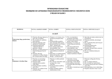 WYMAGANIA EDUKACYJNE NIEZBĘDNE DO UZYSKANIA POSZCZEGÓLNYCH ŚRODROCZNYCH I ROCZNYCH OCEN Z RELIGII W KLASIE I ROZDZIAŁ OCENA: BARDZO DOBRY OCENA: DOBRY OCENA: DOSTATECZNY OCENA: DOPUSZCZAJĄCY UCZEŃ I. Pozdrawiamy Boga, pozdrawiamy bliźnich II. Dziękujemy i chwalimy Boga 1. Wyjaśnia, dlaczego stajemy się lepsi, gdy się modlimy. 2. Wie, że należy do wspólnoty dzieci Bożych. 3. Opowiada, dlaczego warto naśladować Świętą Kingę. 4. Wyjaśnia pozdrowienie Archanioła Gabriela w spotkaniu z Maryją. 5. Tłumaczy, że Pismo Święte jest listem kochającego Ojca do ludzi. 6. Wyjaśnia, dlaczego uczestnictwo we Mszy Świętej jest wyrazem miłości do Boga. 1. Tłumaczy, co to znaczy, że na katechezie poznajemy Pana Boga. 2. Wymienia kilka uczynków, które sprawiają radość innym. 3. Opisuje pobożne życie Świętej Kingi – patronki roku. 4. Zna i stosuje pozdrowienia chrześcijańskie i inne. 5. Wyjaśnia, że Pismo Święte jest przewodnikiem na drodze do nieba. 6. Opowiada, że w każdą niedzielę idziemy do kościoła – domu Bożego – na Mszę Świętą. 1. Wie, że na katechezie poznajemy Pana Boga. 2. Wymienia kilka pozytywnych postaw wobec innych. 3. Wyjaśnia, co to znaczy, że Święta Kinga jest patronką roku. 4. Zna różne pozdrowienia chrześcijańskie i inne. 5. Wskazuje na Pismo Święte jako najważniejszą Księgę. 6. Wyjaśnia, że kościół jest miejscem spotkania z Bogiem. 1. Opowiada, jak należy zachowywać się na katechezie. 2. Wskazuje przykłady, jak pomagać innym. 3. Wie, że patronką klasy pierwszej jest Święta Kinga. 4. Wymienia pozdrowienia chrześcijańskie i inne. 5. Wyjaśnia, dlaczego należy szanować Pismo Święte. 6. Wie, że w niedzielę idziemy do kościoła. 1. Wyjaśnia, na czym polega szacunek wobec przyrody. 2. Wyjaśnia skutki nieposłuszeństwa aniołów wobec Boga. 3. Potrafi powiedzieć modlitwę Aniele Boży. 4. Wyjaśnia, że w pięknie świata poznajemy Boga. 1. Wskazuje, że dobro pochodzi od Boga. 2. Wie, kim jest Anioł Stróż i jaka jest jego rola w życiu człowieka. 3. Potrafi powiedzieć modlitwę Aniele Boży. 4. Podaje przykłady modlitwy dziękczynnej za świat. 1. Opowiada o świecie stworzonym przez Boga. 2. Opowiada o Aniele Stróżu. 3. Zna modlitwę Aniele Boży. 4. Wymienia kilka dzieł Boga w świecie. 5. Wie, gdzie w kościele jest woda święcona. 1. Wskazuje na Boga jako Stwórcę świata. 2. Wie, że istnieją Aniołowie 3. Wie, że każdy ma Anioła Stróża. 4. Z pomocą nauczyciela mówi modlitwę Aniele Boży. 5. Dostrzega piękny świat i dzieła Boga. 6. Wyjaśnia znaczenie wody w życiu. III. W modlitwie spotykamy się z Bogiem Ojcem i prosimy z wiarą IV. Oczekujemy z wiarą 5. Wyjaśnia znaczenie wody 5. Wie, do czego służy woda 6. Wyraża wdzięczność Bogu za święconej w życiu dziecka świecona. słońce i światło. Bożego. 6. Wyjaśnia słowa: „światło wśród 7. Rozpoznaje i stara się rozwijać 6. Wie, że Pan Jezus jest światłem ciemności”. swoje talenty. dla każdego dziecka Bożego. 7. Wyjaśnia, że każdy człowiek 7. Podaje przykłady, jak służyć otrzymał od Boga zdolności i talentami innym. talenty. 7. Wyjaśnia znaczenie światła w życiu. 8. Opowiada o talentach i zdolnościach ludzi. 1. Wskazuje przykłady modlitwy i wyjaśnia dlaczego powinniśmy się modlić. 2. Wypowiada modlitwę za zmarłych Wieczny odpoczynek. 3. Zna i modli się słowami modlitwy Ojcze nasz. 4. Wyjaśnia, że przez znak krzyża wyrażamy miłość i szacunek do Boga. 5. Wskazuje, jak zachęcić innych do modlitwy w rodzinie. 1. Wyjaśnia znaczenie modlitwy w życiu chrześcijanina. 2. Wyjaśnia, kiedy i dlaczego powinniśmy pamiętać o modlitwie za zmarłych. 3. Wie, jakiej modlitwy nauczył nas Jezus. 4. Zna i modli się słowami modlitwy Ojcze nasz. 5. Wie, że znak krzyża jest wyrazem wiary w Boga. 6. Podaje przykłady modlitwy rodziny w różnych sytuacjach. 7. Wie, że Jezus obecny jest pod postaciami chleba i wina podczas Mszy Świętej. 1. Wie, kiedy należy pamiętać o modlitwie. 2. Wyjaśnia, dlaczego modlimy się za zmarłych. 3. Wyjaśnia znaczenie modlitwy w życiu Jezusa. 4. Starannie wykonuje znak krzyża. 5. Z niewielką pomocą nauczyciela potrafi powiedzieć modlitwę Ojcze nasz. 6. Opisuje, jak może wyglądać modlitwa w rodzinie. 7. Opowiada, że na Mszy Świętej śpiewem chwalimy Pana Boga. 1. Wie, że modlitwa jest rozmową z Bogiem. 2. Wskazuje czas, kiedy należy pamiętać o modlitwie za zmarłych. 3. Opowiada na czym polega praktyka codziennej modlitwy. 4. Stara się poprawnie wykonać znak krzyża. 5. Z pomocą nauczyciela mówi modlitwę Ojcze nasz, ale robi w niej dużo błędów. 6. Opowiada o modlitwie w rodzinie. 7. Wie, co to znaczy aktywnie uczestniczyć we Mszy Świętej. 1. Wyjaśnia, dlaczego wraz z Maryją oczekujemy na Boże Narodzenie. 2. Wyjaśnia, że Pan Jezus przychodzi do wszystkich ludzi, aby ich zbawić. 3. Wyjaśnia, że śpiewem kolęd uwielbiamy małego Jezusa. 4. Podaje przykłady modlitwy prośby wobec Boga i ludzi. 5. Tłumaczy, w jaki sposób Jan Chrzciciel zapowiada przyjście Jezusa. 6. Wyraża wdzięczność Bogu za dar wiary otrzymanej podczas chrztu świętego. 7. Wskazuje na znaczenie modlitwy do swoich patronów. 1. Opisuje wydarzenie zwiastowania. 2. Wie, co to są roraty. 3. Opowiada o narodzinach Jezusa. 4. Włącza się w śpiew kolęd, aby oddać cześć Jezusowi. 5. Wyjaśnia znaczenie modlitwy prośby w życiu dziecka Bożego. 6. Wyjaśnia dlaczego Jan Chrzciciel przebywał na pustyni. 7. Wyjaśnia zadania rodziców i rodziców chrzestnych. 8. Opowiada o królestwie niebieskim i o świętych w niebie. 1. Wymienia symbole adwentu: roratka, wieniec adwentowy, lampion. 2. Wie, w jakiej miejscowości urodził się Jezus. 3. Wymienia znane kolędy. 4. Wskazuje poprawną postawę ciała w czasie modlitwy. 5. Wymienia elementy stroju i pożywienia Jana Chrzciciela. 6. Opisuje wybrane obrzędy chrztu św