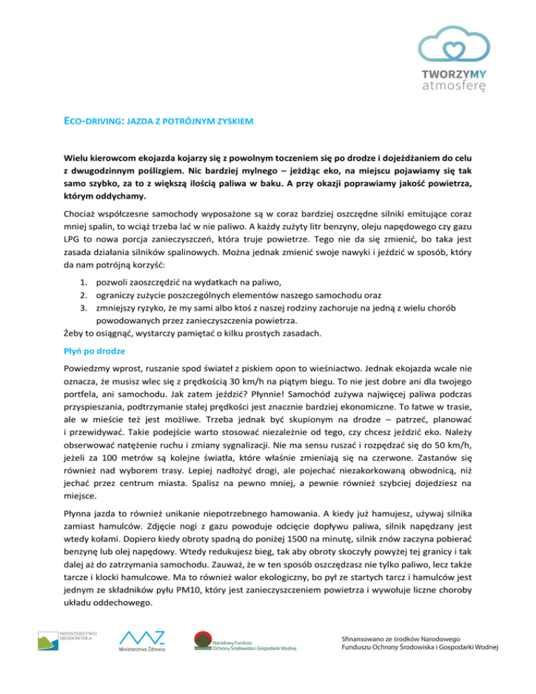 ECO-DRIVING: JAZDA Z POTRÓJNYM ZYSKIEM Wielu kierowcom ekojazda kojarzy się z powolnym toczeniem się po drodze i dojeżdżaniem do celu z dwugodzinnym poślizgiem. Nic bardziej mylnego – jeżdżąc eko, na miejscu pojawiamy się tak samo szybko, za to z większą ilością paliwa w baku. A przy okazji poprawiamy jakość powietrza, którym oddychamy. Chociaż współczesne samochody wyposażone są w coraz bardziej oszczędne silniki emitujące coraz mniej spalin, to wciąż trzeba lać w nie paliwo. A każdy zużyty litr benzyny, oleju napędowego czy gazu LPG to nowa porcja zanieczyszczeń, która truje powietrze. Tego nie da się zmienić, bo taka jest zasada działania silników spalinowych. Można jednak zmienić swoje nawyki i jeździć w sposób, który da nam potrójną korzyść: 1. pozwoli zaoszczędzić na wydatkach na paliwo, 2. ograniczy zużycie poszczególnych elementów naszego samochodu oraz 3. zmniejszy ryzyko, że my sami albo ktoś z naszej rodziny zachoruje na jedną z wielu chorób powodowanych przez zanieczyszczenia powietrza. Żeby to osiągnąć, wystarczy pamiętać o kilku prostych zasadach. Płyń po drodze Powiedzmy wprost, ruszanie spod świateł z piskiem opon to wieśniactwo. Jednak ekojazda wcale nie oznacza, że musisz wlec się z prędkością 30 km/h na piątym biegu. To nie jest dobre ani dla twojego portfela, ani samochodu. Jak zatem jeździć? Płynnie! Samochód zużywa najwięcej paliwa podczas przyspieszania, podtrzymanie stałej prędkości jest znacznie bardziej ekonomiczne. To łatwe w trasie, ale w mieście też jest możliwe. Trzeba jednak być skupionym na drodze – patrzeć, planować i przewidywać. Takie podejście warto stosować niezależnie od tego, czy chcesz jeździć eko. Należy obserwować natężenie ruchu i zmiany sygnalizacji. Nie ma sensu ruszać i rozpędzać się do 50 km/h, jeżeli za 100 metrów są kolejne światła, które właśnie zmieniają się na czerwone. Zastanów się również nad wyborem trasy. Lepiej nadłożyć drogi, ale pojechać niezakorkowaną obwodnicą, niż jechać przez centrum miasta. Spalisz na pewno mniej, a pewnie również szybciej dojedziesz na miejsce. Płynna jazda to również unikanie niepotrzebnego hamowania. A kiedy już hamujesz, używaj silnika zamiast hamulców. Zdjęcie nogi z gazu powoduje odcięcie dopływu paliwa, silnik napędzany jest wtedy kołami. Dopiero kiedy obroty spadną do poniżej 1500 na minutę, silnik znów zaczyna pobierać benzynę lub olej napędowy. Wtedy redukujesz bieg, tak aby obroty skoczyły powyżej tej granicy i tak dalej aż do zatrzymania samochodu. Zauważ, że w ten sposób oszczędzasz nie tylko paliwo, lecz także tarcze i klocki hamulcowe. Ma to również walor ekologiczny, bo pył ze startych tarcz i hamulców jest jednym ze składników pyłu PM10, który jest zanieczyszczeniem powietrza i wywołuje liczne choroby układu oddechowego. Wciskaj gaz z głową Błędem wielu kierowców, którzy próbują ekojazdy, jest kurczowe trzymanie się zasady jeżdżenia na jak najniższych obrotach. To nie tak! Jazda na zbyt niskich obrotach, zwłaszcza przyspieszanie, niszczy układ napędowy. Oszczędności na paliwie starczą ci zaledwie na ułamek rachunku, który wystawi warsztat za naprawę wału korbowego i tłoków. A kiedy obroty są zbyt niskie? Nie ma uniwersalnej zasady, bo różne silniki mają odmienne charakterystyki. Jeżeli jednak, gdy wciskasz gaz, silnik wpada w drgania, to możesz mieć pewność, że obroty są zbyt niskie. Pamiętaj również o zasadzie podtrzymywania prędkości i staraj się możliwie szybko osiągnąć prędkość docelową. W tym czasie śmiało możesz podkręcić silnik do 3000 (diesel) lub 3500-4000 (benzyna) obrotów na minutę. Spalanie paliwa jest wtedy wysokie, ale trwa to krótko. Gdy już osiągniesz prędkość docelową, zmniejsz obroty i dodaj tylko tyle gazu, aby podtrzymać prędkość. Zadbaj o swój samochód Czy przypadkiem nie traktujesz swojego samochodu jak mobilnej graciarni? Zajrzyj do bagażnika i wyrzuć z niego wszystko, co nie jest ci potrzebne. Im cięższy samochód, tym więcej pali – bałagan w bagażniku kosztuje konkretne pieniądze. Podobnie jest z boksem montowanym na dachu. Czy zdejmujesz go zaraz po powrocie z wakacji? Pewnie – miło poszpanować przed sąsiadami, że się było na nartach, ale czy warto za to płacić? Taki boks zwiększa opór powietrza, który musi pokonać samochód, aby osiągnąć, a potem utrzymać zakładaną prędkość. Większy opór równa się większe spalanie i wyższe wydatki na stacji paliw. Trzecia rzecz to opony. Ponad 60 proc. samochodów w Polsce ma nieprawidłowe ciśnienie w oponach. Tymczasem jazda na kapciu nie dość, że niebezpieczna, to w dodatku bardziej niszczy opony (trzeba je częściej zmieniać) i zwiększa opory toczenia, co przekłada się na zużycie paliwa. No i oczywiście pamiętaj, aby nie jeździć latem na zimówkach, które są bardziej paliwożerne. Unikaj krótkich podróży Najwięcej oszczędzisz na paliwie, gdy obroty silnika będą wynosić 0. Jeżeli możesz, zostaw samochód w spokoju. Nieopłacalne jest zwłaszcza jeżdżenie na krótkich odcinkach – silnik pali najwięcej, gdy jest zimny – krytyczne są pierwsze kilometry drogi. Tymczasem jedna czwarta podróży odbywa się na dystansie poniżej 2 km, a połowa – poniżej 5 km. Do kiosku lub na pobliską siłownię wybierz się na piechotę albo rowerem – przy okazji poprawisz kondycję i ograniczysz ryzyko zachorowania na jedną z chorób wywoływanych przez zanieczyszczenia powietrza. Jak pokazały eksperymenty przeprowadzone m.in. w Londynie, rowerzyści i piesi są mniej narażeni na zanieczyszczenia powietrza niż osoby jeżdżące samochodem. Ile oszczędzisz? To, ile zaoszczędzisz na ekojeździe, w dużym stopniu zależy od tego, jak nieekologicznie jeździłeś do tej pory. Badanie przeprowadzone w Singapurze pokazało, że po kursie ek