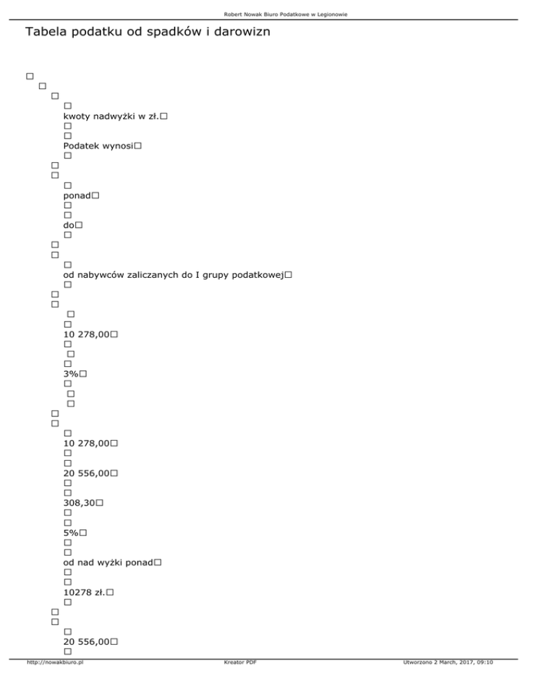 Robert Nowak Biuro Podatkowe w Legionowie Tabela podatku od spadków i darowizn kwoty nadwyżki w zł. Podatek wynosi ponad do od nabywców zaliczanych do I grupy podatkowej 10 278,00 3% 10 278,00 20 556,00 308,30 5% od nad wyżki ponad 10278 zł. 20 556,00 http://nowakbiuro.pl Kreator PDF Utworzono 2 March, 2017, 09:10 Robert Nowak Biuro Podatkowe w Legionowie 822,20 7% od nadwyżki ponad 20556 zł. od nabywców zaliczanych do II grupy podatkowej 10278 7% 10278 20556 719,50 9% od nadwyżki ponad 10278 zł. 20556 1 644,50 12% http://nowakbiuro.pl Kreator PDF Utworzono 2 March, 2017, 09:10 Robert Nowak Biuro Podatkowe w Legionowie od nadwyżki ponad 20556 zł. od nabywców zaliczanych do III grupy podatkowej 10278 12% 10278 20556 1233,4 16% od nadwyżki ponad 10278 zł. 20556 2877,9 20% od nadwyżki ponad 20556 zł. http://nowakbiuro.pl Kreator PDF Utworzono 2 March, 2017, 09:10 Robert Nowak Biuro Podatkowe w Legionowie http://nowakbiuro.pl Kreator PDF Utworzono 2 March, 2017, 09:10