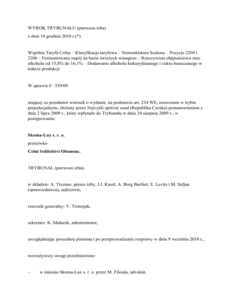 WYROK TRYBUNAŁU (pierwsza izba) z dnia 16 grudnia 2010 r.(*) Wspólna Taryfa Celna – Klasyfikacja taryfowa – Nomenklatura Scalona – Pozycje 2204 i 2206 – Fermentowany napój na bazie świeżych winogron – Rzeczywista objętościowa moc alkoholu od 15,8% do 16,1% – Dodawanie alkoholu kukurydzianego i cukru buraczanego w trakcie produkcji W sprawie C‑339/09 mającej za przedmiot wniosek o wydanie, na podstawie art. 234 WE, orzeczenia w trybie prejudycjalnym, złożony przez Nejvyšší správní soud (Republika Czeska) postanowieniem z dnia 2 lipca 2009 r., które wpłynęło do Trybunału w dniu 24 sierpnia 2009 r., w postępowaniu: Skoma-Lux s. r. o. przeciwko Celní ředitelství Olomouc, TRYBUNAŁ (pierwsza izba), w składzie: A. Tizzano, prezes izby, J.J. Kasel, A. Borg Barthet, E. Levits i M. Safjan (sprawozdawca), sędziowie, rzecznik generalny: V. Trstenjak, sekretarz: K. Malacek, administrator, uwzględniając procedurę pisemną i po przeprowadzeniu rozprawy w dniu 9 września 2010 r., rozważywszy uwagi przedstawione: – w imieniu Skoma-Lux s. r. o. przez M. Filouša, advokát, – w imieniu Celní ředitelství Olomouc przez M. Brázdę, działającego w charakterze pełnomocnika, – w imieniu rządu czeskiego przez M. Smolka, działającego w charakterze pełnomocnika, – w imieniu rządu greckiego przez G. Kanellopoulosa oraz Z. Chatzipavlou i V. Karrę, działających w charakterze pełnomocników, – w imieniu Komisji Europejskiej przez L. Bouyon, L. Jelínka oraz M. Šimerdovą, działających w charakterze pełnomocników, podjąwszy, po wysłuchaniu rzecznika generalnego, decyzję o rozstrzygnięciu sprawy bez opinii, wydaje następujący Wyrok 1 Wniosek o wydanie orzeczenia w trybie prejudycjalnym dotyczy wykładni pozycji 2204 i 2206 Nomenklatury Scalonej zawartej w załączniku I do rozporządzenia Rady (EWG) nr 2658/87 z dnia 23 lipca 1987 r. w sprawie nomenklatury taryfowej i statystycznej oraz w sprawie Wspólnej Taryfy Celnej (Dz.U. L 256, s. 1), zmienionego rozporządzeniem Komisji (WE) nr 1719/2005 z dnia 27 października 2005 r. (Dz.U. L 286, s. 1) (zwanej dalej „CN”). 2 Wniosek ten złożono w ramach sporu pomiędzy Skoma-Lux s. r. o. (zwaną dalej „Skoma-Lux”) i Celní ředitelství Olomouc (izbą celną w Ołomuńcu) w przedmiocie klasyfikacji w CN importowanego do Republiki Czeskiej towaru oznaczonego jako „czerwone wino deserowe Kagor VK”. Ramy prawne 3 CN, wprowadzona rozporządzeniem nr 2658/87, oparta jest na światowym Zharmonizowanym Systemie Oznaczania i Kodowania Towarów (zwanym dalej „HS”), opracowanym przez Radę Współpracy Celnej, obecnie Światową Organizację Celną, i ustanowionym przez międzynarodową konwencję zawartą w Brukseli w dniu 14 czerwca 1983 r., a następnie zatwierdzoną w imieniu Wspólnoty Europejskiej decyzją Rady 87/369/EWG z dnia 7 kwietnia 1987 r. (Dz.U. L 198, s. 1). CN przejęła z tego systemu pozycje i sześciocyfrowe podpozycje, a jedynie siódma i ósma cyfra wprowadza dodatkowe podpodziały charakterystyczne dla CN. 4 W celu dostarczenia jak najpełniejszych wyjaśnień w sprawie stosowania Zharmonizowanego Systemu Światowa Organizacja Celna regularnie publikuje noty wyjaśniające do zharmonizowanego systemu (zwane dalej „NWHS”). Podobnie w celu zapewnienia stosowania CN Komisja Europejska opracowuje uwagi wyjaśniające do tej nomenklatury, na mocy art. 9 ust. 1 lit. a) tiret drugie rozporządzenia nr 2658/87. Te regularnie publikowane w Dzienniku Urzędowym Unii Europejskiej uwagi nie zastępują NWHS, lecz powinny być uważane za ich uzupełnienie i być analizowane łącznie z nimi. 5 W brzmieniu HS z 2002 r. mającym zastosowanie do okoliczności sporu w postępowaniu przed sądem krajowym pozycja 2204 nosi tytuł „Wino ze świeżych winogron, włącznie z winami wzmocnionymi; moszcz gronowy, inny niż ten objęty pozycją 2009”. 6 NWHS dotyczące pozycji 2204 stanowią: „2204.10 − Wino musujące: − Pozostałe wina; moszcz gronowy z fermentacją nierozpoczętą lub zatrzymaną przez dodanie alkoholu: 2204.21 − − W pojemnikach o objętości 2 litrów lub mniejszej: 2204.29 − − Pozostałe: 2204.30 − Pozostały moszcz gronowy: I) Wino ze świeżych winogron Wino sklasyfikowane w niniejszej pozycji jest [wyłącznie] produktem końcowym fermentacji alkoholowej moszczu ze świeżych winogron. Niniejsza pozycja obejmuje: [...] 4) Wina likierowe (niekiedy nazywane winami deserowymi). Wina te zawierają dużo alkoholu i zazwyczaj są otrzymywane z moszczu o dużej zawartości cukru, którego tylko część jest przekształcana w alkohol podczas fermentacji. W niektórych przypadkach są one wzmacniane przez dodanie alkoholu lub skoncentrowanego moszczu lub moszczu z dodatkiem alkoholu. Do win likierowych (lub deserowych) należą między innymi: Canary, Cyprus, Lacryma Christi, Madera, Malaga, Marsala, Porto, Malmsey, Samos i Sherry. [...]”. 7 HS w brzmieniu z 2002 r. obejmuje również pozycję 2206 zatytułowaną „Pozostałe napoje fermentowane [na przykład cydr (cidr), perry i miód pitny]; mieszanki napojów fermentowanych oraz mieszanki napojów fermentowanych i napojów bezalkoholowych, gdzie indziej niewymienione ani niewłączone”. 8 NWHS dotyczące pozycji 2206 stanowią: „Niniejsza pozycja obejmuje wszystkie napoje fermentowane inne niż te, które zostały objęte pozycjami od 2203 do 2205. Obejmuje między innymi: [...] 10) Piwo imbirowe i piwo ziołowe [czyli napoje gazowane] otrzymywane z cukru i wody oraz imbiru lub ziół, fermentowane z użyciem drożdży. Wszystkie te napoje mogą być zarówno naturalnie musujące jak też sztucznie nasycane dwutlenkiem węgla. Pozostają sklasyfikowane do niniejszej pozycji, [nawet] gdy są wzmocnione przez dodanie alkoholu lub gdy zawartość alkoholu została zwiększona w wyniku dalszej fermentacji [pod warunkiem że zachowują charakter produktów sklasyfikowanych w niniejszej pozycji].