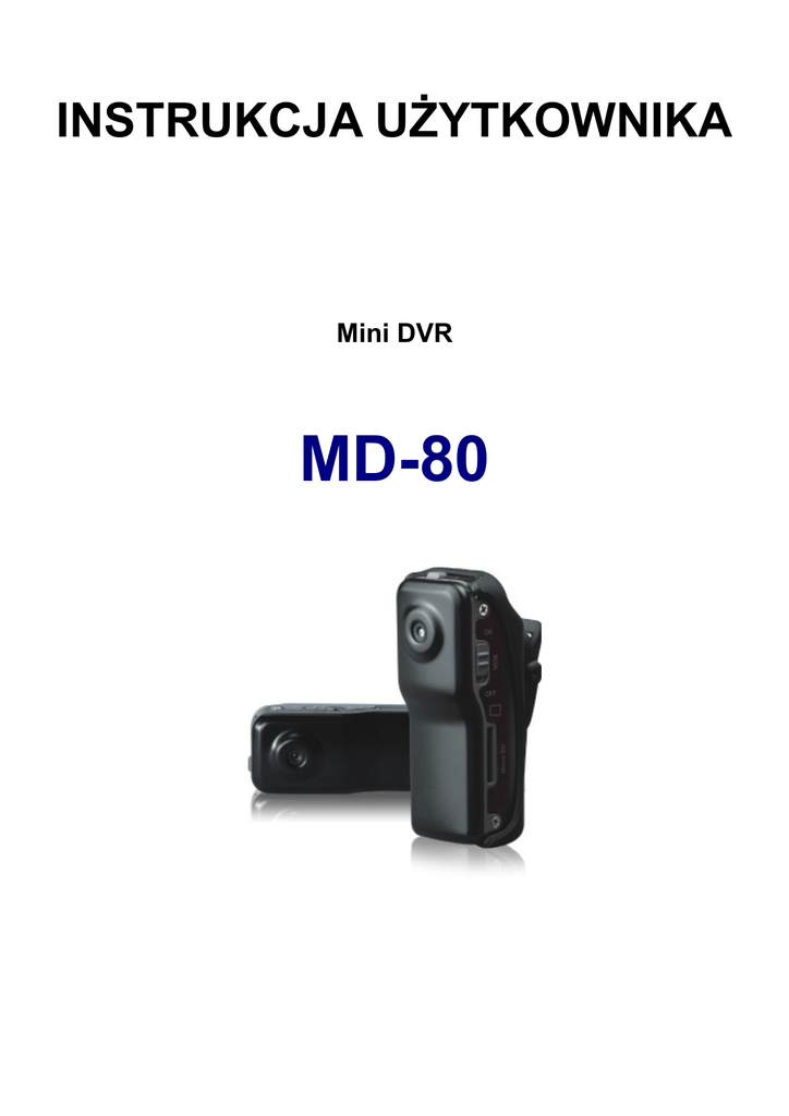 INSTRUKCJA UŻYTKOWNIKA Mini DVR MD-80 Najważniejsze cechy urządzenia: • • • • • • • • • • Nagrywanie video i audio Zasilanie z wbudowanego akumulatora lub ze złącza USB Przetwornik o dużej rozdzielczości 2Mpix CMOS Bardzo małe gabaryty: 56.5 x 20.5 x 20 mm USB 1.1/2.0 Obsługa kart microSD (max. 8GB) Długi czas pracy Możliwość wyzwalania nagrywania dźwiękiem Zapis pliku w formacie AVI - umożliwia bezproblemowe odtwarzanie w komputerach PC Rozdzielczość zapisanego obrazu 640 x 480 przy 25 kl/s Zestaw zawiera następujące elementy: kabel USB, etui, oprogramowanie, instrukcję, zasilacz USB, kartę pamięci micro SD 2GB, „smycz”, uchwyt i klips OBSŁUGA URZĄDZENIA • WŁĄCZANIE URZĄDZENIA 1. Wsuń kartę pamięci micro SD do gniazda kart. 2. Przesuń przełącznik „POWER” w pozycję ON. 3. Wskaźnik LED zaświeci się na niebiesko. UWAGA! Wskaźnik LED może migać w kolorze niebieskim gdy bateria jest prawie rozładowana. Po 2 minutach nieużywania MD-80 wyłączy się automatycznie. Wskaźnik LED zmieni się na zielony, migając szybko, gdy w urządzeniu nie będzie zainstalowanej karty pamięci micro SD. • TRYBY NAGRYWANIA 1. TRYB NAGRYWANIA RĘCZNEGO Kiedy urządzenie jest włączone, tryb nagrywania ręcznego uruchamiamy następująco: Przełącznik „VOX” ustaw w pozycję OFF , naciśnij przycisk nagrywania (patrz zdjęcie wyżej). Nagrywanie zostanie uruchomione. Zielony wskaźnik LED miga powoli. Aby zatrzymać nagrywanie wciśnij przycisk nagrywania ponownie. Nagranie zostało zapisane na karcie pamięci w formacie *.avi. UWAGA! W trybie standby wskaźnik LED świeci się na niebisko. Naciśnij przecisk nagrywania, aby wyjść z trybu standby. Wciśnij ponownie jeśli chcesz uruchomić nagrywanie. Wskaźnik LED może się świecić na zielono, gdy na karcie pamięci nie ma wolnego miejsca. 2. TRYB NAGRYWANIA WYZWALANEGO DŹWIĘKIEM Kiedy urządzenie jest włączone, tryb nagrywania wyzwalanego dźwiękiem uruchamiamy następująco: Ustaw przełącznik „VOX” w pozucję ON. Załączenie nagrywania nastąpi automatycznie jeśli poziom dźwięku na zewnątrz będzie wyższy do 65dB. Urządzenie wyłączy automatycznie nagrywanie i przejdzie w tryb standby jeśli poziom dźwięku na zenątrz będzie niższy od 65dB przez 2 minuty. Jeśli w trybie standby poziom dźwięku będzie wyższy od 65dB, urządzenie ponownie rozpocznie nagrywanie. Po zakończeniu nagrywania pliki będą zapisane automatycznie. Wyłączenie urządzenia podczas nagrywania (przełącznik POWER w pozycję OFF), spowoduje, że nagranie nie zostanie zapisane. Wskaźnik LED świeci się na czerwono, gdy MD-80 jest podłączone przez USB lub do zasilacza. Kiedy akumulator będzie naładowany, wskaźnik zgaśnie. Opis stanów wskaźnika LED: Kolor wskaźnika LED Niebieski Zielony Czerwony • Stan wskaźnika LED Stan urządzenia Świeci w sposób ciągły Włączone Wyłącza się Tryb standby Miga powoli Słaba bateria Miga szybko Kopiowanie danych Świeci w sposób ciągły Pełna karta pamięci Miga szybko Brak karty pamięci Miga wolno Nagrywanie Świeci w sposób ciągły Ładowanie baterii Wyłącza się Bateria naładowana TRYB KAMERA PC Zainstaluj sterowniki znajdujące się na dołączonej płycie CD, przed podłączeniem urządzenia do komputera. Po podłączeniu MD-80 do komputera PC za pomocą kabla USB, przesuń przełączniki POWER i VOX w pozycję ON. Urządzenie będzie działało jako kamera PC. UWAGA! Dane z urządzenia można kopiować na komputer jedynie wtedy, gdy przełącznik VOX jest w pozycji OFF, a przełącznik POWER w pozycji ON. • SPECYFIKACJA URZĄDZENIA Przetwornik: Kąt widzenia kamery: Czułość kamery: Pamięć: Max. pojemność karty pamięci: Kompresja: Rozdzielczość zapisanego obrazu: Tryby nagrywania video: Zajętość pamięci przy nagrywaniu: Zasilanie: Czas pracy na akumulatorze: Interfejs USB: Współpracujące OS: Wymiary: Waga: 2 Mpix CMOS 72° 1 Lux (min.) Gniazdo kart micro SD (2 GB w zestawie) 8 GB MJPEG (format pliku *.avi) 640x480 @ 25kl/s Ręczny lub wyzwalany dźwiękiem o natężeniu > 65dB ok. 1.6GB/h Zasilacz USB (w zestawie) Ze złącza USB Wbudowany akumulator 260mAh tryb Standby: 250h (przy wyzwalaniu dźwiękiem) tryb nagrywania: 2h USB 1.1/2.0 Windows 2000/XP/VISTA 32 56.5 x 20.5 x 20 mm 40 g