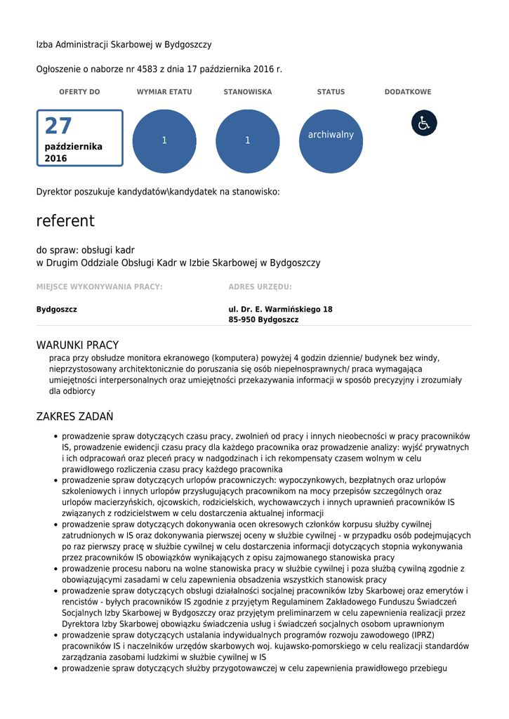 Izba Administracji Skarbowej w Bydgoszczy Ogłoszenie o naborze nr 4583 z dnia 17 października 2016 r. OFERTY DO 27 października 2016 WYMIAR ETATU STANOWISKA 1 1 STATUS DODATKOWE archiwalny Dyrektor poszukuje kandydatów\kandydatek na stanowisko: referent do spraw: obsługi kadr w Drugim Oddziale Obsługi Kadr w Izbie Skarbowej w Bydgoszczy MIEJSCE WYKONYWANIA PRACY: ADRES URZĘDU: Bydgoszcz ul. Dr. E. Warmińskiego 18 85-950 Bydgoszcz WARUNKI PRACY praca przy obsłudze monitora ekranowego (komputera) powyżej 4 godzin dziennie/ budynek bez windy, nieprzystosowany architektonicznie do poruszania się osób niepełnosprawnych/ praca wymagająca umiejętności interpersonalnych oraz umiejętności przekazywania informacji w sposób precyzyjny i zrozumiały dla odbiorcy ZAKRES ZADAŃ prowadzenie spraw dotyczących czasu pracy, zwolnień od pracy i innych nieobecności w pracy pracowników IS, prowadzenie ewidencji czasu pracy dla każdego pracownika oraz prowadzenie analizy: wyjść prywatnych i ich odpracowań oraz pleceń pracy w nadgodzinach i ich rekompensaty czasem wolnym w celu prawidłowego rozliczenia czasu pracy każdego pracownika prowadzenie spraw dotyczących urlopów pracowniczych: wypoczynkowych, bezpłatnych oraz urlopów szkoleniowych i innych urlopów przysługujących pracownikom na mocy przepisów szczególnych oraz urlopów macierzyńskich, ojcowskich, rodzicielskich, wychowawczych i innych uprawnień pracowników IS związanych z rodzicielstwem w celu dostarczenia aktualnej informacji prowadzenie spraw dotyczących dokonywania ocen okresowych członków korpusu służby cywilnej zatrudnionych w IS oraz dokonywania pierwszej oceny w służbie cywilnej - w przypadku osób podejmujących po raz pierwszy pracę w służbie cywilnej w celu dostarczenia informacji dotyczących stopnia wykonywania przez pracowników IS obowiązków wynikających z opisu zajmowanego stanowiska pracy prowadzenie procesu naboru na wolne stanowiska pracy w służbie cywilnej i poza służbą cywilną zgodnie z obowiązującymi zasadami w celu zapewnienia obsadzenia wszystkich stanowisk pracy prowadzenie spraw dotyczących obsługi działalności socjalnej pracowników Izby Skarbowej oraz emerytów i rencistów - byłych pracowników IS zgodnie z przyjętym Regulaminem Zakładowego Funduszu Świadczeń Socjalnych Izby Skarbowej w Bydgoszczy oraz przyjętym preliminarzem w celu zapewnienia realizacji przez Dyrektora Izby Skarbowej obowiązku świadczenia usług i świadczeń socjalnych osobom uprawnionym prowadzenie spraw dotyczących ustalania indywidualnych programów rozwoju zawodowego (IPRZ) pracowników IS i naczelników urzędów skarbowych woj. kujawsko-pomorskiego w celu realizacji standardów zarządzania zasobami ludzkimi w służbie cywilnej w IS prowadzenie spraw dotyczących służby przygotowawczej w celu zapewnienia prawidłowego przebiegu teoretycznego i praktycznego przygotowania pracownika IS podejmującego pracę po raz pierwszy prowadzenie spraw dotyczących zawierania z pracownikami umów o używaniu samochodu prywatnego pracownika dla potrzeb służbowych WYMAGANIA NIEZBĘDNE Wykształcenie: średnie Dobra znajomość przepisów prawa z zakresu: służby cywilnej, prawa pracy, funduszu socjalnego Komunikatywność Posiadanie obywatelstwa polskiego Korzystanie z pełni praw publicznych Nieskazanie prawomocnym wyrokiem za umyślne przestępstwo lub umyślne przestępstwo skarbowe WYMAGANIA DODATKOWE Wykształcenie: wyższe w zakresie zarządzania zasobami ludzkimi, prawnicze, administracyjne lub ekonomiczne albo nieprofilowane uzupełnione studiami podyplomowymi w zakresie prawa pracy Umiejętność obsługi systemów informatycznych funkcjonujących w resorcie finansów wymaganych na danym stanowisku Umiejętność pracy w zespole Odporność na stres DOKUMENTY I OŚWIADCZENIA NIEZBĘDNE Życiorys/CV i list motywacyjny Kopie dokumentów potwierdzających spełnienie wymagania niezbędnego w zakresie wykształcenia Oświadczenie o posiadaniu obywatelstwa polskiego albo kopia dokumentu potwierdzającego posiadanie polskiego obywatelstwa Oświadczenie o wyrażeniu zgody na przetwarzanie danych osobowych do celów naboru Oświadczenie o korzystaniu z pełni praw publicznych Oświadczenie o nieskazaniu prawomocnym wyrokiem za umyślne przestępstwo lub umyślne przestępstwo skarbowe DOKUMENTY I OŚWIADCZENIA DODATKOWE kopia dokumentu potwierdzającego niepełnosprawność - w przypadku kandydatek/kandydatów, zamierzających skorzystać z pierwszeństwa w zatrudnieniu w przypadku, gdy znajdą się w gronie najlepszych kandydatek/kandydatów Kopie dokumentów potwierdzających spełnienie wymagania dodatkowego w zakresie wykształcenia TERMINY I MIEJSCE SKŁADANIA DOKUMENTÓW Dokumenty należy złożyć do: 27 października 2016 r. Decyduje data: stempla pocztowego / osobistego dostarczenia oferty do urzędu Miejsce składania dokumentów: Izba Skarbowa w Bydgoszczy ul. Dr. E. Warmińskiego 18 85-950 Bydgoszcz z dopiskiem „ oferta pracy KA2” INNE INFORMACJE: W miesiącu poprzedzającym datę upublicznienia ogłoszenia wskaźnik zatrudnienia osób niepełnosprawnych w urzędzie, w rozumieniu przepisów o rehabilitacji zawodowej i społecznej oraz zatrudnianiu osób niepełnosprawnych, nie wynosi co najmniej 6%. Oferty złożone lub wysłane po terminie nie będą rozpatrywane. Dokumenty zawarte w ofercie pracy, w szczególności oświadczenia powinny być opatrzone datą i własnoręcznym podpisem. Wzory oświadczeń dostępne na stronie www.bydgoszcz.apodatkowa.gov.pl (zakładka: Ogłoszenia → Nabór). Proponowane wynagrodzenie zasadnicze wynosi 2 810,76 zł brutto – przy ustalonym mnożniku kwoty bazowej 1,500. Oferty odrzucone zostaną komisyjnie zniszczone. Informacje dotyczące procedury naboru można uzyskać pod nr telefonu 52 58 56 181 lub pisząc na adres e-mail: [email protected] Legenda Pierwszeństwo dla osób z niepełnosprawnościami Ogłoszenie z tym symbolem 