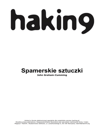 Spamerskie sztuczki John Graham-Cumming Artykuł w formie elektronicznej specjalnie dla czytelników serwisu hacking.pl. Wszelkie prawa zastrzeżone. Rozpowszechnianie dozwolone pod warunkiem zachowania formy i treści. Magazyn “Hakin9”, Wydawnictwo Software, ul. Lewartowskiego 6, 00-190 Warszawa, [email protected] Spamerskie sztuczki John Graham-Cumming Spamerzy stosują różnego rodzaju sztuczki, których celem jest oszukanie filtrów antyspamowych. Zobaczmy, jak sztuczki te wyglądają w praktyce i jak filtry antyspamowe pokonują spamerów ich własną bronią. S ztuczki stosowane przez spamerów można podzielić na trzy rodzaje. Po pierwsze, spamerzy starają się ukryć niepożądane słowa (na przykład Viagra) w taki sposób, by nie zostały one zauważone przez filtr. Po drugie, umieszczają w wiadomościach słowa o niewinnym brzmieniu, niewidoczne dla czytającego, lecz wykrywane przez filtr, który w efekcie uznaje, że wiadomość nie jest spamem. Po trzecie, maskują podawane w wiadomościach adresy swoich stron, ponieważ są świadomi tego, że te adresy mogą ich zdradzić. Atak Ukrywanie niepożądanych słów Spamerzy najczęściej chcą ukryć słowa, na podstawie których wiadomość można łatwo rozpoznać jako spam. Używają rozmaitych metod przetworzenia słów takich jak Viagra do postaci niezrozumiałej dla filtru antyspamowego, jednak czytelnej dla człowieka. Pozwala to oszukać najprostsze filtry, które wykrywają obecność słowa Viagra; oczywiście bardziej wymyślny filtr potrafi szukać tekstu według schematu <litera><spacja><litera><spacja>... i odtworzyć zakamuflowane w ten sposób słowo. Spamerzy używają więc również innych znaków do rozdzielania liter, np.: V'I'A'G'R'A, V.I.A.G.R.A, V*I*A*G*R*A Filtry antyspamowe potrafią jednak w stosunkowo prosty sposób wykryć tego rodzaju zabiegi i orientować się, że w Z artykułu nauczysz się... • Co powinieneś wiedzieć... • Nieco przestrzeni Najprostszy sposób polega na wstawieniu do słowa, które ma zostać ukryte, znaków spacji. jakimi sztuczkami posługują się spamerzy w celu oszukania filtrów bayesowskich i heurystycznych. • znać podstawy filtrowania bayesowskiego i heurystycznego (omówione w poprzednim numerze naszego pisma), ogólnie orientować się w językach HTML i Javascript. V I A G R A 2 www.hakin9.org Hakin9 Nr 3/2004 Spamerskie sztuczki wiadomości mowa jest o Viagrze. Na tym prostym przykładzie widać jednak, że nie warto stosować filtrów heurystycznych wymagających samodzielnego aktualizowania reguł – sens ma jedynie stosowanie filtrów aktualizowanych automatycznie. Dostosowanie reguł nawet dla tak prostej sztuczki, jak przedstawiona powyżej, wymagałoby wiele pracy ze strony użytkownika. Można nawet spotkać wiadomości, w których zastosowano zgoła inną technikę – z tekstu usunięto wszystkie spacje, wstawiając w ich miejsce losowo wybrane litery: słowo nie zwracając uwagi na samogłoski, jednak filtr może zostać oszukany. Filtr może poradzić sobie z tego typu sztuczką przypisując każdej samogłosce ze znakiem akcentu jej oryginalny odpowiednik, otrzymując w rezultacie rzeczywiste słowo. Ze względu na łatwość wykrywania obu przedstawionych technik przez stosowane dziś filtry antyspamowe, spamerzy zaczęli szukać nowych sposobów dostawania się do skrzynek pocztowych. Wykorzystują do tego HTML. DidAyouFknowNyouMcanBget Kolejnym sposobem zakamuflowania słowa Viagra jest zastosowanie encji języka HTML, które służą do umieszczania w tekście znaków specjalnych lub znaków spoza alfabetu angielskiego. Encje zapisywane są jako liczby poprzedzone znakami &#, a zakończone znakiem ;. Chcąc na przykład umieścić w tekście francuski znak é, piszemy w HTML-u é, z kolei grecką literę ∑ otrzymamy po wpisaniu Ε. Znaki należące do podstawowego alfabetu angielskiego także mają odpowiadające im encje. Przykładowo, literę A można zapisać jako A. Podstępny spamer mógłby zatem zapisać całe słowo Viagra przy zastosowaniu encji: Via VprescriptionVmedications prescribedTonlineTwith NORPRIORRPRESCRIPTIONRREQUIRED! Nie wydaje się jednak, by technika ta była szczególnie skuteczna, ponieważ taka wiadomość jest w rezultacie nieczytelna dla człowieka. Øbcÿ ākçênt Spamerzy, przeprowadzając testy sprawdzające, jak na wysyłane przez nich wiadomości reagują darmowe i komercyjne programy filtrujące, szybko zorientowali się, że tak proste sposoby ukrywania słów nie są zbyt skuteczne. Zaczęli więc stosować metody, w których zamieniane są litery składające się na słowo Viagra. W tablicy znaków ASCII można znaleźć wiele samogłosek ze znakami akcentu, które spamerzy wstawiają do ukrywanego słowa w zastępstwie oryginalnych samogłosek: • • • • • a: à á â ã ä å, e: è é ê ë, i: ì í î ï, o: ò ó ô õ ö, u: ù ú û ü. Przy zastosowaniu różnych wariantów samogłosek a oraz i spamer może zapisać słowo Viagra na 144 różne sposoby, jak choćby Víagra, Viågra, Vîãgrä. Anglojęzyczny odbiorca wiadomości przeczyta takie Hakin9 Nr 3/2004 Nie z nami takie numery gra Także w tym przypadku odpowiednio przygotowany filtr antyspamowy rozpozna encje HTML i odkryje, jakie słowo zostało w ten sposób zamaskowane. Istnieją jednak znacznie bardziej wyrafinowane metody kamuflowania słowa Viagra, wykorzystujące możliwości formatowania dostępne w języku HTML. HTML tu i tam Polecenia formatujące języka HTML zapisywane są w postaci tzw. znaczników, czyli instrukcji umieszczanych pomiędzy nawiasami trójkątnymi < >. Przykładowo, chcąc zapisać słowo Witaj tekstem pogrubionym, piszemy w HTML-u <b>Witaj</b>. Znacznik <b> oznacza początek tek- www.hakin9.org stu pogrubionego, natomiast </b> oznacza koniec tekstu pogrubionego. Tekst pomiędzy tymi znacznikami będzie widoczny w przeglądarce lub programie pocztowym obsługującym HTML jako pogrubiony.