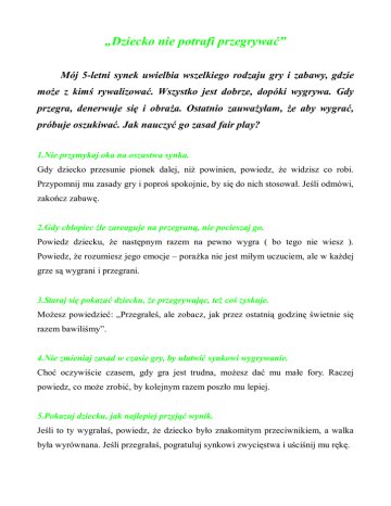 „Dziecko nie potrafi przegrywać” Mój 5-letni synek uwielbia wszelkiego rodzaju gry i zabawy, gdzie moŜe z kimś rywalizować. Wszystko jest dobrze, dopóki wygrywa. Gdy przegra, denerwuje się i obraŜa. Ostatnio zauwaŜyłam, Ŝe aby wygrać, próbuje oszukiwać. Jak nauczyć go zasad fair play? 1.Nie przymykaj oka na oszustwa synka. Gdy dziecko przesunie pionek dalej, niŜ powinien, powiedz, Ŝe widzisz co robi. Przypomnij mu zasady gry i poproś spokojnie, by się do nich stosował. Jeśli odmówi, zakończ zabawę. 2.Gdy chłopiec źle zareaguje na przegraną, nie pocieszaj go. Powiedz dziecku, Ŝe następnym razem na pewno wygra ( bo tego nie wiesz ). Powiedz, Ŝe rozumiesz jego emocje – poraŜka nie jest miłym uczuciem, ale w kaŜdej grze są wygrani i przegrani. 3.Staraj się pokazać dziecku, Ŝe przegrywając, teŜ coś zyskuje. MoŜesz powiedzieć: „Przegrałeś, ale zobacz, jak przez ostatnią godzinę świetnie się razem bawiliśmy”. 4.Nie zmieniaj zasad w czasie gry, by ułatwić synkowi wygrywanie. Choć oczywiście czasem, gdy gra jest trudna, moŜesz dać mu małe fory. Raczej powiedz, co moŜe zrobić, by kolejnym razem poszło mu lepiej. 5.Pokazuj dziecku, jak najlepiej przyjąć wynik. Jeśli to ty wygrałaś, powiedz, Ŝe dziecko było znakomitym przeciwnikiem, a walka była wyrównana. Jeśli przegrałaś, pogratuluj synkowi zwycięstwa i uściśnij mu rękę.