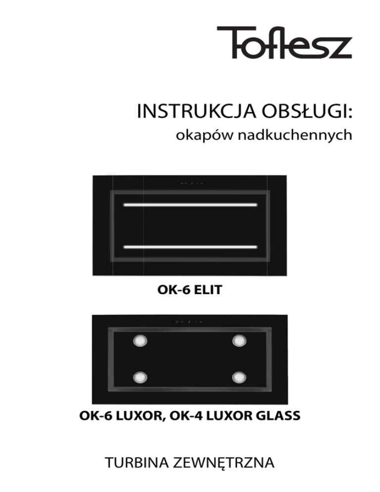 INSTRUKCJA OBSŁUGI: okapów nadkuchennych OK-6 ELIT OK-6 LUXOR, OK-4 LUXOR GLASS TURBINA ZEWNĘTRZNA Szanowny Kliencie Staliście się Państwo właścicielami najnowszej generacji okapu nadkuchennego. Okap ten został zaprojektowany i wykonany specjalnie z myślą o spełnieniu Państwa oczekiwań i z pewnością będzie stanowić część nowocześnie wyposażonej kuchni. Zastosowane w nim nowoczesne rozwiązania konstrukcyjne i użycie najnowszej technologii produkcji, zapewniają mu wysoką funkcjonalność i estetykę. Przed przystąpieniem do montażu okapu prosimy o dokładne zapoznanie się z treścią niniejszej instrukcji. Dzięki temu unikną Państwo błędnej instalacji i obsługi okapu. Życzymy satysfakcji i zadowolenia z wyboru okapu firmy Toflesz. I. SPECJALNE INSTRUKCJE DOTYCZĄCE BEZPIECZNEGO DZIAŁANIA OKAPU 1. Przed przystąpieniem do montażu należy dokładnie przeczytać niniejszą instrukcję. 2. Instalację okapu należy przeprowadzić zgodnie z opisem i wytycznymi przedstawionymi w rozdziale „Montaż”. 3. Okap nadkuchenny może być podłączony tylko do gniazda zasilającego o napięciu znamionowym 230V~ i częstotliwości 50Hz. Przed podłączeniem okapu należy sprawdzić, czy gniazdo jest wyposażone w sprawnie funkcjonujące uziemienie. 4. Niedopuszczalne jest, aby elektryczne gniazda zasilające instalacji stałej znajdowały się pod okapem. 5. Należy zwracać uwagę, aby przewód zasilający nie znajdował się pod okapem. 6. Jeżeli przewód zasilający nieodłączalny ulegnie uszkodzeniu, to powinien on być wymieniony u wytwórcy lub u pracownika zakładu serwisowego albo przez wykwalifikowaną osobę w celu uniknięcia zagrożenia. 2 7. W przypadku uszkodzenia okapu, naprawa może być przeprowadzona u wytwórcy lub u pracownika zakładu serwisowego albo przez wykwalifikowaną osobę. 8. Należy zwracać uwagę, aby w pomieszczeniu była odpowiednia wentylacja powietrza, gdy okap nadkuchenny jest używany w tym samym czasie, co urządzenia spalające gaz lub inne paliwa (nie dotyczy tylko okapów pracujących jako pochłaniacze zapachów, które dostarczają powietrze z powrotem do pomieszczenia). 9. Szczegóły dotyczące sposobu i częstotliwości czyszczenia są opisane w rozdziale „Konserwacja”. 10. Przed każdą operacja czyszczenia, wymianą filtra lub wymianą lampy należy wyjąc wtyczkę okapu z elektrycznego gniazda zasilającego lub w przypadku okapu na stałe podłączonego do instalacji elektrycznej odłączyć zasilanie. 11. Istnieje ryzyko pożaru, jeżeli czyszczenie nie odbywa się zgodnie z zaleceniami. 12. Pod okapem nadkuchennym nie wolno pozostawiać odkrytego płomienia, podczas zdejmowania naczyń znad palnika, należy ustawić płomień minimalny. 13. Potrawy przygotowywane na tłuszczach powinny być stale nadzorowane, ponieważ nagrzany tłuszcz może się łatwo zapalić. 14. UWAGA: Dostępne części okapu mogą się nagrzewać w przypadku korzystania z urządzenia do gotowania. 15. Niniejszy sprzęt może być użytkowany przez dzieci w wieku co najmniej 8 lat i przez osoby o obniżonych możliwościach fizycznych, umysłowych i osoby o braku doświadczenia i znajomości sprzętu, jeżeli zapewniony zostanie nadzór lub instruktaż odnośnie do użytkowania sprzętu w bezpieczny sposób, tak aby związane z tym zagrożenia były zrozumiałe. Dzieci nie powinny bawić się sprzętem. Dzieci bez nadzoru nie powinny wykonywać czyszczenia i konserwacji sprzętu. 3 II. CHARAKTERYSTYKA Okap nadkuchenny służy do usuwania oparów kuchennych. Jest on przeznaczony do użytku domowego. Okap wymaga zainstalowania przewodu odprowadzającego powietrze na zewnątrz. Po zainstalowaniu filtra z węglem aktywnym okap może pracować jako pochłaniacz zapachów. W tym przypadku nie wymaga się instalacji przewodu odprowadzającego powietrze na zewnątrz. Okap jest urządzeniem elektrycznym wykonanym w I klasie ochrony przeciwporażeniowej. Posiada niezależne oświetlenie LEDowe oraz wentylator wyciągowy z możliwością ustawienia jednej z czterech prędkości obrotowych. Okap przeznaczony jest do trwałego zamontowania na suficie ponad kuchenką gazową lub elektryczną. Okap można zawiesić tylko na suficie o konstrukcji betonowej lub na odpowiednio przygotowanym stelażu jeżeli sufit jest wykonany z karton-gipsu. III. DANE TECHNICZNE Napięcie zasilania: Ilość silników wentylatora: 1 Ilość filtrów aluminiowych: 3 lub 4 Oświetlenie: Ilość stopni prędkości: Szerokość: Średnica wylotu: LUXOR/LUXOR GLASS – 4 x 2 W LED SMD ELIT – 2 x 4 W paski LED 4 ELIT – 960 / 1200 mm LUXOR/LUXOR GLASS – 960 mm Ø 150 mm lub Ø 120 mm Maksymalna wydajność: 700 m3/h lub 850 m3/h Maksymalny pobór mocy: LUXOR/LUXOR GLASS/ELIT 218 W (turbina 700) LUXOR/LUXOR GLASS/ELIT 258 W (turbina 850) Poziom głośności: 1 bieg 2 bieg 3 bieg 4 bieg (intensywny) Rodzaj pracy: 4 230V~50Hz 700 m3/h 850 m3/h 44 dB(A) 42 dB(A) 51 dB(A) 50 dB(A) 57 dB(A) 59 dB(A) 64 dB(A) 69 dB(A) wyciąg lub pochłaniacz RYSUNKI TECHNICZNE Okap Luxor waga netto – 18,50 kg waga brutto – 22,30 kg Okap Luxor Glass/Elit waga netto – 20,50 kg waga brutto – 24,30 kg 5 IV. ZAWARTOŚĆ ZESTAWU ELEMENTY MONTAŻOWE ŚRUBY MONTAŻOWE 2 1 A 4 x śruba M4 okap ELIT/ LUXOR/ LUXOR GLASS 2 x maskownica z rozetą 3 4 B 8 x blachowkręt samowiercący 2,9 x 9 mm AKCESORIA 2 x stelaż l metalowy redukcja Ø 150 / Ø 120 5 pilota zdalnego sterowania kabel łączący okap z turbiną (4 m.) 6 V. MONTAŻ Powietrze odprowadzane z okapu nie może być odprowadzane do komina, który jest używany do odprowadzania spalin z urządzeń spalających gaz lub inne paliwa. Przed przystąpieniem do montażu okapu należy podłączyć go do sieci elektrycznej (230V~50Hz) w celu sprawdzenia czy oświetlenie i silnik działają prawidłowo. W miejscu instalacji okapu powinien być zapewniony w miarę łatwy dostęp do gniazda elektrycznego w celu awaryjnego wyjęcia wtyczki i przer