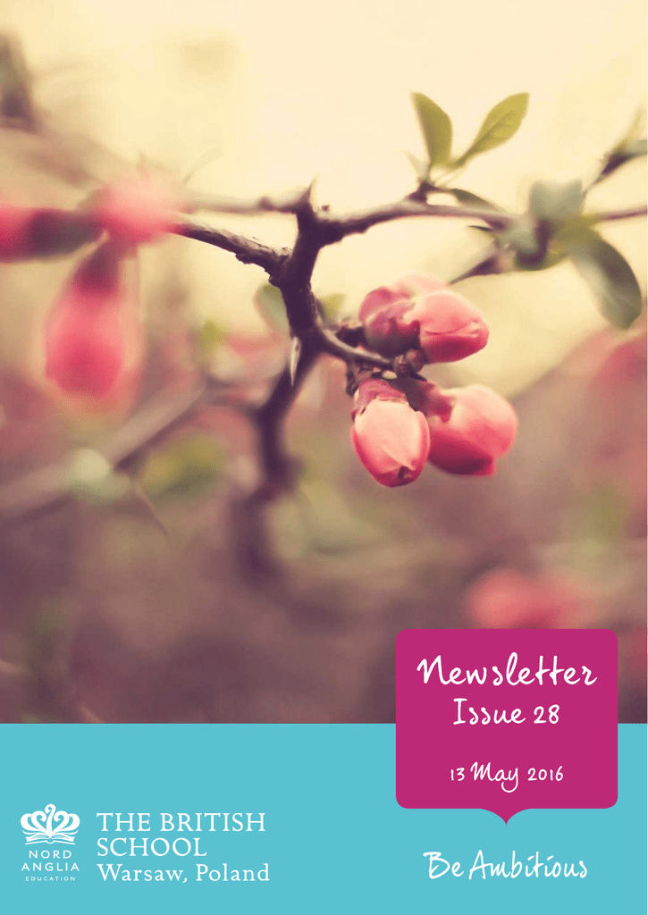 Newsletter Issue 28 13 May 2016 Be Ambitious Message from the Head of Early Years Centre Dear Parents, This week, as the summer and the end of the school year beckons, we have welcomed many of you into school to discuss your children’s progress and to make plans for next year. Here at Dabrowskiego the groupings are a little different to Limanowskiego in terms of the numbers of classes in each year group and also the children leaving us at the end of the year to begin exciting new adventures all around the world. To this end, we have made the decision to divide the year groups as they move up through the Early Years centre this year because many of the classes are now a little uneven in terms of the spread of children. We will, of course, be keeping friendship groupings together as the children go up. I would echo Ms Richardson’s sentiments and ask that, if you feel that your child has a specific need in the classroom, please let us know as we will always do our best to place the children in a class and with a teacher where they will flourish. Our assembly this week centred on the importance of looking after our own belongings in school and returning any items found at home to school. It has been a pleasure to see our school lost property box reducing in size this week during the parents’ evenings and many ‘lost’ reading books have come back to us. Please have another look at home this weekend just to see if there is anything that needs to be returned. We welcome back all items of sports kit, books, water bottles, odd gloves, socks………………thank you. During our assembly we also practised some very special songs for a very special day in two weeks time, but we can’t tell you anything else, because it is a secret. I hope you enjoy another lovely weekend. Kind Regards, Deborah Hopper Head of Early Years Photos from Dąbrowskiego Message from the Head of Primary Dear Parents, Over the past three months we have focused on the recruitment of exceptional teachers. Mr Waterhouse, Mrs Hopper and I have spoken to dozens of applicants for positions at Dabrowskiego and Limanowskiego. Our expectation is that teachers will be exceptional practitioners and have a proven track record of creating exciting and inspiring learning environments. In September, we will be welcoming a number of new staff members across the school. They will be joining us from UK schools as well as several highly respected international schools abroad. New staff profiles will be added to the School website in the coming weeks. This year we will not be making any major changes to class groupings. Obviously there will be minor changes when the number of classes in a year group is increasing (Year 1 to Year 2, Year 5 to Year 6). Primary staff found that this was very successful in September 2015, with students settling very quickly into their new year groups. In the majority of cases, students have formed firm friendships over the past 12 months and it is important that as they commence the new academic year, they feel secure in their social circles. I urge parents NOT to send emails to the school making requests for certain teachers. Rather I encourage parents to provide us with information regarding the specific needs of your child. It is the responsibility of the Head of Primary and staff members at The British School to use our professional judgement for class placements. Our staff know and understand our students they work with them every day, observing, talking and learning with them. Please rest assured we will do the best for you and all of our students. Zoë Richardson Head of Primary Save the date! 4 JUNE 2016 TH INTERNATIONAL CHILDREN’S FAIR Primary News Passion and Enrichment at The British School, Warsaw Here at The British School of Warsaw, we not only seek to deliver the highest academic curriculum but we aim to provide a vigorous holistic and enriching curriculum. Last week, Year 5 had a guest speaker, Mr. Maciejewski, to talk about his job as a photographer. Mr. Maciejewski, part of our talented parent community at TBSW, kindly gave up this time to come in and speak to the children. He spoke about his photography and what is required to be a photographer (an aspect which Year 5 are covering in Computing this term) but he also delivered a message that all children, parents and teachers should never lose sight of – a message of ‘Passion’ and ‘Expression’. The meaningful change in this creative age, which we all seek as educators, parents and pupils, can mostly be found through independent and collaborative creativity. This is ignited by passion, in all that we seek to undertake and do. We need and seek to instil passion in our teachers, parents and most importantly the pupils we facilitate in becoming ‘The Best That They Can Be’. The past few weeks (and on a daily basis) we have seen a host of examples of passion – some examples include: daily teaching and learning, the Primary drama production, the Year 6 visit to MIT and the upcoming talent show (arranged by our very active and passionate pupil council!). What was also importantly highlighted, through Mr Maciejewski’s own experience, was the emphasis on it never being to late to find or change your passion. Passion is what will and should shape our future society for the ‘greater good’. “The only way you can do great work is to love what you do” - Steve Jobs David McCammon Learning Leader for Year 5 and KS1 Science (Photos copyrighted by Bartosz Maciejewski, courtesy of http://www.bartoszmaciejewski.pl) Message from the Head of Secondary Dear Parents, As the weather took a turn for the better there seemed to be a spring in everyone’s step. We have achieved some marvelous things of late and I have included some articles in this newsletter to let you know of some of our students’ achievements. The examination season is well and truly upon us now. Both IB and IGCSE students have begun external examinations and now th