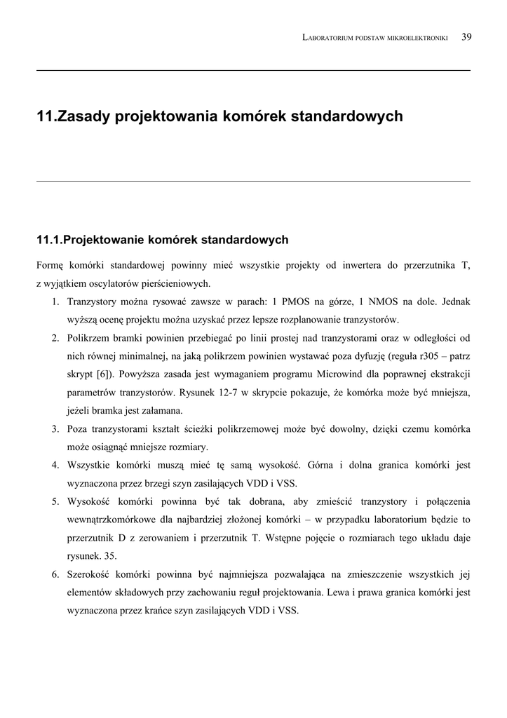 LABORATORIUM PODSTAW MIKROELEKTRONIKI 39 11.Zasady projektowania komórek standardowych 11.1.Projektowanie komórek standardowych Formę komórki standardowej powinny mieć wszystkie projekty od inwertera do przerzutnika T, z wyjątkiem oscylatorów pierścieniowych. 1. Tranzystory można rysować zawsze w parach: 1 PMOS na górze, 1 NMOS na dole. Jednak wyższą ocenę projektu można uzyskać przez lepsze rozplanowanie tranzystorów. 2. Polikrzem bramki powinien przebiegać po linii prostej nad tranzystorami oraz w odległości od nich równej minimalnej, na jaką polikrzem powinien wystawać poza dyfuzję (reguła r305 – patrz skrypt [6]). Powyższa zasada jest wymaganiem programu Microwind dla poprawnej ekstrakcji parametrów tranzystorów. Rysunek 12-7 w skrypcie pokazuje, że komórka może być mniejsza, jeżeli bramka jest załamana. 3. Poza tranzystorami kształt ścieżki polikrzemowej może być dowolny, dzięki czemu komórka może osiągnąć mniejsze rozmiary. 4. Wszystkie komórki muszą mieć tę samą wysokość. Górna i dolna granica komórki jest wyznaczona przez brzegi szyn zasilających VDD i VSS. 5. Wysokość komórki powinna być tak dobrana, aby zmieścić tranzystory i połączenia wewnątrzkomórkowe dla najbardziej złożonej komórki – w przypadku laboratorium będzie to przerzutnik D z zerowaniem i przerzutnik T. Wstępne pojęcie o rozmiarach tego układu daje rysunek. 35. 6. Szerokość komórki powinna być najmniejsza pozwalająca na zmieszczenie wszystkich jej elementów składowych przy zachowaniu reguł projektowania. Lewa i prawa granica komórki jest wyznaczona przez krańce szyn zasilających VDD i VSS. 40 LABORATORIUM PODSTAW MIKROELEKTRONIKI 7. Komórki są łączone ze sobą na jeden z dwóch sposobów: a)zetknięcie w poziomie, tworząc rzędy, przy czym jedna lub obie komórki mogą być odbite względem linii pionowej; b)zetknięcie w pionie, jako składniki dwóch sąsiednich rzędów, przy czym jedna z komórek musi być wówczas odbita względem linii poziomej (VDD lub VSS jednej z komórek łączymy z VDD drugiej) oraz jedna lub obie mogą być odbite względem linii pionowej. Biorąc pod uwagę przypadek a), szyny zasilania i studnie obu komórek na ich granicy powinny być idealne dopasowane. Położenie szyn zasilania i studni powinno być utrzymane przez całą szerokość komórki. W celu minimalizacji rozmiarów komórki, wysokość studni może być wewnątrz komórki zwiększona lub zmniejszona, jednak należy wówczas zwrócić szczególną uwagę na zapewnienie zachowania reguł projektowania przy składaniu komórek (reguły r101, r102, r203, r204). Biorąc pod uwagę przypadek b), przebieg szyn zasilania i studni powinien zapewnić ich połączenie na całej szerokości granicy komórek. 8. Szyny zasilające prowadzić należy metalem 1. Ich wysokość powinna uwzględniać fakt zasilania dużej liczby komórek. 9. Na całej szerokości komórki na szynie zasilania powinny się znajdować kontakty polaryzujące odpowiednio podłoże lub studnię. Skrajne kontakty powinny znajdować się jak najbliżej skraju komórki. Odległość kontaktów od zewnętrznego i bocznych skrajów komórki powinna gwarantować zachowanie reguł projektowania przy składaniu komórek w poziomie lub pionie (r202). 10. Wszystkie ścieżki metali (oprócz realizujących połączenia komórki z innymi komórkami, w tym szyn zasilania), ścieżki polikrzemu oraz dyfuzje N+ i P+ muszą znajdować się w odpowiedniej odległości od lewego i prawego skraju komórki, aby przy składaniu komórek w poziomie nie naruszyć reguł projektowania (r202, r302, r502, r702). 11. Studnia powinna wykraczać poza szynę zasilania z lewej strony, z prawej strony oraz na zewnątrz na minimalną odległość, na jaką studnia powinna wykraczać poza znajdującą się w niej dyfuzję (reguła r203), pomniejszoną o odległość, o jaką metal szyn zasilania wykracza poza dyfuzję skrajnego kontaktu (zasada 7). 12. Każde wejście i każde wyjście komórki powinno posiadać kontakt do metalu 2. Do tego punktu zostanie przyłączona ścieżka metalu 2 lub 3 łącząca komórkę z inną (innymi). 13. Połączenia wewnątrz komórki wykonujemy przede wszystkim metalem 1. Jeżeli zachodzi konieczność skrzyżowania dwóch ścieżek metalicznych, to na jednej z nich należy zrobić mostek metalem 2 (jak najkrótszy, bo metal ten zasadniczo jest przeznaczony do prowadzenia w pionie LABORATORIUM PODSTAW MIKROELEKTRONIKI 41 połączeń na zewnątrz komórki); w ostateczności mostek można wykonać z metalu 3. Sygnały dołączane do bramek można również prowadzić polikrzemem, szczególnie jeżeli pozwala to na wyeliminowanie dodatkowych kontaktów. 14. Dla zapewnienia jak najlepszych warunków polaryzacji, sygnały do źródeł i drenów tranzystorów doprowadza się za pośrednictwem maksymalnej liczby kontaktów mieszczących się na obszarze dyfuzji; metal powinien ciągnąć się nieprzerwanie od pierwszego do ostatniego kontaktu. 15. Szerokość polikrzemu w tranzystorach powinna odpowiadać optymalnej (czyli minimalnej) długości kanału. Poza tranzystorami, począwszy od minimalnej odległości, na jaką polikrzem powinien wystawać poza dyfuzję (reguła r305), ścieżki polikrzemu mogą być poszerzone do 3–4 λ, co pozwala zmniejszyć ich rezystancję. 11.2.Łączenie komórek standardowych Licznik powinien być układem złożonym z odpowiedniej liczby komórek standardowych. Poszczególne komórki standardowe należy rozmieścić tak, aby uzyskać minimalne długości połączeń między nimi oraz kształt całego układu jak najbardziej zbliżony do kwadratu. Połączenia między kontaktami wejścia/wyjścia poszczególnych komórek standardowych należy wykonać prowadząc ścieżki nad komórkami (routing over the cells). W pionie należy stosować metal 2, zaś w poziomie metal 3. Na krótkich odcinkach (porównywalnych z rozmiarami kontaktów) dopu