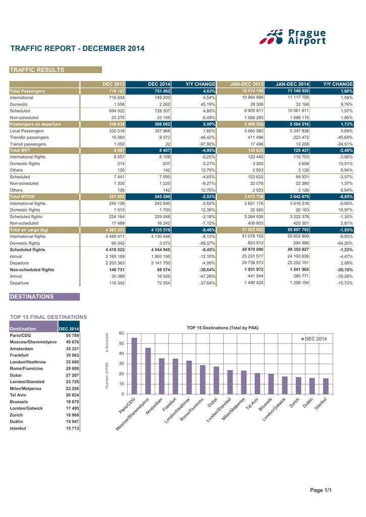TRAFFIC REPORT - DECEMBER 2014 TRAFFIC RESULTS DEC 2013 DEC 2014 Y/Y CHANGE JAN-DEC 2013 JAN-DEC 2014 Total Passengers 718 192 751 462 4,63% 10 974 196 11 149 926 1,60% International 716 634 749 200 4,54% 10 944 888 11 117 758 1,58% Domestic Y/Y CHANGE 1 558 2 262 45,19% 728 307 4,80% 29 308 9 905 911 32 168 10 061 811 9,76% 694 922 23 270 23 155 -0,49% 1 068 285 1 088 115 1,86% Passengers on departure 348 634 366 062 5,00% 5 489 552 5 584 516 1,73% Local Passengers 332 519 357 968 7,65% 5 060 560 5 347 836 5,68% Scheduled Non-scheduled Transfer passengers 1,57% 15 065 8 072 -46,42% 411 496 223 472 -45,69% Transit passengers Total MVT 1 050 8 897 22 8 457 -97,90% -4,95% 17 496 128 633 13 208 125 437 -24,51% -2,48% International flights 8 557 8 108 -5,25% 122 445 118 703 -3,06% 214 207 -3,27% 3 265 3 608 10,51% Domestic flights Others 126 142 12,70% 2 923 3 126 6,94% Scheduled 7 441 7 095 -4,65% 103 632 99 931 -3,57% Non-scheduled 1 330 1 220 -8,27% 22 078 22 380 1,37% 126 142 12,70% 2 923 3 126 6,94% Total MTOW 251 652 245 290 -2,53% 3 673 738 3 642 679 -0,85% International flights 250 139 243 590 -2,62% 3 651 178 3 616 516 -0,95% 1 513 1 700 12,36% 22 560 26 163 15,97% 234 164 229 048 -2,18% 3 264 935 3 222 378 -1,30% 17 488 16 242 -7,12% Total air cargo (kg) 4 565 253 4 133 519 -9,46% 408 803 51 902 062 420 301 50 897 792 -1,93% International flights 4 495 911 4 130 446 -8,13% 51 078 150 50 602 806 -0,93% 69 342 3 073 -95,57% 823 912 294 986 -64,20% Scheduled flights 4 418 522 4 044 945 -8,45% 49 970 090 49 355 827 -1,23% Arrival 2 165 159 1 903 195 -12,10% 25 231 517 24 103 636 -4,47% Departure 2 253 363 2 141 750 -4,95% 24 738 573 25 252 191 2,08% 146 731 88 574 -39,64% 1 931 972 1 541 965 -20,19% 30 389 16 020 -47,28% 441 544 285 771 -35,28% 116 342 72 554 -37,64% 1 490 428 1 256 194 -15,72% Others Domestic flights Scheduled flights Non-scheduled Domestic flights Non-scheduled flights Arrival Departure 2,81% DESTINATIONS TOP 15 FINAL DESTINATIONS TOP 15 Destinations (Total by PAX) 55 789 60 Moscow/Sheremetyevo 45 676 Amsterdam 35 331 in thousand DEC 2014 Frankfurt 35 063 40 London/Heathrow 33 085 30 Rome/Fiumicino 28 608 Dubai 27 207 London/Stansted 23 728 Milan/Malpensa 23 250 Number of PAX Destination Paris/CDG Tel Aviv 20 824 Brussels 19 879 London/Gatwick 17 495 Zurich 16 868 Dublin 15 947 Istanbul 15 713 DEC 2014 50 20 10 0 Page 1/1