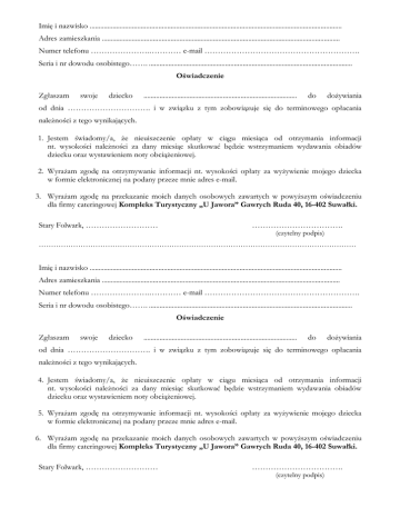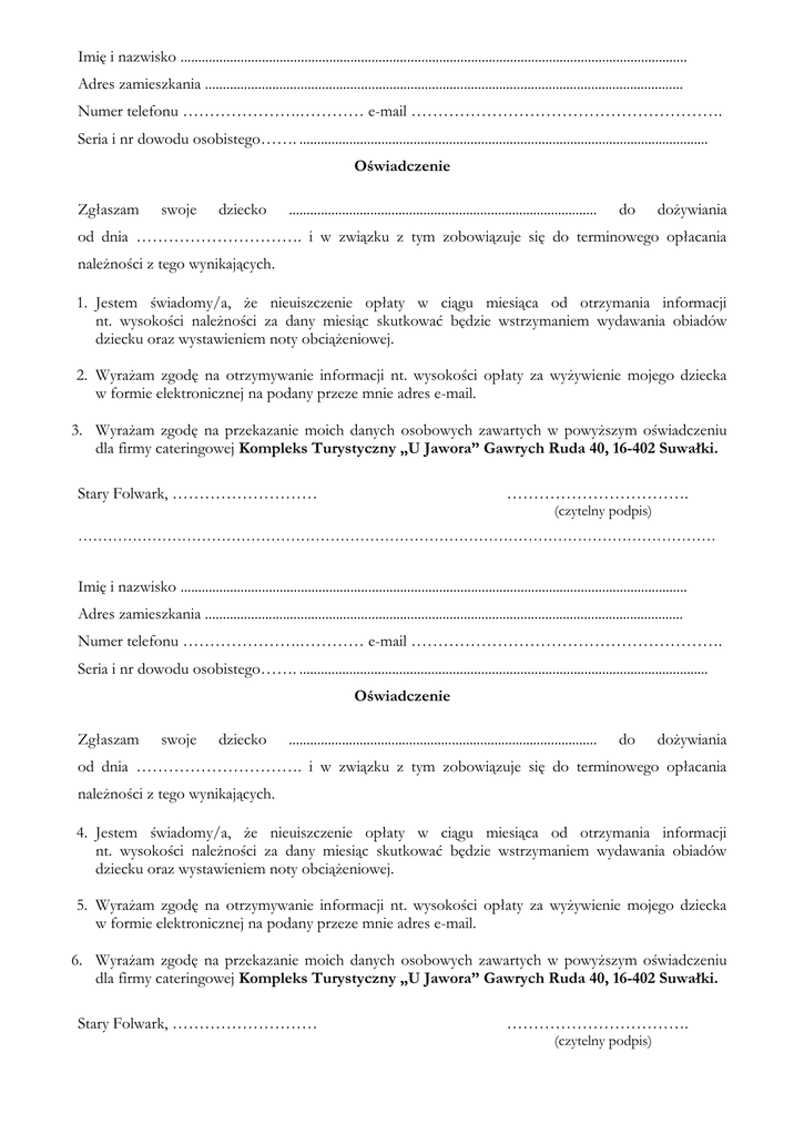 Imię i nazwisko ............................................................................................................................................... Adres zamieszkania ....................................................................................................................................... Numer telefonu ………………….………… e-mail …………………………………………………. Seria i nr dowodu osobistego……. ................................................................................................................... Oświadczenie Zgłaszam swoje dziecko ....................................................................................... do dożywiania od dnia …………………………. i w związku z tym zobowiązuje się do terminowego opłacania należności z tego wynikających. 1. Jestem świadomy/a, że nieuiszczenie opłaty w ciągu miesiąca od otrzymania informacji nt. wysokości należności za dany miesiąc skutkować będzie wstrzymaniem wydawania obiadów dziecku oraz wystawieniem noty obciążeniowej. 2. Wyrażam zgodę na otrzymywanie informacji nt. wysokości opłaty za wyżywienie mojego dziecka w formie elektronicznej na podany przeze mnie adres e-mail. 3. Wyrażam zgodę na przekazanie moich danych osobowych zawartych w powyższym oświadczeniu dla firmy cateringowej Kompleks Turystyczny „U Jawora” Gawrych Ruda 40, 16-402 Suwałki. Stary Folwark, ……………………… ……………………………. (czytelny podpis) ………………………………………………………………………………………………………………… Imię i nazwisko ............................................................................................................................................... Adres zamieszkania ....................................................................................................................................... Numer telefonu ………………….………… e-mail …………………………………………………. Seria i nr dowodu osobistego……. ................................................................................................................... Oświadczenie Zgłaszam swoje dziecko ....................................................................................... do dożywiania od dnia …………………………. i w związku z tym zobowiązuje się do terminowego opłacania należności z tego wynikających. 4. Jestem świadomy/a, że nieuiszczenie opłaty w ciągu miesiąca od otrzymania informacji nt. wysokości należności za dany miesiąc skutkować będzie wstrzymaniem wydawania obiadów dziecku oraz wystawieniem noty obciążeniowej. 5. Wyrażam zgodę na otrzymywanie informacji nt. wysokości opłaty za wyżywienie mojego dziecka w formie elektronicznej na podany przeze mnie adres e-mail. 6. Wyrażam zgodę na przekazanie moich danych osobowych zawartych w powyższym oświadczeniu dla firmy cateringowej Kompleks Turystyczny „U Jawora” Gawrych Ruda 40, 16-402 Suwałki. Stary Folwark, ……………………… ……………………………. (czytelny podpis)