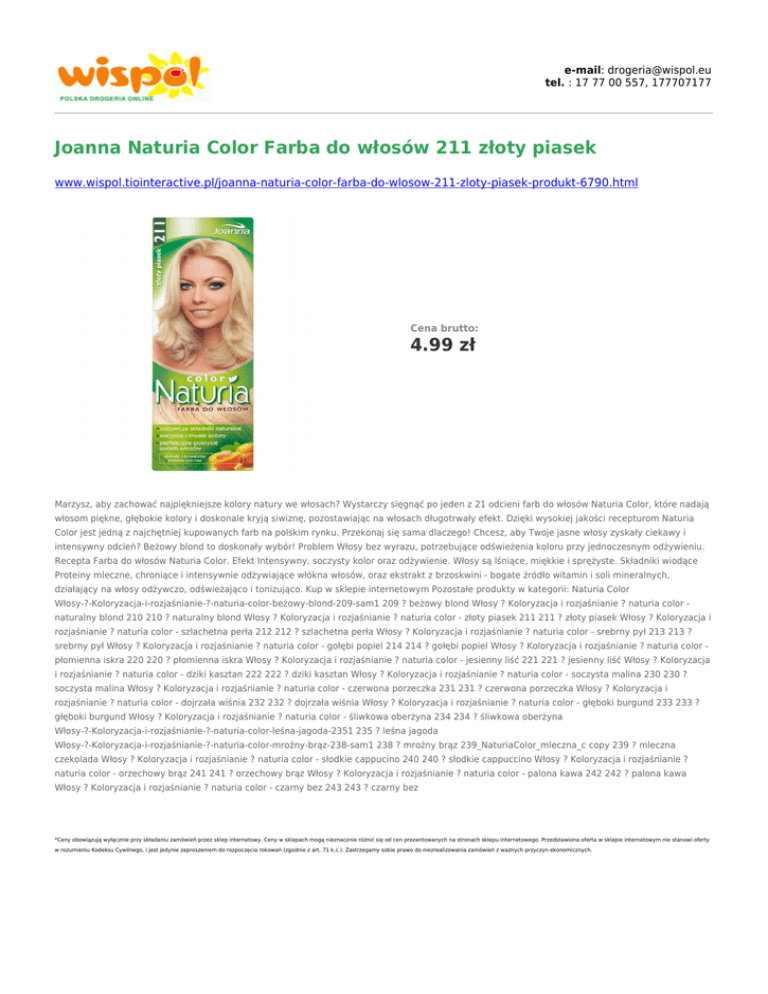 e-mail: [email protected] tel. : 17 77 00 557, 177707177 Joanna Naturia Color Farba do włosów 211 złoty piasek www.wispol.tiointeractive.pl/joanna-naturia-color-farba-do-wlosow-211-zloty-piasek-produkt-6790.html Cena brutto: 4.99 zł Marzysz, aby zachować najpiękniejsze kolory natury we włosach? Wystarczy sięgnąć po jeden z 21 odcieni farb do włosów Naturia Color, które nadają włosom piękne, głębokie kolory i doskonale kryją siwiznę, pozostawiając na włosach długotrwały efekt. Dzięki wysokiej jakości recepturom Naturia Color jest jedną z najchętniej kupowanych farb na polskim rynku. Przekonaj się sama dlaczego! Chcesz, aby Twoje jasne włosy zyskały ciekawy i intensywny odcień? Beżowy blond to doskonały wybór! Problem Włosy bez wyrazu, potrzebujące odświeżenia koloru przy jednoczesnym odżywieniu. Recepta Farba do włosów Naturia Color. Efekt Intensywny, soczysty kolor oraz odżywienie. Włosy są lśniące, miękkie i sprężyste. Składniki wiodące Proteiny mleczne, chroniące i intensywnie odżywiające włókna włosów, oraz ekstrakt z brzoskwini - bogate źródło witamin i soli mineralnych, działający na włosy odżywczo, odświeżająco i tonizująco. Kup w sklepie internetowym Pozostałe produkty w kategorii: Naturia Color Włosy-?-Koloryzacja-i-rozjaśnianie-?-naturia-color-beżowy-blond-209-sam1 209 ? beżowy blond Włosy ? Koloryzacja i rozjaśnianie ? naturia color naturalny blond 210 210 ? naturalny blond Włosy ? Koloryzacja i rozjaśnianie ? naturia color - złoty piasek 211 211 ? złoty piasek Włosy ? Koloryzacja i rozjaśnianie ? naturia color - szlachetna perła 212 212 ? szlachetna perła Włosy ? Koloryzacja i rozjaśnianie ? naturia color - srebrny pył 213 213 ? srebrny pył Włosy ? Koloryzacja i rozjaśnianie ? naturia color - gołębi popiel 214 214 ? gołębi popiel Włosy ? Koloryzacja i rozjaśnianie ? naturia color płomienna iskra 220 220 ? płomienna iskra Włosy ? Koloryzacja i rozjaśnianie ? naturia color - jesienny liść 221 221 ? jesienny liść Włosy ? Koloryzacja i rozjaśnianie ? naturia color - dziki kasztan 222 222 ? dziki kasztan Włosy ? Koloryzacja i rozjaśnianie ? naturia color - soczysta malina 230 230 ? soczysta malina Włosy ? Koloryzacja i rozjaśnianie ? naturia color - czerwona porzeczka 231 231 ? czerwona porzeczka Włosy ? Koloryzacja i rozjaśnianie ? naturia color - dojrzała wiśnia 232 232 ? dojrzała wiśnia Włosy ? Koloryzacja i rozjaśnianie ? naturia color - głęboki burgund 233 233 ? głęboki burgund Włosy ? Koloryzacja i rozjaśnianie ? naturia color - śliwkowa oberżyna 234 234 ? śliwkowa oberżyna Włosy-?-Koloryzacja-i-rozjaśnianie-?-naturia-color-leśna-jagoda-2351 235 ? leśna jagoda Włosy-?-Koloryzacja-i-rozjaśnianie-?-naturia-color-mroźny-brąz-238-sam1 238 ? mroźny brąz 239_NaturiaColor_mleczna_c copy 239 ? mleczna czekolada Włosy ? Koloryzacja i rozjaśnianie ? naturia color - słodkie cappucino 240 240 ? słodkie cappuccino Włosy ? Koloryzacja i rozjaśnianie ? naturia color - orzechowy brąz 241 241 ? orzechowy brąz Włosy ? Koloryzacja i rozjaśnianie ? naturia color - palona kawa 242 242 ? palona kawa Włosy ? Koloryzacja i rozjaśnianie ? naturia color - czarny bez 243 243 ? czarny bez *Ceny obowiązują wyłącznie przy składaniu zamówień przez sklep internetowy. Ceny w sklepach mogą nieznacznie różnić się od cen prezentowanych na stronach sklepu internetowego. Przedstawiona oferta w sklepie internetowym nie stanowi oferty w rozumieniu Kodeksu Cywilnego, i jest jedynie zaproszeniem do rozpoczęcia rokowań (zgodnie z art. 71 k.c.). Zastrzegamy sobie prawo do niezrealizowania zamówień z ważnych przyczyn ekonomicznych.