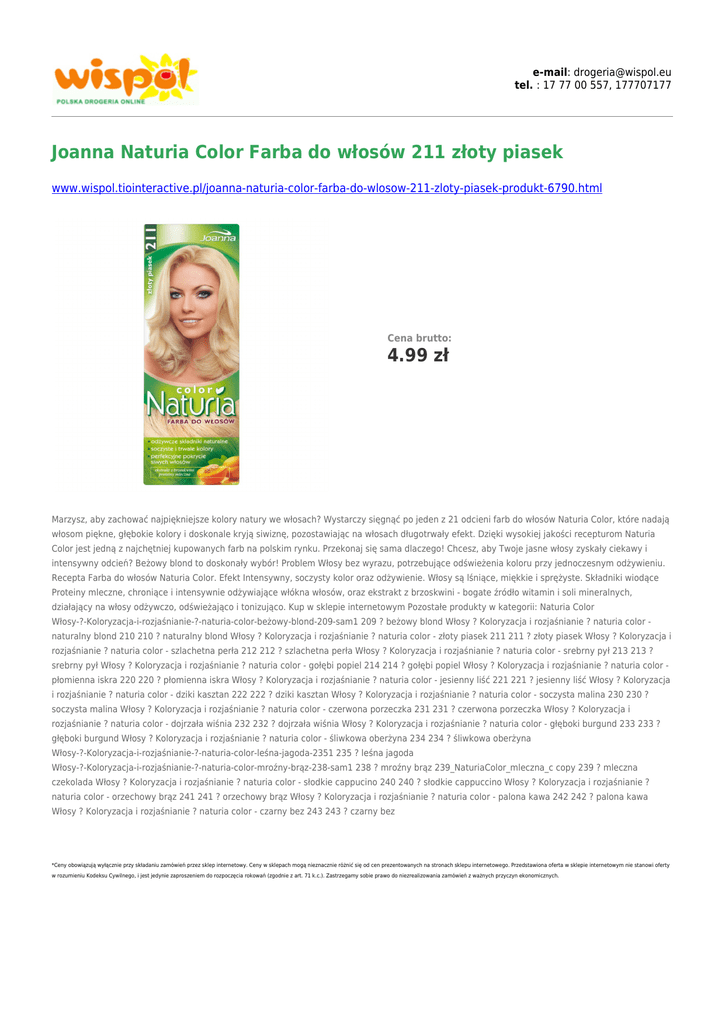 Joanna Naturia Color Farba do włosów 211 złoty piasek