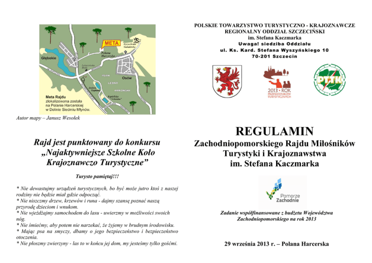 POLSKIE TOWARZYSTWO TURYSTYCZNO - KRAJOZNAWCZE REGIONALNY ODDZIAŁ SZCZECIŃSKI im. Stefana Kaczmarka U w a g a! si e d zi b a O d d zi ał u ul. Ks . K ar d. St e f a n a Wys zy ń s ki e g o 1 0 7 0- 2 0 1 Sz c z e ci n Autor mapy – Janusz Wesołek REGULAMIN Rajd jest punktowany do konkursu „Najaktywniejsze Szkolne Koło Krajoznawczo Turystyczne” Zachodniopomorskiego Rajdu Miłośników Turystyki i Krajoznawstwa im. Stefana Kaczmarka Turysto pamiętaj!!! * Nie dewastujmy urządzeń turystycznych, bo być może jutro ktoś z naszej rodziny nie będzie miał gdzie odpocząć. * Nie niszczmy drzew, krzewów i runa - dajmy szansę poznać naszą przyrodę dzieciom i wnukom. * Nie wjeżdżajmy samochodem do lasu - uwierzmy w możliwości swoich nóg. * Nie śmiećmy, aby potem nie narzekać, że żyjemy w brudnym środowisku. * Mając psa na smyczy, dbamy o jego bezpieczeństwo i bezpieczeństwo otoczenia. * Nie płoszmy zwierzyny - las to w końcu jej dom, my jesteśmy tylko gośćmi. Zadanie współfinansowane z budżetu Województwa Zachodniopomorskiego na rok 2013 29 września 2013 r. – Polana Harcerska Dlaczego zlot imienia Stefana Kaczmarka? Stefan Kaczmarek urodził się 4 grudnia 1907 r. w miejscowości Siependorf koło Lipska. Wychował się w Wielkopolsce i tam skończył szkołę podstawową, średnią, a następnie studia medyczne na Uniwersytecie Poznańskim. Jeszcze w okresie międzywojennym podczas wędrówek pieszych poznał całą Polskę. W czasie okupacji był żołnierzem Polski Podziemnej, a po wojnie osiadł, na Pomorzu Zachodnim. Około 20 lat pracował społecznie w dziedzinie turystyki, głównie kolarskiej. Założył turystyczny Klub Kolarski „88” i przez wiele lat był jego prezesem. Członkowie klubu obliczyli, że poprowadził ok. 500 wycieczek rowerowych, w których wzięło udział około 10 000 osób. Niewiele było na Pomorzu Zachodnim dróg, których nie przemierzyłyby zespoły kolarskie pod przewodnictwem popularnego „Taty” (tak, bowiem powszechnie nazywano Stefana Kaczmarka). Zasłużony działacz nie tylko prowadził wycieczki po coraz to nowych trasach i szlakach, ale równocześnie uczył młodzież zasad biwakowania i rozbijania obozowisk, zasad ochrony przyrody i jej ukochania, zapoznawał z zabytkami architektury, z historią - regionu itp. Stefan Kaczmarek był także czynnym instruktorem turystyki kolarskiej, instruktorem krajoznawstwa, strażnikiem ochrony przyrody itp. Brał czynny udział w organizowaniu wielu największych polskich imprez turystycznych, w tym Centralnego Zlotu Turystów Kolarzy, który odbył się w Moryniu w 1967 r. oraz Ogólnopolskiego Zlotu Przodowników Turystyki Kolarskiej, w okolicach Szczecina i Stargardu w 1971 r. Nie ograniczał się do jednej formy turystyki, chętnie organizował wycieczki piesze i przez kilka lat prezesował Szczecińskiemu Klubowi Turystyki Pieszej „Wiercipięty”. Był członkiem Zarządu Okręgu w Szczecinie, w którym pełnił funkcję skarbnika, członkiem Zarządu Oddziału Szczecińskiego PTTK, a także przez wiele lat członkiem plenum Komisji Turystyki Kolarskiej ZG PTTK w Warszawie. Posiadał liczne odznaczenia państwowe, regionalne i turystyczne. Dwukrotnie został odznaczony Srebrnym Krzyżem Zasługi, posiadał regionalną odznakę „Gryf Pomorski”, nadawaną przez Wojewódzką Radę Narodową za zasługi dla województwa szczecińskiego. Władze PTTK przyznały mu Złotą Odznakę PTTK, a GKKFiT wyróżnił nadaniem Złotej Odznaki Zasłużonego Działacza Turystyki. Był, więc Stefan Kaczmarek znany zarówno na obszarze regionu, jak i wśród działaczy turystycznych i krajoznawczych całego kraju. Zmarł 11 czerwca 1974 r. Został pochowany na Cmentarzu Centralnym w Szczecinie obok swego syna, alpinisty, Bolesława, który w grudniu 1968 r. zginął w Tatrach. Trasy kolarskie Trasa nr 1 Start, godz. 900 – jezioro Głębokie – Pilchowo – Tanowo – Tatynia - Trzeszczyn – Police Siedlice –Leśno Górne – szlak niebieski - meta. Prowadzenie: STKKol. „88” trasa ok. 35 km + powrót Trasa nr 2 Start, godz. 1000 - Plac Lotników – Bezrzecze - Wołczkowo - Dobra - Grzepnica – Bartoszewo – Pilchowo – meta. Prowadzenie: SKTKol. „Neptun” trasa ok. 25 km. + powrót Trasa nr 3 Trasa dowolna według regulaminu KOT Opracowanie: Regionalna Komisja Turystyki Kolarskiej przy PTTK ROS Uwaga! Młodzież do lat 18 obowiązuje posiadanie karty rowerowej oraz obowiązek uczestnictwa z opiekunem (osoba dorosła). Pozostałe uregulowania: 1. Osoby niepełnoletnie i niepełnosprawne mogą brać udział w rajdzie tylko pod opieką dorosłych lub opiekunów. 2. Po wyczerpaniu limitu na daną trasę lub w innych uzasadnionych przypadkach, organizatorzy mogą przesunąć uczestników na inną trasę. 3. W przypadku nie stawienia się uczestników na metę lub nieprzestrzegania obowiązków wymienionych w powyższych regulaminach, nie będą przysługiwać im świadczenia rajdowe. 4. Ostateczna interpretacja regulaminu należy do Komitetu Organizacyjnego. www.ros.pttk.pl Trasy piesze 1. Trasa puszczańska /ok. l0 km/ – prowadzący Waldemar Hejza Mścięcino - szlak czerwony - Komarzy Młyn - d. Leśniczówka Oleńka – Grzybnica - Dąb Bogusława X - szlak niebieski - Most Meyera-Pod Urwiskiem – szlak zielony – meta. Zbiórka – przystanek ZDiTM Police Palmowa godz. 900 2. Trasa wodno-leśna /ok. 10 km/ - prowadzący Janusz Wesołek Głębokie /pętla/ - bez szlaku przy jez. Głębokie – Dęby Brytyjczycy – szlak czerwony – leśniczówka Owczary – szlak czarny – Pilchowo – Jasmundzka Struga – szlak żółty - szlak niebieski – Dolina Siedmiu Młynów – meta. Zbiórka – pętla ZDiMT Głębokie godz. 900 3. Trasa pagórkowa /ok. 6 km/ - prowadzący Mirosław Dudziński Las Arkoński /pętla/ - szlak czerwony – Osów /ul. Wiśniowa/ - szlak czarnymeta. Zbiórka – pętla ZDiMT Las Arkoński godz. 900 4. Trasa wokół jeziora /ok. 7