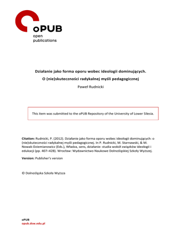 Działaniejakoformaoporuwobecideologiidominujących. O(nie)skutecznościradykalnejmyślipedagogicznej PawełRudnicki ThisitemwassubmittedtotheoPUBRepositoryoftheUniversityofLowerSilesia. Citation:Rudnicki,P.(2012).Działaniejakoformaoporuwobecideologiidominujących:o (nie)skutecznościradykalnejmyślipedagogicznej.InP.Rudnicki,M.Starnawski,&M. Nowak-Dziemianowicz(Eds.),Władza,sens,działanie:studiawokółzwiązkówideologiii edukacji(pp.407–428).Wrocław:WydawnictwoNaukoweDolnośląskiejSzkołyWyższej. Version:Publisher'sversion ©DolnośląskaSzkołaWyższa oPUB opub.dsw.edu.pl P R DOLNOŚLĄSKA SZKOŁA WYŻSZA Działanie jako forma oporu wobec ideologii dominujących. O (nie)skuteczności radykalnej myśli pedagogicznej Siła ideologii dominujących opiera się na wielu elementach, jednym z bardziej istotnych jest wytworzenie przekonania, że ewentualne alternatywy są mało realne, wręcz nieprawdopodobne. Utrwalenie tej perspektywy odbywa się na różnych polach. Jednym z ważniejszych jest system edukacyjny ze sposobem jego organizacji, zarządzania, pożądanymi i odgrywanymi rolami oraz programami nauczania (i wieloma innymi elementami). Edukacyjne konteksty utrwalania dominacji władzy opisywane są przez badaczy i badaczki edukacji z różnych perspektyw. W najszerszych dotyczą relacji systemowej i tego, w jaki sposób władza sprawuje kontrolę nad edukacją i poprzez edukację1. Bardziej szczegółowe opisy prezentują jak władza wykorzystuje wszelkie dostępne środki, aby sformatować jednostki wedle oczekiwanego klucza lub je zmarginalizować, jeśli pojawiają się problemy z ich dostosowaniem2. System oświatowy w każdych warunkach działa na rzecz władzy, która go tworzy, utrzymuje, zmienia wedle swoich potrzeb. I mimo, że w licznych dyskusjach o polityce, ideologii, systemie edukacja jest często pomijana, żadna władza nie odważy się na jej uwolnienie. Nie dziwi zatem, jaki sprzeciw władz (także w Polsce) budzą działania, których celem jest odzyskanie edukacji przez tych, których (w teorii) ona najbardziej interesuje – osoby uczące się. Mam tu na myśli nie tylko obec1 Zob. np. E. Potulicka, J. Rutkowiak, Neoliberalne uwikłania edukacji, Impuls, Kraków 2012; P. Freire, The Pedagogy Of The Oppressed, transl. M. Bergman Ramos, Continuum, New York–London 2005; M. C. Nussbaum, Kształcenie dla zysku, kształcenie dla wolności, [w:] B. D. Gołębniak (red.), Pytanie o szkołę wyższą. W trosce o człowieczeństwo, tłum. A. Męczkowska, Wydawnictwo Naukowe DSW, Wrocław 2008; H. A. Giroux, Naga pedagogia i przekleństwo neoliberalizmu: przemyśleć edukację wyższą jako praktykę wolności, [w:] H. A. Giroux, L. Witkowski, Edukacja i sfera publiczna. Idee i doświadczenia pedagogiki radykalnej, Impuls, Kraków 2010; T. Gmerek. Edukacja i nierówności społeczne. Studium porównawcze na przykładzie Anglii, Hiszpanii i Rosji, Impuls, Kraków 2011; J. Sowa, K. Szadkowski (red.), EduFactory. Samoorganizacjia i opór w fabrykach wiedzy, Korporacja Ha!art, Kraków 2011, e-book, CC-BY-SA. 2 Różne ujęcia w polskiej perspektywie, zob. M. Chomczyńska-Rubacha, Płeć i szkoła. Od edukacji rodzajowej do pedagogiki rodzaju, WN PWN, Warszawa 2011; A. Sadownik, Na rozstajnych drogach. Studium etnopedagogiczne kontrastowych karier szkolnych młodzieży, WN DSW, Wrocław 2011. sens_do_druku.indd 407 2013-03-07 08:13:42 408 P R ne konflikty, które w ostatnich kilkunastu miesiącach eskalują w glokalnej perspektywie (w duże mierze dzięki Internetowi i portalom społecznościowym), ale również działania mniej spektakularne, które podejmowane zwyczajnie, bez rozgłosu również stanowią element kontestacyjnego działania edukacyjnego (myślę tu o aktywności edukacyjnej niektórych organizacji pozarządowych oraz grup nieformalnych). Prezentowany tekst dotyczy marnowania potencjału zmian w sferach społecznej i edukacyjnej. W zasadzie poświęcam go „działaniu” rozumianemu podwójnie – jako aktywność pedagogiczna/edukacyjna i idei, która do tej aktywności wiedzie. Poniżej przedstawiam (skrócone) refleksje dotyczące idei pedagogiki emancypacyjnej Freirego oraz jej przejęcia i rynkowej trywializacji, a postawy Oburzonych, przeciwników ACTA i innych niezadowolonych, którzy w podejmowanym przez siebie działaniu wobec władz dostrzegają możliwość podważenia reguł, które postrzegają jako opresyjne. Działanie realizowane w „analogowych czasach” Freirego miało ograniczony do swojej lokalności zakres, co w efekcie nie dało możliwości skutecznej zmiany (z wielu różnych powodów). W „epoce cyfrowej” działanie nabiera nowego wymiaru. Social media doskonale informują, angażują oraz podkręcają temperaturę. Nowe wymiary działania, nim staną się czymś masowym w realu, pojawiają się jako e-projekt, który każda osoba z dostępem do sieci może nie tylko poznać, ale i skomentować czy współtworzyć. W obu przypadkach (analogowym i cyfrowym) podjęte działanie miało/ma przynieść skutek w postaci pozytywnej, dla podejmujących owo działanie, zmiany. I o ile w przypadku historycznej już koncepcji Freirego możemy mówić o tym co wyszło, a co nie, o tyle w przypadku internetowych protestów jesteśmy na początku drogi, która wydaje się niezwykle intrygująca w wymiarach możliwości oporu, jaki stwarza, i fascynująca w formach partycypacji, którą umożliwia. Przedstawiane dotąd opisy społeczeństwa i społeczności sieci ciekawiły niczym filmy s-f. Pierwszy raz mamy możliwość sprawdzenia, jak działa to w rzeczywistości. To dla obywateli, badaczy i internautów niezwykle ciekawa sytuacja. Freire, świadomość uciśnionych i wyzysk Południa Działanie edukacyjne podejmowane przez Freirego z dzisiejszej perspektywy wydaje się nierzeczywiste, a nawet nieco banalne. Nierzeczywistość dotyczy prostoty środków, które umożliwiają zmianę i ich skuteczności, banalność zaś pewnego ro