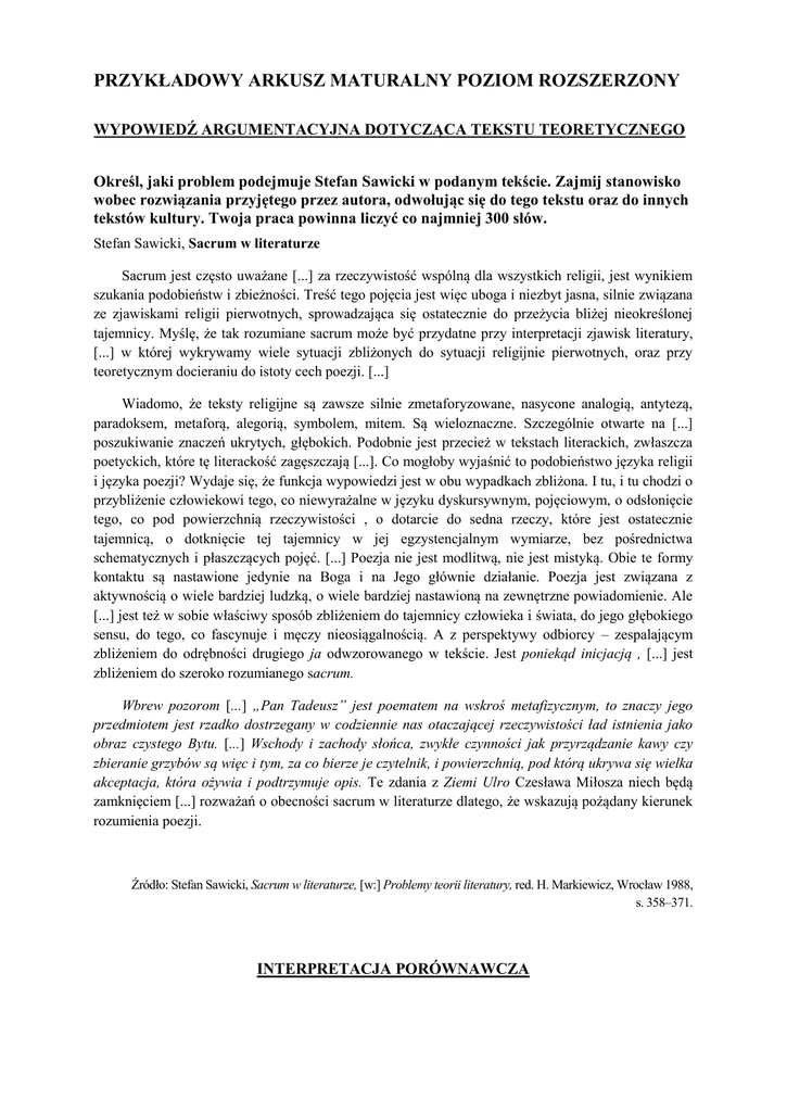 PRZYKŁADOWY ARKUSZ MATURALNY POZIOM ROZSZERZONY WYPOWIEDŹ ARGUMENTACYJNA DOTYCZĄCA TEKSTU TEORETYCZNEGO Określ, jaki problem podejmuje Stefan Sawicki w podanym tekście. Zajmij stanowisko wobec rozwiązania przyjętego przez autora, odwołując się do tego tekstu oraz do innych tekstów kultury. Twoja praca powinna liczyć co najmniej 300 słów. Stefan Sawicki, Sacrum w literaturze Sacrum jest często uważane [...] za rzeczywistość wspólną dla wszystkich religii, jest wynikiem szukania podobieństw i zbieżności. Treść tego pojęcia jest więc uboga i niezbyt jasna, silnie związana ze zjawiskami religii pierwotnych, sprowadzająca się ostatecznie do przeżycia bliżej nieokreślonej tajemnicy. Myślę, że tak rozumiane sacrum może być przydatne przy interpretacji zjawisk literatury, [...] w której wykrywamy wiele sytuacji zbliżonych do sytuacji religijnie pierwotnych, oraz przy teoretycznym docieraniu do istoty cech poezji. [...] Wiadomo, że teksty religijne są zawsze silnie zmetaforyzowane, nasycone analogią, antytezą, paradoksem, metaforą, alegorią, symbolem, mitem. Są wieloznaczne. Szczególnie otwarte na [...] poszukiwanie znaczeń ukrytych, głębokich. Podobnie jest przecież w tekstach literackich, zwłaszcza poetyckich, które tę literackość zagęszczają [...]. Co mogłoby wyjaśnić to podobieństwo języka religii i języka poezji? Wydaje się, że funkcja wypowiedzi jest w obu wypadkach zbliżona. I tu, i tu chodzi o przybliżenie człowiekowi tego, co niewyrażalne w języku dyskursywnym, pojęciowym, o odsłonięcie tego, co pod powierzchnią rzeczywistości , o dotarcie do sedna rzeczy, które jest ostatecznie tajemnicą, o dotknięcie tej tajemnicy w jej egzystencjalnym wymiarze, bez pośrednictwa schematycznych i płaszczących pojęć. [...] Poezja nie jest modlitwą, nie jest mistyką. Obie te formy kontaktu są nastawione jedynie na Boga i na Jego głównie działanie. Poezja jest związana z aktywnością o wiele bardziej ludzką, o wiele bardziej nastawioną na zewnętrzne powiadomienie. Ale [...] jest też w sobie właściwy sposób zbliżeniem do tajemnicy człowieka i świata, do jego głębokiego sensu, do tego, co fascynuje i męczy nieosiągalnością. A z perspektywy odbiorcy – zespalającym zbliżeniem do odrębności drugiego ja odwzorowanego w tekście. Jest poniekąd inicjacją , [...] jest zbliżeniem do szeroko rozumianego sacrum. Wbrew pozorom [...] „Pan Tadeusz” jest poematem na wskroś metafizycznym, to znaczy jego przedmiotem jest rzadko dostrzegany w codziennie nas otaczającej rzeczywistości ład istnienia jako obraz czystego Bytu. [...] Wschody i zachody słońca, zwykłe czynności jak przyrządzanie kawy czy zbieranie grzybów są więc i tym, za co bierze je czytelnik, i powierzchnią, pod którą ukrywa się wielka akceptacja, która ożywia i podtrzymuje opis. Te zdania z Ziemi Ulro Czesława Miłosza niech będą zamknięciem [...] rozważań o obecności sacrum w literaturze dlatego, że wskazują pożądany kierunek rozumienia poezji. Źródło: Stefan Sawicki, Sacrum w literaturze, [w:] Problemy teorii literatury, red. H. Markiewicz, Wrocław 1988, s. 358–371. INTERPRETACJA PORÓWNAWCZA Dokonaj interpretacji porównawczej podanych tekstów. Twoja praca powinna liczyć co najmniej 300 słów. Sofokles, Antygona Antygona to bohaterka tragedii Sofoklesa. Skazana na śmierć za pochowanie (wbrew zakazowi króla Teb, Kreona) brata Polinejkesa, uznanego przez władcę za zdrajcę ojczyzny. Poniższy fragment to monolog bohaterki przed śmiercią. Kreon kazał ją zamurować żywcem w grobowcu. Gdy się tak stało, Antygona odebrała sobie życie. ANTYGONA Grobie, ty mojej łożnico miłości, Mieszkanie wieczne, ciemnico sklepiona! Idę do moich, których tylu gości W pozgonnych domach boska Persefona. Za wami idę ja, co w życia wiośnie Zginęłam, prawie nie zaznawszy świata. A tuszę, że mnie tam przyjmą radośnie, Ty, ojcze, matko, i miła dłoń brata: Bom tu z miłosną służbą wasze ciała Własną obmyła, namaściła ręką; Żem bratnie zwłoki uczciwie grzebała, Taką mnie darzą podzięką! Mam u szlachetnych ludzi cześć i chwałę, Lecz potępienie ze strony Kreona, Bo on me czyny uznał za zuchwałe. Ręką więc teraz jego uwięziona, Ani zaznawszy słodyczy wesela, Ni uczuć matki, ni dziatek pieszczoty, Schodzę tak sama i bez przyjaciela, Nieszczęsna, żywa do grobowej groty. Jakież to bogów złamałam ustawy? Jakże do bogów podnosić mam modły, Wołać o pomoc, jeżeli czyn prawy, Który spełniłam, uznano za podły? Lecz jeśli z bogów to zrządzenia płynie, Trzeba mi winnej znieść w ciszy cierpienia. Jeśli ci błądzą, niech sięgnie ich w winie Kaźń równa z bogów ramienia! Źródło: Sofokles, Antygona, tłum. Kazimierz Morawski, Wrocław 1984, s. 43–44. Juliusz Słowacki, Kordian Kordian to bohater dramatu Juliusza Słowackiego. Został skazany na śmierć za próbę zamachu na cara Mikołaja I, ówczesnego króla Polski koronowanego w 1828 roku. Poniższy fragment to monolog bohatera przed egzekucją. Rozstrzelanie wyznaczono na Placu Saskim w Warszawie. Ze względu na otwarte zakończenie dramatu, nie wiadomo, czy wyrok został wykonany. KORDIAN Spłyńcie się teraz w jednej myślne chmurze Wszystkie sny marzeń latające błędnie! I bądźcie ze mną! Niebo ty mi zapal Słońce i księżyc, i gwiazdy, bo konam! Bo tam przed ludźmi, choćby wbity na pal, Zamknę cierpienia i bole pokonam; Lecz tu łez moich duma nie zatrzyma... O! gdybym wiedział, że tak bez powrotu Ziemię żegnałem; przed chwilą odlotu Patrzałbym na świat innymi oczyma, Dłużej! ciekawiej, a może ze łzami... Bo tam pomiędzy ogrodu kwiatami Jest pewnie piękny kwiat... a ja go nie znam!... […] Ludzi znać nie chcę, lecz niech się obeznam Z ziemią, piastunką ludzi!... O! ty ziemio! Byłażeś dla mnie piastunką troskliwą? Po chwili ze wzgardą Niech się rojami p