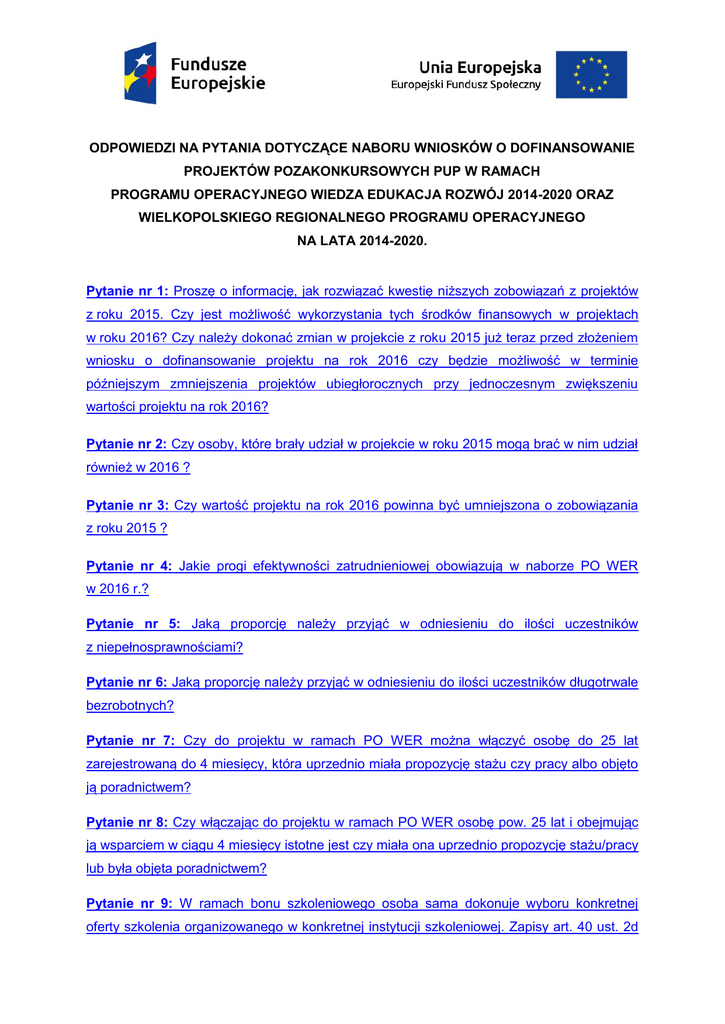 ODPOWIEDZI NA PYTANIA DOTYCZĄCE NABORU WNIOSKÓW O DOFINANSOWANIE PROJEKTÓW POZAKONKURSOWYCH PUP W RAMACH PROGRAMU OPERACYJNEGO WIEDZA EDUKACJA ROZWÓJ 2014-2020 ORAZ WIELKOPOLSKIEGO REGIONALNEGO PROGRAMU OPERACYJNEGO NA LATA 2014-2020. Pytanie nr 1: Proszę o informację, jak rozwiązać kwestię niższych zobowiązań z projektów z roku 2015. Czy jest możliwość wykorzystania tych środków finansowych w projektach w roku 2016? Czy należy dokonać zmian w projekcie z roku 2015 już teraz przed złożeniem wniosku o dofinansowanie projektu na rok 2016 czy będzie możliwość w terminie późniejszym zmniejszenia projektów ubiegłorocznych przy jednoczesnym zwiększeniu wartości projektu na rok 2016? Pytanie nr 2: Czy osoby, które brały udział w projekcie w roku 2015 mogą brać w nim udział również w 2016 ? Pytanie nr 3: Czy wartość projektu na rok 2016 powinna być umniejszona o zobowiązania z roku 2015 ? Pytanie nr 4: Jakie progi efektywności zatrudnieniowej obowiązują w naborze PO WER w 2016 r.? Pytanie nr 5: Jaką proporcję należy przyjąć w odniesieniu do ilości uczestników z niepełnosprawnościami? Pytanie nr 6: Jaką proporcję należy przyjąć w odniesieniu do ilości uczestników długotrwale bezrobotnych? Pytanie nr 7: Czy do projektu w ramach PO WER można włączyć osobę do 25 lat zarejestrowaną do 4 miesięcy, która uprzednio miała propozycję stażu czy pracy albo objęto ją poradnictwem? Pytanie nr 8: Czy włączając do projektu w ramach PO WER osobę pow. 25 lat i obejmując ją wsparciem w ciągu 4 miesięcy istotne jest czy miała ona uprzednio propozycję stażu/pracy lub była objęta poradnictwem? Pytanie nr 9: W ramach bonu szkoleniowego osoba sama dokonuje wyboru konkretnej oferty szkolenia organizowanego w konkretnej instytucji szkoleniowej. Zapisy art. 40 ust. 2d ustawy o promocji zatrudnienia nie mają tutaj zastosowania. Czy można rozumieć, iż mimo zapisu w Wytycznych w zakresie kwalifikowalności, iż jesteśmy zobowiązani do przeprowadzenia rozeznania i upubliczniana zapytań ofertowych bony szkoleniowe realizowane w ramach PO WER są realizowane na tych samych zasadach. Pytanie nr 10: Czy osoba, która uczestniczyła w programach w ramach PO KL lub SPO RZL może być uczestnikiem PO WER lub WRPO? Pytanie nr 11: Czy osoba, która została zakwalifikowana do projektu przed skierowaniem np. na staż powinna mieć wydane skierowanie do pracy czy wystarczy propozycja? Pytanie nr 12: Jaki dzień należy uznać za dzień rozpoczęcia udziału w projekcie? Pytanie nr 13: Czy do projektu można kwalifikować osoby z I profilem pomocy, na które nie został poniesiony żaden wydatek? Pytanie nr 14: Czy we wniosku o dofinansowanie w ramach PO WER należy wskazać wartość docelową wskaźnika „Liczba osób poniżej 30 lat, które uzyskały kwalifikacje po opuszczeniu programu”? Pytanie nr 15: Czy jeśli w ramach projektu zaplanuje się realizację jedynie trzech form wsparcia, np. staży, szkoleń, jednorazowych środków na podjęcie działalności gospodarczej, to wniosek zostanie skierowany do poprawy? Pytanie nr 16: Czy pierwszym elementem kompleksowego wsparcia jest IPD? I czy należy je wykazywać jako oddzielne zadanie? Pytanie nr 17: Czy w ramach PO WER do zadania wystarczy przyporządkować jeden wskaźnik realizacji celu czy musi być przyporządkowanych więcej wskaźników? Pytanie nr 18: Czy w ramach PO WER wielkość wskaźnika rezultatu „Liczba osób poniżej 30 lat, które uzyskały kwalifikacje po opuszczeniu programu” musi być równa liczbie osób uczestniczących w szkoleniu? Pytanie nr 19: W instrukcji wypełniania wniosku (dot. PO WER) jest że PUP nie wypełnia opisu zadań, w której części wniosku należy zaznaczyć, że efektem szkoleń będzie uzyskanie kwalifikacji lub nabycie kompetencji? Pytanie nr 20: Czy musimy pod szczegółowym budżetem opisywać metodologię wyliczania wartości pomocy publicznej? Ponieważ w instrukcji wypełniani wniosku jest zaznaczone że PUP nie ma obowiązku wypełniania, a nie jednoznacznie że nie dotyczy? Pytanie nr 21: Czy w pkt. 1.8 wystarczy wpisać dany powiat czy muszą być wymienione wszystkie gminy z powiatu? Pytanie nr 22: Czy we wniosku opisujemy promocję, czy też nie musi byś opisana? Pytanie nr 23: Czy w ramach PO WER oprócz oświadczenia o dysponowaniu potencjałem administracyjnym, finansowym i operacyjnym należy załączyć inne załączniki do wniosku? Pytanie nr 24: Jak monitorować efektywność? Czy liczy się samo podjęcie zatrudnienia w okresie do 3 miesięcy od daty zakończenia, czy fakt nieprzerwanej min. 3-miesięcznej pracy (weryfikacja tego wykracza poza w/w 3 miesiące)? Pytanie nr 25: Jak długo należy przechowywać całą dokumentację związaną z projektem? Pytanie nr 26: Czy potwierdzeniem kwalifikacji zdobytych podczas szkoleń w ramach WRPO muszą być egzaminy zewnętrzne, realizowane przez instytucje zewnętrzne, czy mogą to być egzaminy wewnętrzne przeprowadzone przez realizatora szkolenia np. w formie pisemnej, ustnej, czy formie praktycznego sprawdzenia umiejętności potwierdzone opinią, notatką itp.? Pytanie nr 27: Czy wartość bazowa wskaźników rezultatu musi być określona, czy wystarczy wpisać 0? Pytanie nr 28: Czy oprócz wskaźników rezultatu i produktu wymienionych w szablonie wniosku trzeba określić inne wskaźniki? Pytanie nr 29: Czy w tabelach dotyczących wskaźników wypełniamy pole „Źródło danych” bo w instrukcji na str. 22 jest, że należy wpisać „nie dotyczy” a w kolejnym zdaniu że „Opisując sposób pomiaru wskaźnika w kolumnie „Źródło danych” należy zawrzeć informacje dot. częstotliwości pomiaru” na str. 25 też jest informacja, że należy to pole wypełnić. Pytanie nr 30: Rozumiemy, że w przypadku prac interwencyjnych Uczestnikami Projektu są osoby zatrudnione w ramach tych prac a nie pracodawcy, którzy je zatrudniają. Czy w opisie grupy docelo
