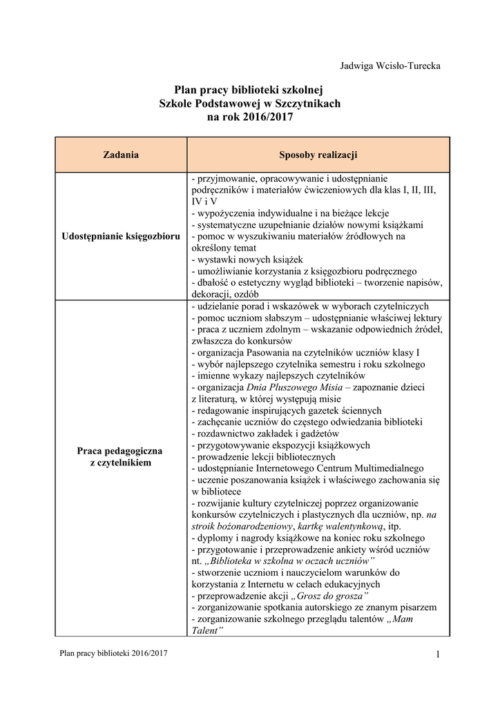 Jadwiga Wcisło-Turecka Plan pracy biblioteki szkolnej Szkole Podstawowej w Szczytnikach na rok 2016/2017 Zadania Udostępnianie księgozbioru Praca pedagogiczna z czytelnikiem Plan pracy biblioteki 2016/2017 Sposoby realizacji - przyjmowanie, opracowywanie i udostępnianie podręczników i materiałów ćwiczeniowych dla klas I, II, III, IV i V - wypożyczenia indywidualne i na bieżące lekcje - systematyczne uzupełnianie działów nowymi książkami - pomoc w wyszukiwaniu materiałów źródłowych na określony temat - wystawki nowych książek - umożliwianie korzystania z księgozbioru podręcznego - dbałość o estetyczny wygląd biblioteki – tworzenie napisów, dekoracji, ozdób - udzielanie porad i wskazówek w wyborach czytelniczych - pomoc uczniom słabszym – udostępnianie właściwej lektury - praca z uczniem zdolnym – wskazanie odpowiednich źródeł, zwłaszcza do konkursów - organizacja Pasowania na czytelników uczniów klasy I - wybór najlepszego czytelnika semestru i roku szkolnego - imienne wykazy najlepszych czytelników - organizacja Dnia Pluszowego Misia – zapoznanie dzieci z literaturą, w której występują misie - redagowanie inspirujących gazetek ściennych - zachęcanie uczniów do częstego odwiedzania biblioteki - rozdawnictwo zakładek i gadżetów - przygotowywanie ekspozycji książkowych - prowadzenie lekcji bibliotecznych - udostępnianie Internetowego Centrum Multimedialnego - uczenie poszanowania książek i właściwego zachowania się w bibliotece - rozwijanie kultury czytelniczej poprzez organizowanie konkursów czytelniczych i plastycznych dla uczniów, np. na stroik bożonarodzeniowy, kartkę walentynkową, itp. - dyplomy i nagrody książkowe na koniec roku szkolnego - przygotowanie i przeprowadzenie ankiety wśród uczniów nt. „Biblioteka w szkolna w oczach uczniów” - stworzenie uczniom i nauczycielom warunków do korzystania z Internetu w celach edukacyjnych - przeprowadzenie akcji „Grosz do grosza” - zorganizowanie spotkania autorskiego ze znanym pisarzem - zorganizowanie szkolnego przeglądu talentów „Mam Talent” 1 - uzupełnianie księgozbioru zgodnie z dezyderatami uczniów i potrzebami nauczycieli - zakupy nowych lektur – zgodnych z nową podstawą programową - wprowadzenie do inwentarza książek nabytych, pozyskanych darów oraz podręczników z dotacji i materiałów ćwiczeniowych Gromadzenie i konserwacja - wprowadzanie do Inwentarza nabytków – opieczętowanie, zbiorów nadanie numeru, uzupełnienie kart książek - prowadzenie księgi inwentarzowej na otrzymane darmowe podręczniki oraz rejestru materiałów ćwiczeniowych - bieżące porządkowanie księgozbioru i czasopism - bieżąca selekcja księgozbioru – odpisywanie ubytków - uaktualnienie napisów informacyjnych, plansz, plakatów - badanie potrzeb czytelniczych i zaspokajanie ich w miarę możliwości finansowych - systematyczne uzupełnianie Dziennika biblioteki szkolnej - aktualizacja kartoteki czytelników, założenie kart uczniom klasy I - stworzenie Planu Pracy Biblioteki Prowadzenie dokumentacji - sprawozdanie semestralne i roczne z pracy biblioteki - prowadzenie dokumentacji zakupu i selekcji księgozbioru - uaktualnianie napisów informacyjnych - kontrola zwrotów wypożyczonych książek - prowadzenie Kroniki szkoły - informowanie wychowawców o stanie czytelnictwa w poszczególnych klasach - przygotowywanie i zdobywanie literatury na konkursy przedmiotowe Współpraca z Gronem - pomoc przy zamawianiu nagród książkowych dla uczniów Pedagogicznym otrzymujących świadectwa z wyróżnieniem - pomoc w realizowaniu lekcji przedmiotowych w bibliotece (w zależności od potrzeb nauczycieli) - gromadzenie scenariuszy imprez - udział w kursach, warsztatach i Targach Książki - zapoznawanie się z literaturą fachową i czasopismami metodycznymi („Biblioteka w Szkole”) - korzystanie z fachowych stron WWW dotyczących specyfiki Podnoszenie kwalifikacji zawodu bibliotekarza - przygotowywanie własnych pomocy dydaktycznych - przygotowywanie dyplomów okolicznościowych - znajomość rynku księgarskiego i śledzenie nowości wydawniczych - koordynowanie akcji zbiórki plastikowych nakrętek Współpraca ze - zbiórka makulatury i zużytych baterii środowiskiem pozaszkolnym - organizacja kiermaszu bożonarodzeniowego i wielkanocnego - zorganizowanie warsztatów plastycznych - współpraca z innymi bibliotekami szkolnymi i Gminną Biblioteką Publiczną Plan pracy biblioteki 2016/2017 2 - umieszczanie na stronie internetowej szkoły aktualnych informacji dotyczących biblioteki - współpraca z Radą Rodziców: organizowanie imprez szkolnych - udział w akcjach: Pomóż i Ty, Akademia Czystych Rąk, Szlachetna Paczka - współpraca z hurtowniami księgarskimi - ustalenie z księgowością salda finansowego księgozbioru Podpis Dyrektora szkoły Podpis nauczyciela bibliotekarza .................................................. .................................................. Plan pracy biblioteki 2016/2017 3