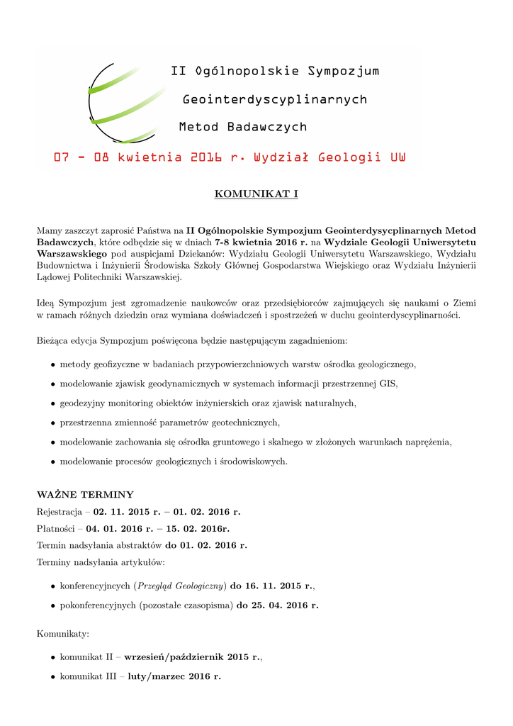 komunikat i - II Ogólnopolskie Sympozjum Geointerdyscyplinarnych