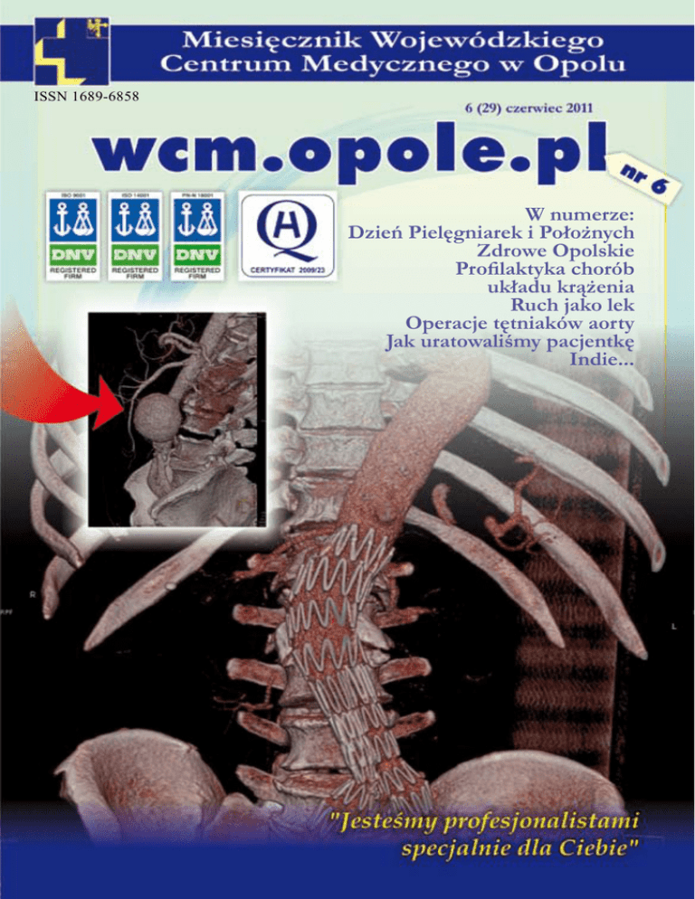 ISSN 1689-6858 W numerze: Dzień Pielęgniarek i Położnych Zdrowe Opolskie Profilaktyka chorób układu krążenia Ruch jako lek Operacje tętniaków aorty Jak uratowaliśmy pacjentkę Indie... wcm.opole.pl - czerwiec 2011 Dzień Pielęgniarek i Położnych w naszym Szpitalu mgr Maria Grzeczna Z okazji Międzynarodowego Dnia Pielęgniarek i Dnia Położnych w naszym Szpitalu odbyło się uroczyste spotkanie środowiska pielęgniarek i położnych. Podczas spotkania został wygłoszony wykład na temat „Symboliki zawodu” przez Magdalenę Szwarcbach pielęgniarkę z Oddziału Chirurgii Ogólnej i Naczyniowej oraz brązową medalistkę Konkursu Pielęgniarka Roku 2009. Nasz kolega dr n. humanistycznych Teodor Królikowski podzielił się także swoją poezją. W tym wyjątkowym dla nas Dniu zostały wręczone przez dyrektora Marka Piskozuba, z-cę ds. lecznictwa Andrzeja Kucharskiego oraz naczelną pielęgniarkę, wyróżnienia i nagrody w postaci zegarów pielęgniarskich dla 65 pielęgniarek, położnych i pielęgniarzy z: Oddziału Ratunkowego: Małgorzacie Szmer, Małgorzacie Lalik, Małgorzacie Topolnickiej, Wioletcie Boduch, Grzegorzowi Kuręda, Annie Gatnikiewicz, Grzegorzowi Janik, Jarosławowi Bartnik i Jackowi Stanisławskiemu; Oddziału Laryngologii: Dorocie Sordoń, Małgorzacie Czempora, Renacie Cichoń i Krystynie Grzeszczyk; Oddziału Chorób Wewnętrznych, Gastroenterologii, Diabetologii i Endokrynologii: Annie Żyła i Jolancie Passoń; Oddziału Kardiochirurgii: Annie Kozak; Oddziału Pediatrii: Krystynie Gębuś i Dobrosławie Morzeńskiej; Oddziału Intensywnej Terapii dla Dzieci: Aldonie Hyży, Małgorzacie Kłodnickiej i Joannie Śmiarowskiej; Oddziału Chirurgii dziecięcej: Iwonie Pawełczyk, Oddziału Anestezjologii i Intensywnej Terapii: Renacie Ślimak i Kamili Zebzda; Centralnej Sterylizatornii: Grażynie Zapała i Małgorzacie Lisoń; Oddziału Chirurgii Urazowo – Ortopedycznej: Joannie Czarneckiej i Aleksandrze Czajkowskiej, Oddziału Neurochirurgii: Jadwidze Konik, Alicji Jagiełło, Barbarze Ciolek i Iwonie Zych; Stacji Dializ: Urszuli Horvat i Izabeli Strzeleckiej; Oddziału Nefrologii: Wiesławie Świerc; Oddziału Chirurgii Szczękowo - Twarzowej: Barbarze Kozłowskiej; Wojewódzkiej Przychodni Alergologicznej: Jolancie Tromsa; Bloku operacyjnego: Ewie Maszczyk, Agnieszce Pielot, Wojtkowi Kędzierskiemu, Jadwidze Pisaneckiej, Bernadecie Reiman i Violetcie Szopa; Oddziału Kardiologii: Iwonie Stefanów; Oddziału Okulistyki: Halinie Gondro i Iwonie Babczyszyn; Oddziału Urologii: Małgorzacie Chmielewskiej, Alicji Złotej i Bartoszowi Kotwie; Oddziału Chirurgii Ogólnej i Naczyniowej: Magdalenie Szawrcbach i Annie Kozłowskiej; Pracowni Badań Hemodynamicznych: Małgorzacie Demkowicz; Zakładu Diagnostyki Obrazowej: Stanisławie Jarockiej. Pielęgniarce Epidemiologicznej: Katarzynie Sołtys – Bolibrzuch. Komisji ds. satysfakcji pacjentów: Annie Fedorów, Adrianie Mazurkiewicz – Fornalik i Dorocie Wockiej; Komisji ds. odleżyn: Wiesławie Grabskiej, Urszuli Kraszkiewicz, Ewie Urbańczyk i Dorocie Szymańskiej; Komisji ds. norm zatrudnienia: Dorocie Babiak, Zofii Lewandowskiej, Iwonie Przepiórka-Pelc i Dorocie Bojarskiej. Na ręce pielęgniarek oddziałowych dla wszystkich pielęgniarek i położnych oraz współpracujących z nami ratowników, techników, opiekunek z okazji naszego Święta zostały złożone życzenia i wręczone piękne róże oraz słodkości. Międzynarodowy Dzień Pielęgniarek był też uroczystym dniem dla nowych członków Koła Polskiego Towarzystwa Pielęgniarskiego działającego przy WCM, którzy odebrali z rąk przewodniczącej Doroty Wockiej i z-cy Krystyny Gębuś swoje nominacje. Pielęgniarkom i położnym oraz wszystkim współpracującym z nami pracownikom życzymy sukcesów zawodowych w codziennej pracy i życiu osobistym. wcm.opole.pl - czerwiec 2011 „Zdrowe Opolskie” Marszałek Województwa Opolskiego wraz Prezydentem Opola oraz Wojewodą Opolskim zapraszają wszystkich opolan do udziału w imprezie promującej zdrowie, która w tym roku odbędzie się pod hasłem „Zdrowe Opolskie”. Wspólnie z Wojewódzkim Towarzystwem Walki z Kalectwem w Opolu, Opolskim Oddziałem Polskiego Towarzystwa Kardiologicznego, Opolskim Oddziałem Wojewódzkim NFZ, Państwową Wyższą Szkołą Zawodową w Opolu, Politechniką Opolską, Wojewódzką Stacją Sanitarno-Epidemiologiczną w Opolu zapraszamy wszystkich do udziału w plenerowym spotkaniu, którego celem jest promowanie zdrowego stylu życia, w tym między innymi przeprowadzenie marszu po zdrowie. „Zdrowe Opolskie” - to próba zainspirowania, a także podsumowania organizowanych w całym województwie licznych imprez rekreacyjnych, których celem jest wykazanie naszej opolskiej dbałości o zdrowie. W tym roku poprzez stworzenie mechanizmów konkurencji pomiędzy powiatami, liczymy na udział mieszkańców całego regionu. Każdy z opolan, który pojawi się tego dnia na wyspie Bolko w godzinach trwania imprezy i weźmie udział w marszu, niezależnie od uzyskanego wyniku, otrzyma poza certyfikatem uczestnictwa także wiele atrakcyjnych upominków. Mamy niepowtarzalną szansę na zamanifestowanie naszej wysokiej świadomości, iż zdrowe odżywienie, regularny wysiłek fizyczny, to podstawowe elementy, które mogą zmniejszyć ryzyko zachorowania na choroby serca, naczyń mózgowych a także na choroby nowotworowe. Zależy nam przecież na tym, aby żyć długo w możliwe najlepszym zdrowiu. Równocześnie wyrażam przekonanie, iż udział w tej imprezie nie będzie tylko jednorazową manifestacją naszej dbałości o zdrowie, gdyż tylko regularna aktywność ruchowa zapewnić może nam oczekiwane skutki zdrowotne. Wicemarszałek Województwa Opolskiego Roman Kolek wcm.opole.pl - czerwiec 2011 Profilaktyka chorób układu krążenia dr n. med. Piotr Feusette - przewodniczący Oddziału Opolskiego Polskiego Towarzystwa Kardiologicznego. Czynniki ryzyka mia