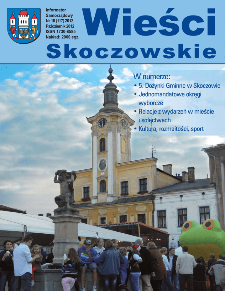 Informator Samorządowy Nr 10 (117) 2012 Październik 2012 ISSN 1730-8585 Nakład: 2000 egz. Wieści Skoczowskie W numerze: • 5. Dożynki Gminne w Skoczowie • Jednomandatowe okręgi wyborcze • Relacje z wydarzeń w mieście i sołectwach • Kultura, rozmaitości, sport fakty 5. Dożynki Gminne RADOSNE świętowanie na rynku 8 września (sobota) rolnicy z gminy Skoczów dziękowali za tegoroczne plony. Najpierw w barwnym korowodzie przejechali ulicami miasta, szczelnie wypełnionymi widzami. Później zaprosili mieszkańców Skoczowa i gości do dożynkowej, radosnej zabawy na rynku. Dożynki gminne w Skoczowie zorganizowano po raz piąty. Dożynkowy korowód wyruszył z placu Stary Targ. Prowadzili go skoczkowie (postacie z herbu miasta) oraz orkiestra dęta. Za nimi dwukonne bryczki. W jednej burmistrz Skoczowa Janina Żagan (w regionalnym stroju cieszyńskim) i z-ca burmistrza Piotr Rucki. Pasażerami drugiej bryczki byli dożynkowi gazdowie: Mariola i Andrzej Macurowie z Kiczyc. Otwarcia 5. Dożynek Gminnych dokonała ze sceny ustawionej przed skoczowskim ratuszem burmistrz Janina Żagan. Strażacy z OSP Pogórze przedstawili problem, który im doskwiera. Za sprawnym wozem bojowym holowali starego, 34. letniego Żuka, na którym był napis: „Jestem zajechany, niezdolny do ratowania!”. Młodzi mieszkańcy Wilamowic koncertowali na traktorowej przyczepie na bębnach w stylu regge. W korowodzie uczestniczyli także uczniowie Zespołu Szkół Rolniczych w Międzyświeciu. Byli w nim także członkowie Skoczowskiego Bractwa Strzeleckiego, ubrani w historyczne stroje z czasów cesarstwa austro-węgierskiego. Na lawecie z armatą, którą jechali, zasiadał w fotelu cesarz Franciszek Józef. Korowód zamykała głośna kawalkada motocyklistów. Po przejechaniu ulicami Mickiewicza, Targową i Ustrońską dożynkowy korowód dotarł na skoczowski rynek, szczelnie wypełniony widzami. Wcześnie do korowodu dołączyły dzieci z przedszkola w Kiczycach, ubrane w regionalne stroje rolników. Chłopcy idąc ulicą pokazywali jak się dawniej ręcznie siało zboże. Na rynku przedstawicieli sołectw jadących w korowodzie, witała burmistrz Skoczowa Janina Żagan, dożynkowi gazdowie Mariola i Andrzej Macurowie oraz zaproszeni goście, m.in. posłowie: Małgorzata Pępek, Aleksandra Trybuś, Czesław Gluza, Sławomir Kowalski, skoczowscy i powiatowi radni. Oficjalnego otwarcia 5. Dożynek Gminnych dokonała ze sceny ustawionej przed skoczowskim ratuszem burmistrz Janina Żagan, dziękując rolnikom za ich całoroczną pracę. Za bryczkami dwoje jeźdźców na koniach. W korowodzie były jeszcze trzy zadaszone, barwnie ustrojone furmanki „pasażerskie”. W jednej byli dożynkowi goście, w drugiej (czterokonnej) dzieci z Przedszkola „U Karolci”, w trzeciej dziecięcy zespół „Pogórzanie”. A potem już korowodowe reprezentacje sołectw, pokazujące w czasie przejazdu różne scenki rodzajowe. Rolnicy z Bładnic przypomnieli na traktorowej przyczepie, jak się kiedyś produkowało „Bład-Eko, desytalat z samej natury”, którym częstowali widzów. Chętnych do spróbowania nie brakowało. Na „pace” samochodu z Harbutowic była ręczna maglownica i cepy. Harbutowiczanie maglowali i uderzali cepami wykrzykując hasło: „Maglujemy stale od lat temat bezpiecznego przejścia przez dwupasmówkę. I jak cepem o ścianę! Samochód z maglownicą poprzedzała sołtys Harbutowic Halina Romańska pchająca dziecięcy wózek, a w nim to co się „ostatnio urodziło” - monografię „Moje Harbutowice”. W dożynkowym korowodzie były piękinie ozdobione maszyny rolnicze Rolnicy z Ochab pokazywali jak powstaje zdrowa żywność, a szefowa tamtejszego Koła Gospodyń Wiejskich częstowała chlebem ze smalcem. Idący w korowodzie Ochabianie ubrani w koszuli z napisem „I love Ochaby” demonstrowali przywiązanie do rodzinnej miejscowości. Siedzący w małym terenowym autku sołtys Kowali Fryderyk Białoń częstował cukierkami stojących przy skoczowskich ulicach widzów, a strażacy z dachu wozu bojowego OSP polewali ich rzęsiście wodą. Mieszkańcy Międyświecia pokazali, jak się przygotowuje do kiszenia kapustę. Na pojeździe, którym jechali był transparent z napisem: „Gdzie najładniej jest w Skoczowie? W Miedzyświeciu! Każdy powie!” W przyczepie z dziećmi przez miasto przemknął sołtys „Pierśća” Tadeusz Koniarczyk, pozdrawiając stojących na chodniku mieszkańców miasta. 2 Doskonały był występ Zespołu Pieśni i Tańca „Mały Śląsk” z Radzionkowa. - Doceniam to co robicie i obiecuję, że chleb upieczony z tegorocznych plonów podzielimy sprawiedliwie – podkreślała burmistrz Żagan. – Dziś mamy dzień zabawy, więc bawmy się dobrze – zachęcała Bochen chleba trzymany przez dożynkowych gazdów pobłogosławili duchowni: ks. prałat Alojzy Zuber, proboszcz parafii śś. apostołów Piotra i Pawła w Skoczowie oraz ks. Czesław Podżorski, proboszcz skoczowskiej parafii ewangelickiej. Za całoroczną pracę i tegoroczne plony dziękowali także rolnikom przybyli na dożynki parlamentarzyści. Później rozpoczęła się dożynkowa zabawa. Na scenie wystąpiło wielu artystów. Najpierw dzieci ze skoczowskich przedszkoli pokazały dożynkowe obrzędy. Na scenie po raz pierwszy wstąpiły także maluchy z działającego od niedawna Przedszkola „U Karolci”. Widzowie gromkimi brawami nagrodzili występ zespołu „Pogórzanie” z Zespołu Szkół nr 5 w Pogórzu. Śpiewają i tańczą w nim uczniowie Szkoły Podstawowej nr 7 i Gimnazjum nr 7. Repertuar zespołu prowadzonego przez Janusza Zmełłę, to pieśni i tańce Ziemi Cieszyńskiej. Doskonale wypadł występ Zespołu Pieśni i Tańca „Mały Śląsk” z Radzionkowa. Barwne stroje, piękne głosy i popisy taneczne bardzo podobały się dożynkowej publiczności. Wieczorem na scenie wystąpiła Grupa Skiflowa „No to co”. Na ten występ czekała przede wszystkim starsza